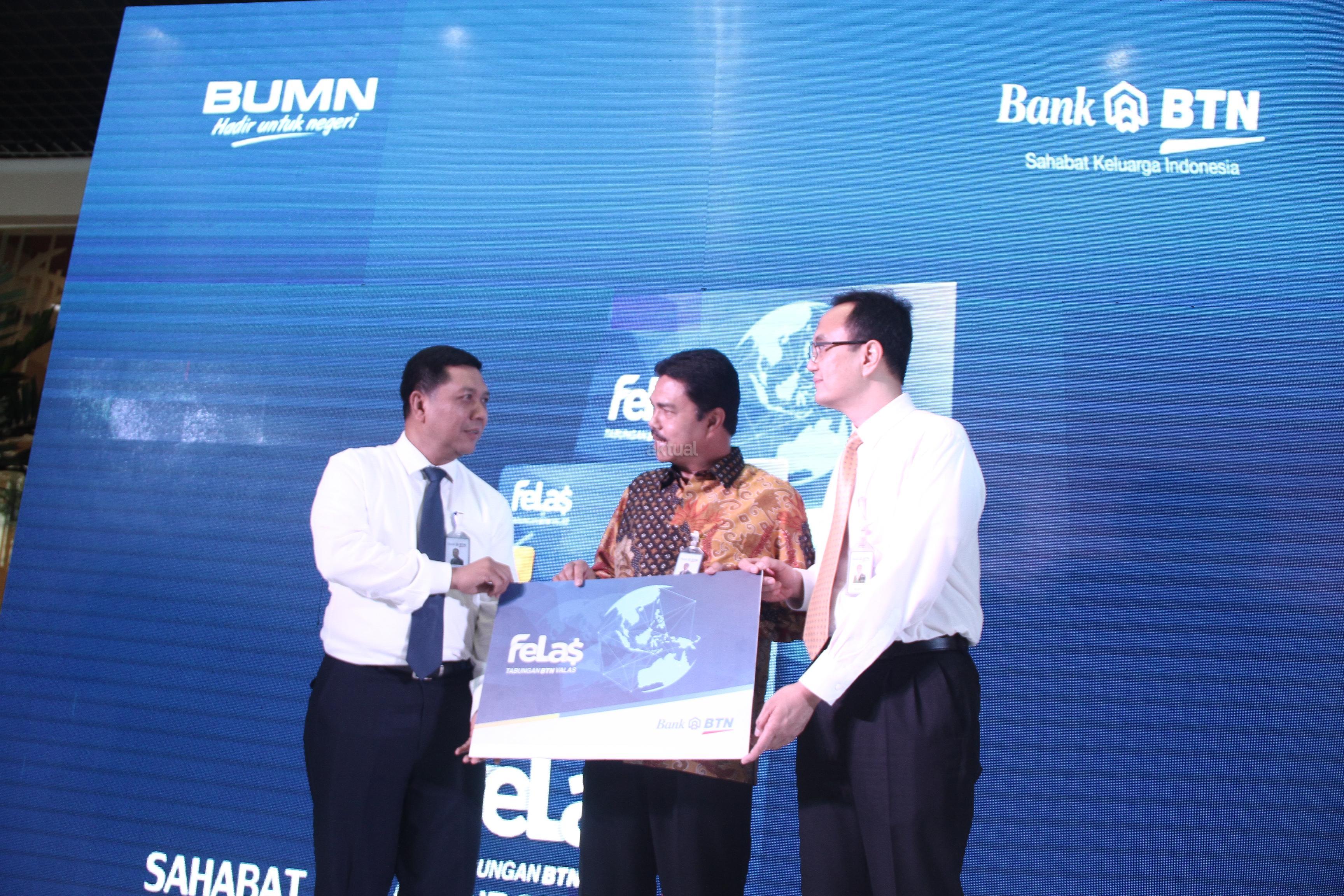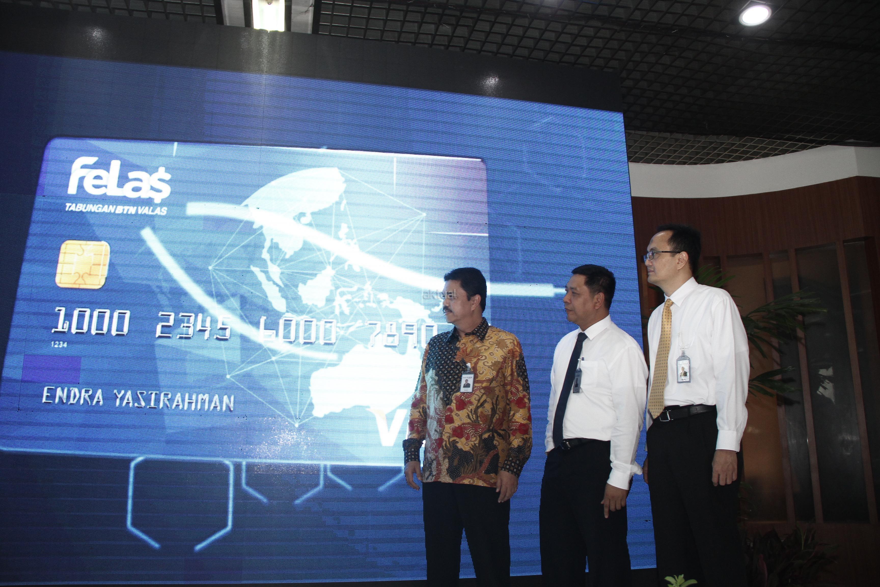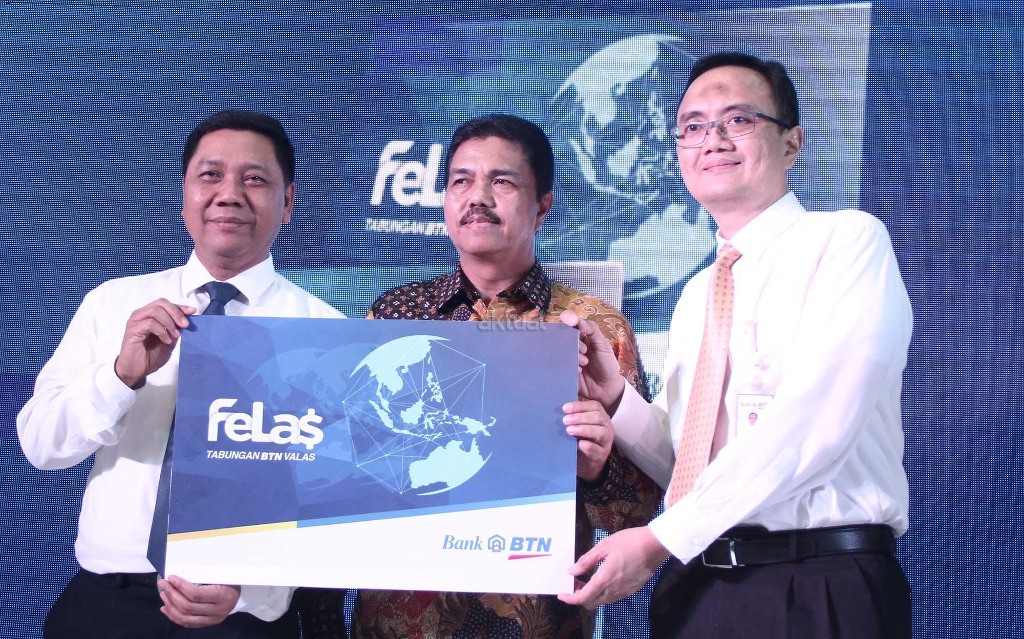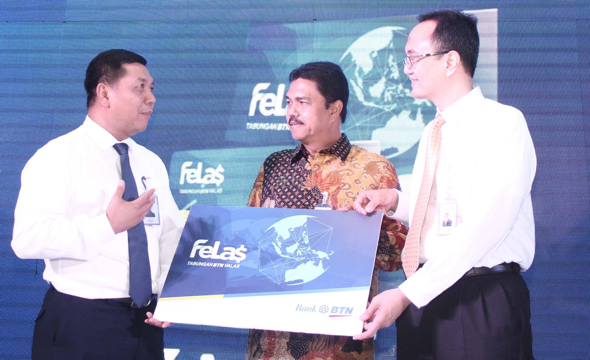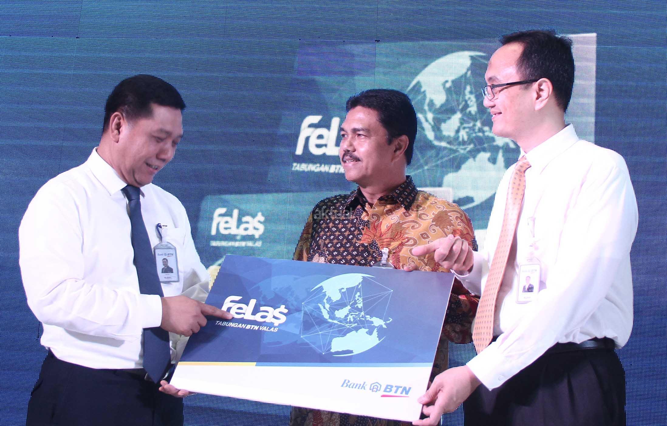 Direktur PT Bank Tabungan Negara (Persero) Tbk. Budi Satria (tengah) bersama Kepala Divisi Bank BTN Nasril (kiri) dan Adi Santoso (kanan) memegang mock-up buku Tabungan Felas usai peluncuran Tabungan Felas di Jakarta, Senin (4/6). Melalui produk tabungan valas anyar bertajuk Tabungan Felas tersebut, memungkinkan nasabah menabung dalam mata uang dolar Amerika (USD) dan dolar Singapura (SGD). BTN membidik dapat menggaet hampir 50.000 nasabah baru Tabungan Felas dalam 5 tahun pertama. Hingga April 2018, Bank BTN mencatatkan penghimpunan tabungan melesat di level 43,28% secara tahunan menjadi Rp43,04 triliun atau tumbuh dari Rp30,04 triliun pada bulan yang sama tahun lalu. AKTUAL/Eko S Hilman