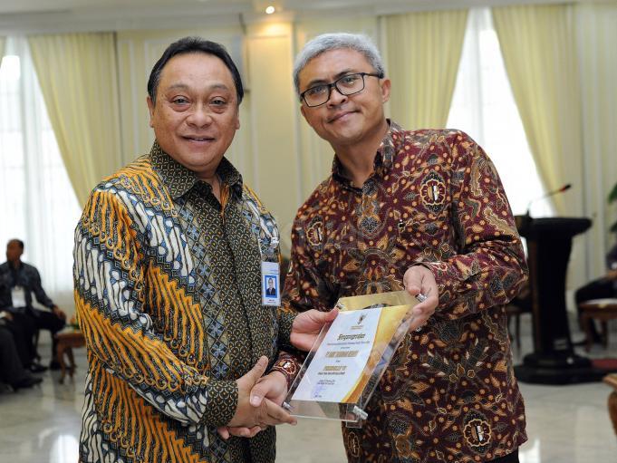 Ketua Komisi Informasi Pusat (KIP) John Fresly (kanan) memberikan penghargaan Badan Publik (BP) dan Keterbukaan Informasi Publik tahun 2016 kepada Direktur Utama PT Bank Tabungan Negara (BTN) Maryono (kiri) di Istana Wapres, Jakarta, Selasa (20/12). KIP memberikan penghargaan tahunan kepada pemerintah dan lembaga dalam rangka pemenuhan kebutuhan keterbukaan informasi publik yang transparan, akuntabel, dan melibatkan masyarakat di dalam pengambilan keputusan. ANTARA FOTO/Yudhi Mahatma/kye/16