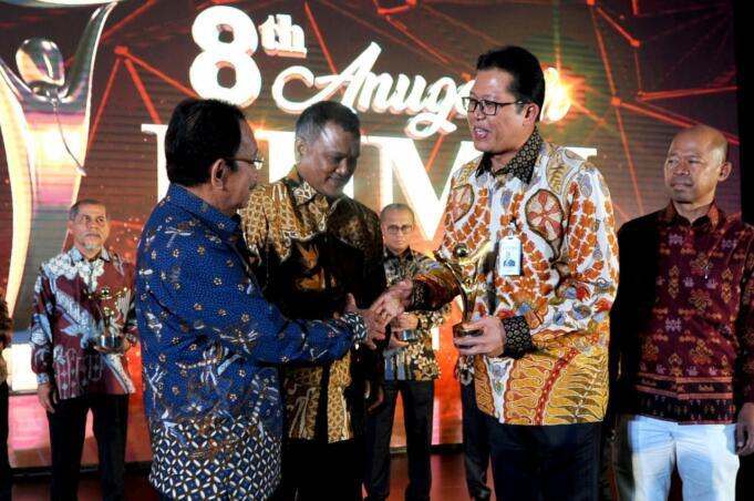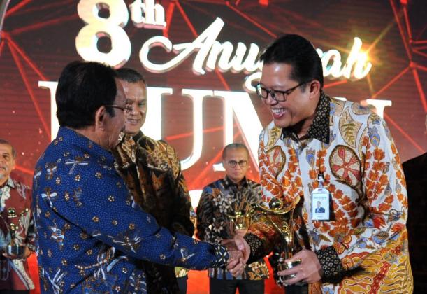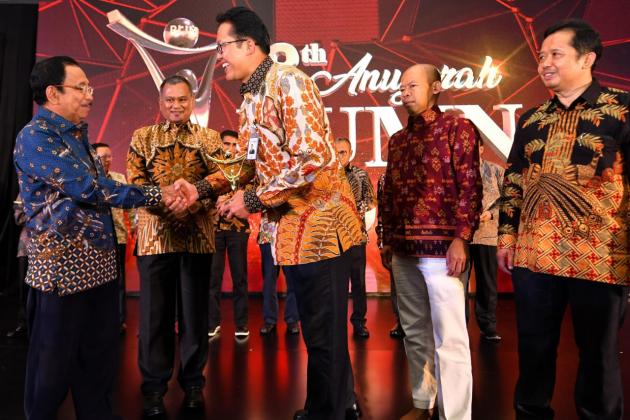 Ketua Dewan Juri Anugerah BUMN 2019 Tanri Abeng memberikan penghargaan kepada Direktur Strategic and Planning Bank BTN R Mahelan Prabantarikso saat acara Anugerah BUMN 2019, di Hotel Ritz Carlton, Jakarta, Kamis (28/3/2019) malam. Bank BTN ditetapkan sebagai BUMN Terbaik I untuk kategori Big Corporate Hubungan Stakeholder dan CEO BUMN Terbaik kategori Big Corporate Stakeholder Relationship BUMN terbaik 2019. AKTUAL/STR-Eko S Hilman