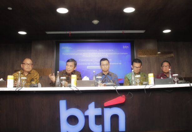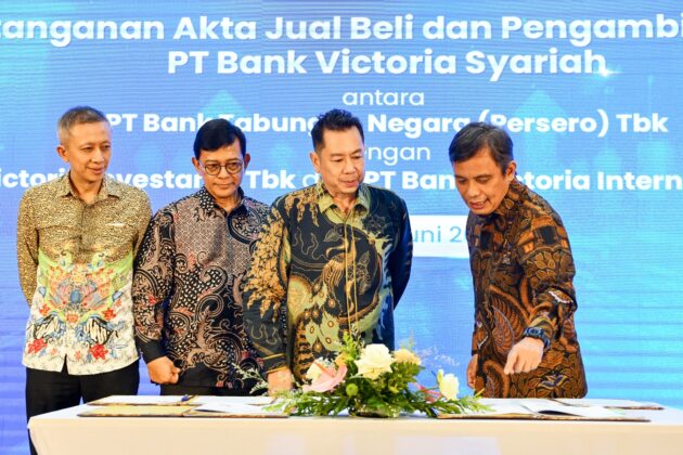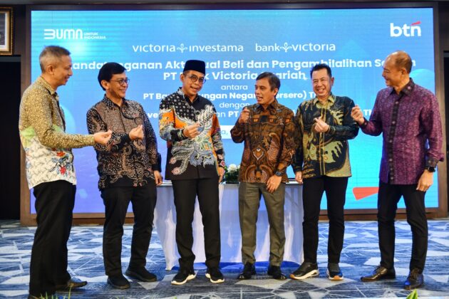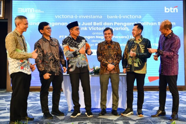 Direktur Utama BTN Nixon LP Napitupulu bersama Direktur Utama PT Bank Victoria International Tbk (BVIC) Achmad Friscantono, Wakil Direktur Utama BVIC Rusli, dan Direktur Utama PT Victoria Investama Tbk (VICO) Aldo Jusuf Tjahaja usai Penandatanganan Akta Jual Beli dan Pengambilalihan Saham PT Bank Victoria Syariah (BVIS) disaksikan Komisaris Utama VICO Untung Woenardi serta Komisaris Utama BTN Suryo Utomo di Jakarta Kamis, (5/6/2025).