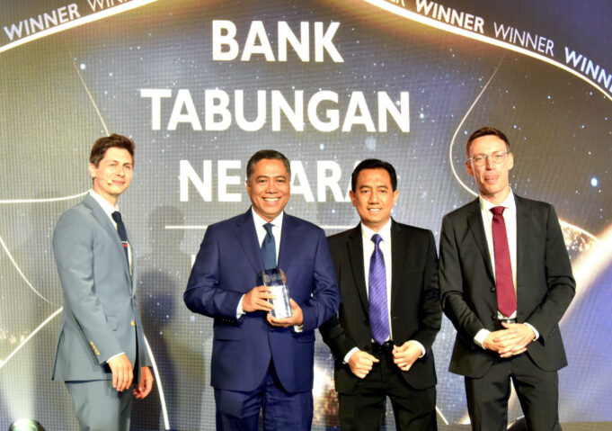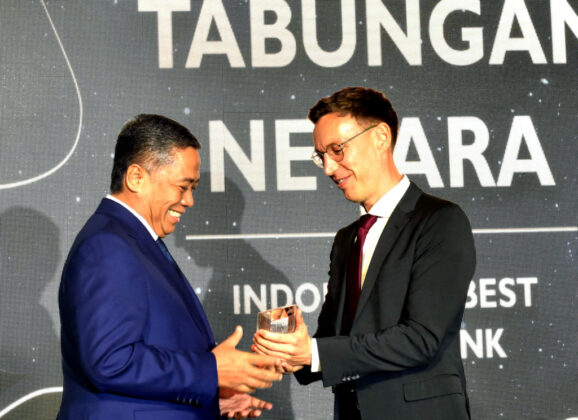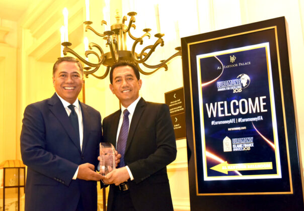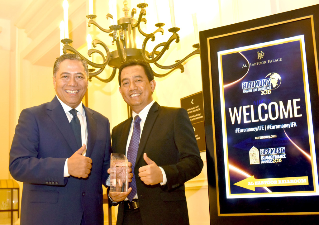 Direktur Consumer Banking PT Bank Tabungan Negara (Persero) Tbk, Hirwandi Gafar (kiri) menerima penghargaan dari Head of Middle East and Africa Euromoney Patrick Cooke (kanan) saat acara Euromoney Islamic Finance Awards di Dubai, Selasa (21/5).