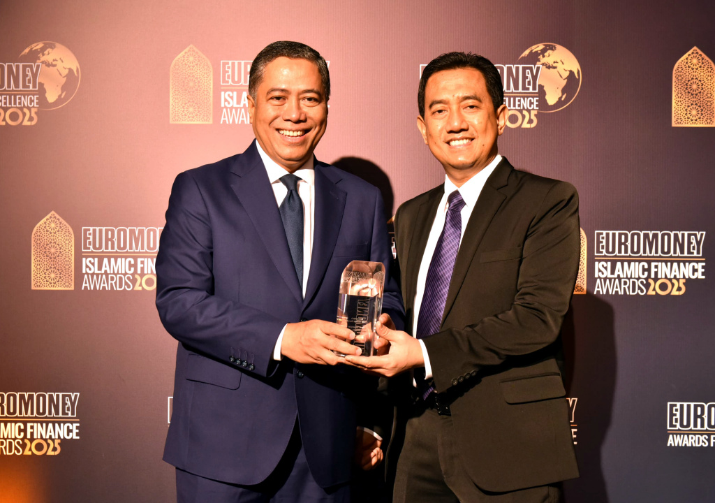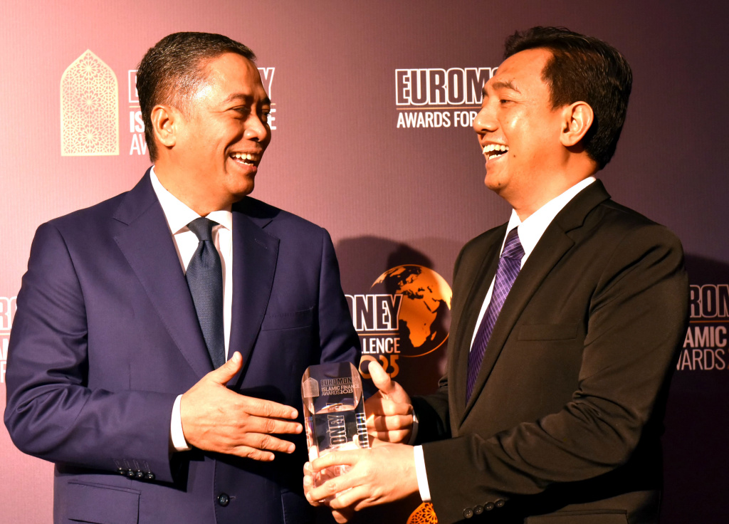 Direktur Consumer Banking PT Bank Tabungan Negara (Persero) Tbk, Hirwandi Gafar (kiri) bersama Kepala Divisi Syariah BTN Abdul Firman memegang penghargaan Best Islamic Bank-Indonesia 2025 dari Euromoney Islamic Finance Awards di Dubai, Selasa (21/5).