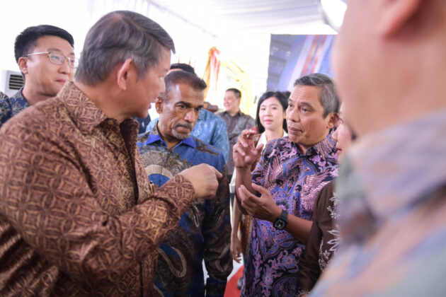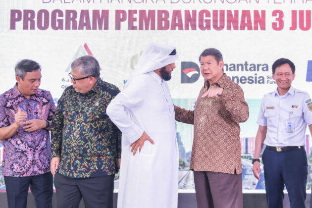 Ketua Satgas Perumahan Hashim Djojohadikusumo (kedua kanan), berbincang dengan Chairman AlQilaa International Group sekaligus Perwakilan Kerajaan Qatar Sheikh Abdulaziz bin Abdulrahman Al Thani (tengah) disaksikan Direktur Utama PT Bank Tabungan Negara (Persero) Tbk Nixon LP Napitupulu (kanan), usai Pencanangan Pra Kerja Sama Dalam Rangka Dukungan Terhadap PSN Program Pembangunan 3 Juta Rumah di Kampung Bandan, Jakarta Utara, Rabu (17/9).
