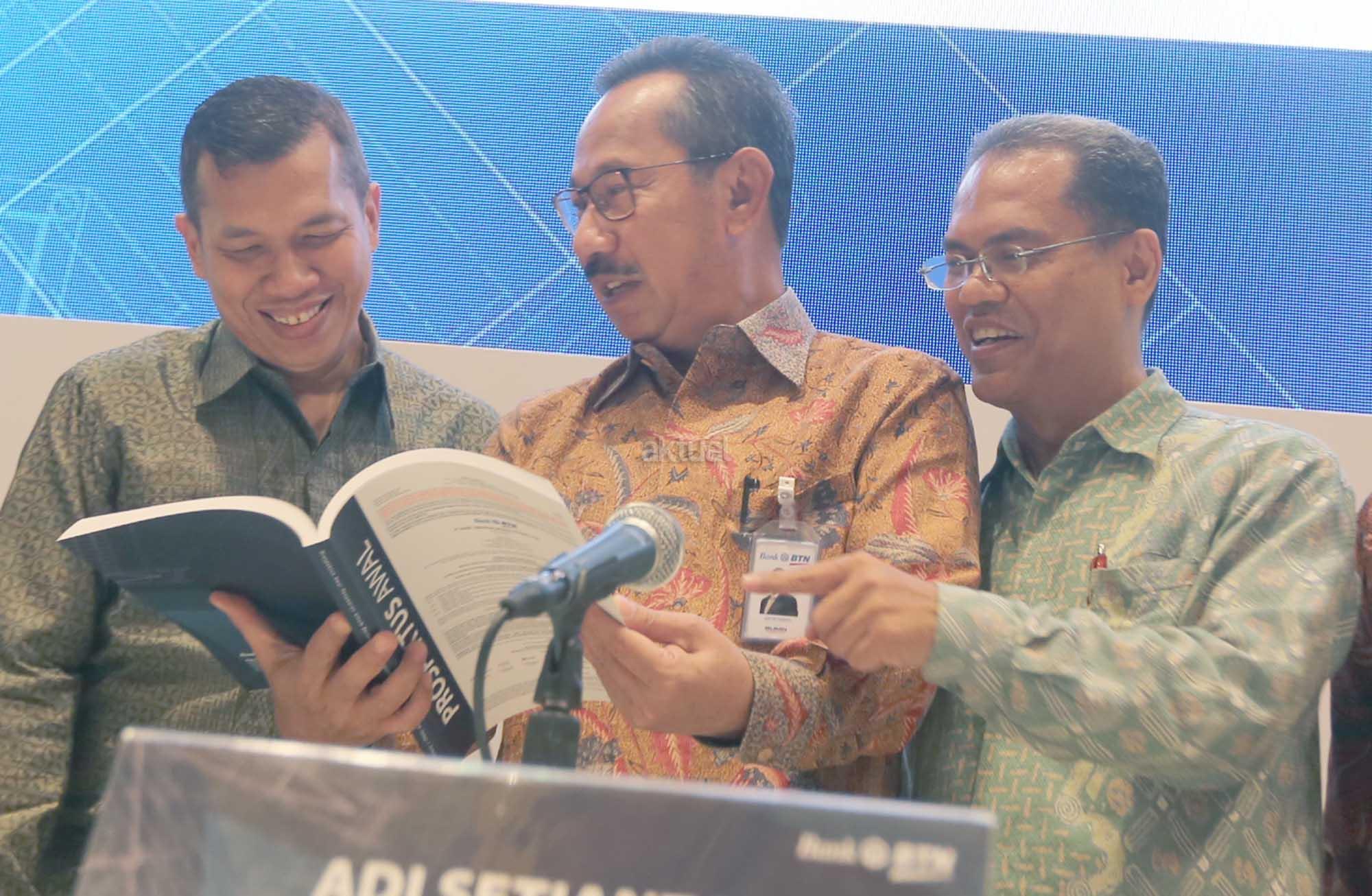 Direktur PT Bank Tabungan Negara (Persero) Tbk. Adi Setianto (tengah) didampingi Head of Investment Banking PT Indopremier Sekuritas Rayendra Tobing, Head of Investment Banking PT BNI Sekuritas Indonesia Tulus Nababan, dalam Penawaran Umum Berkelanjutan Obligasi Berkelanjutan III Bank BTN Tahap I Tahun 2017 senilai Rp5 triliun di Jakarta, Selasa (13/6). Adapun, instrumen ini akan diterbitkan dalam 4 seri, yakni Seri A bertenor 3 tahun dengan kupon berkisar 7,65%-8,3%%, Seri B bertenor 5 tahun dengan kupon sekitar 7,95%-8,5%, Seri C bertenor 7 tahun dengan bunga 8,2%-8,7%, dan Seri D bertenor 10 tahun dengan kupon sebesar 8,3%-8,9%. Adi mengatakan seluruh dana yang diperoleh dari hasil emisi obligasi ini akan digunakan untuk mendanai ekspansi kredit Bank BTN yang masih prospektif, sekaligus dalam rangka mendukung Program Sejuta Rumah. AKTUAL/Eko S Hilman