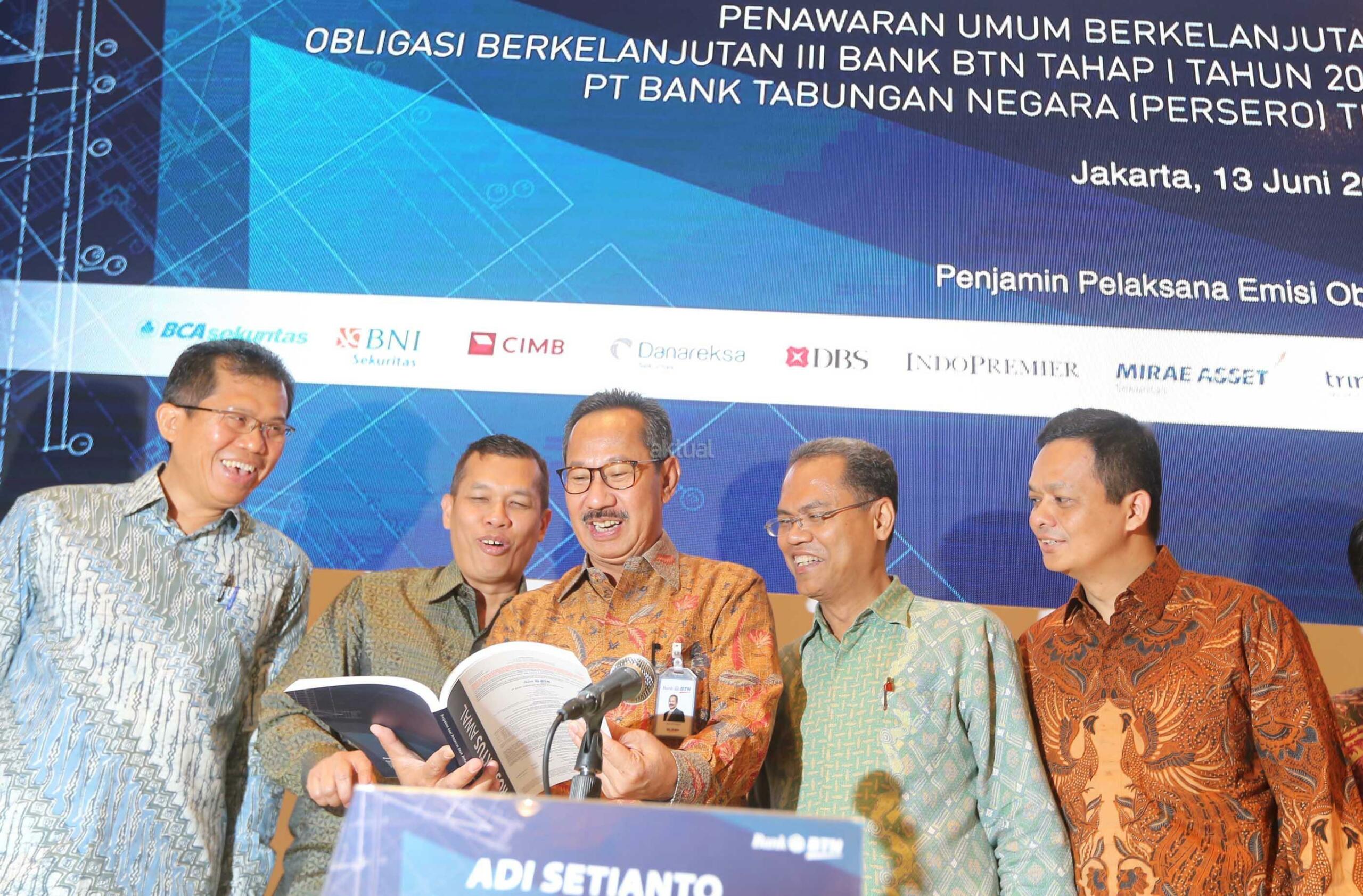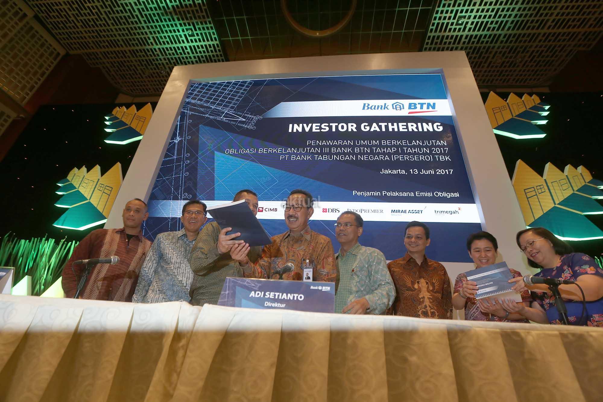 Direktur PT Bank Tabungan Negara (Persero) Tbk Adi Setianto (keempat dari kiri) didampingi Associate Director-Head of Investment Banking PT Mirae Asset Securities Mukti Wibowo, Direktur PT CIMB Sekuritas Indonesia I Wayan Gemuh Kertaraharja, Head of Investment Banking PT Indopremier Sekuritas Rayendra Tobing, Head of Investment Banking PT BNI Sekuritas Indonesia Tulus Nababan, Direktur PT Danareksa Sekuritas Budi Susanto, Direktur PT DBS Vickers Sekuritas Indonesia Tjeng Susanty Wijaya, dan Head of Corporate Finance PT BCA Sekuritas Isna Christie Rambitan saat Penawaran Umum Berkelanjutan Obligasi Berkelanjutan III Bank BTN Tahap I Tahun 2017 senilai Rp5 triliun di Jakarta, Selasa (13/6). Adapun, instrumen ini akan diterbitkan dalam 4 seri, yakni Seri A bertenor 3 tahun dengan kupon berkisar 7,65%-8,3%%, Seri B bertenor 5 tahun dengan kupon sekitar 7,95%-8,5%, Seri C bertenor 7 tahun dengan bunga 8,2%-8,7%, dan Seri D bertenor 10 tahun dengan kupon sebesar 8,3%-8,9%. Adi mengatakan seluruh dana yang diperoleh dari hasil emisi obligasi ini akan digunakan untuk mendanai ekspansi kredit Bank BTN yang masih prospektif, sekaligus dalam rangka mendukung Program Sejuta Rumah. AKTUAL/Eko S Hilman