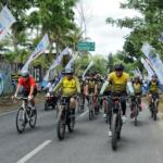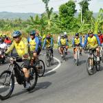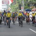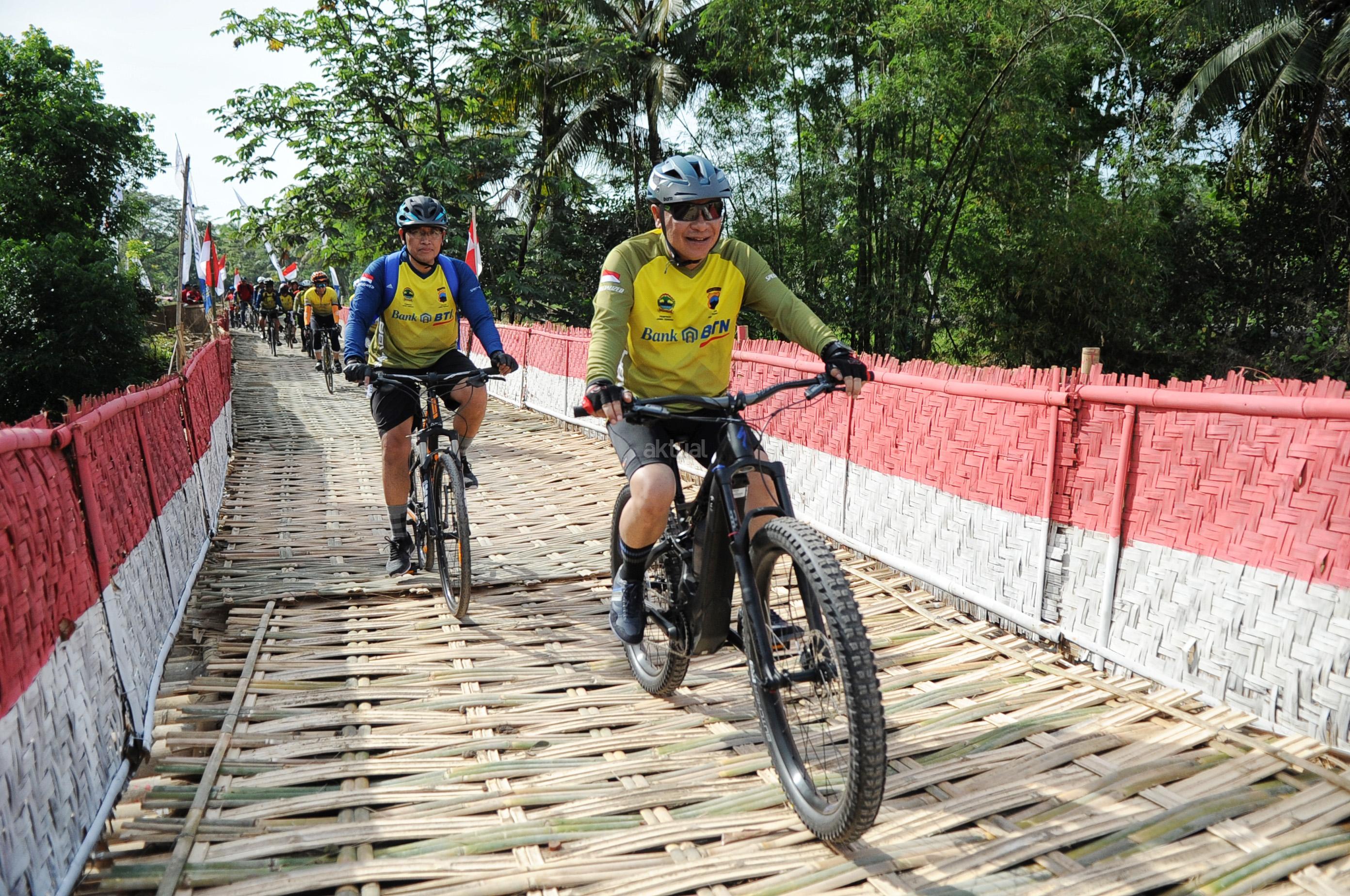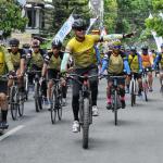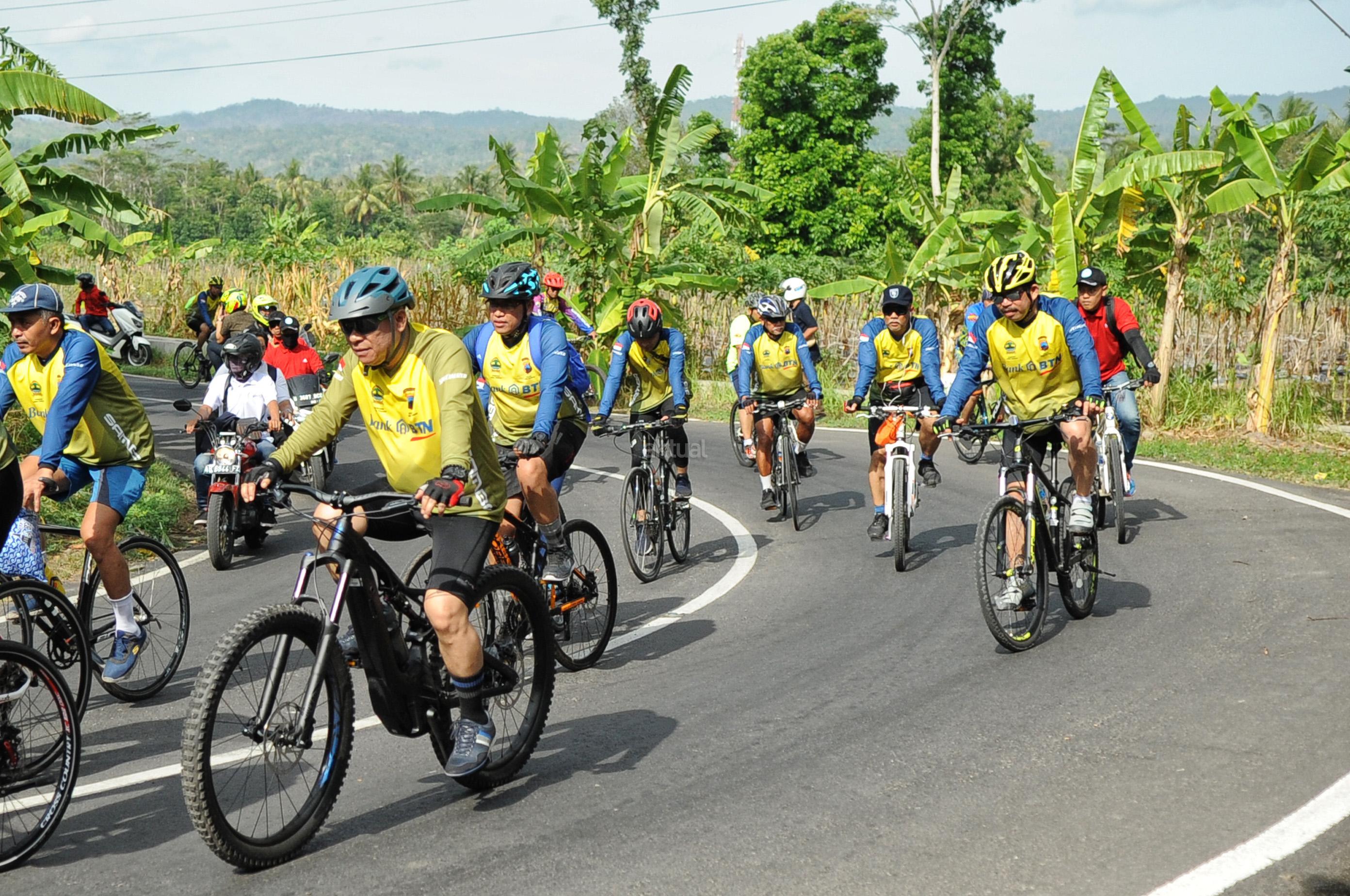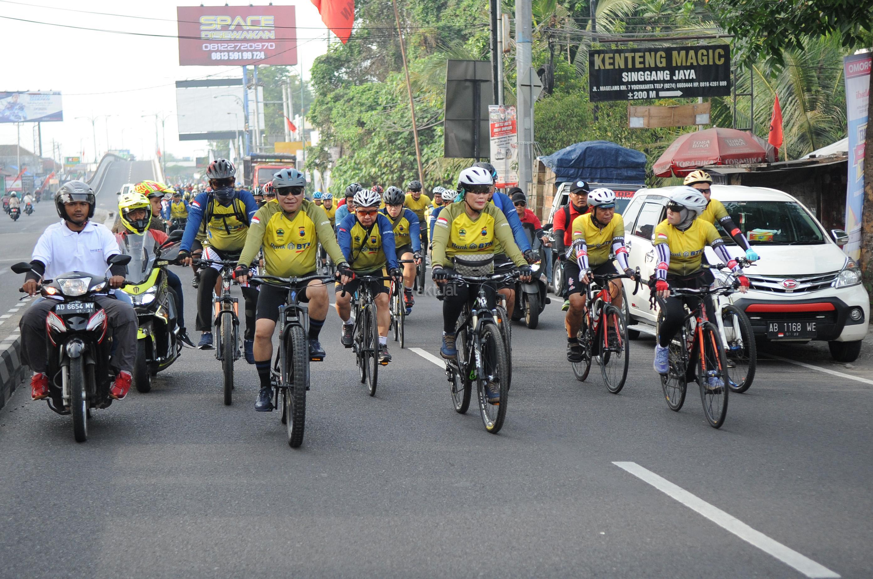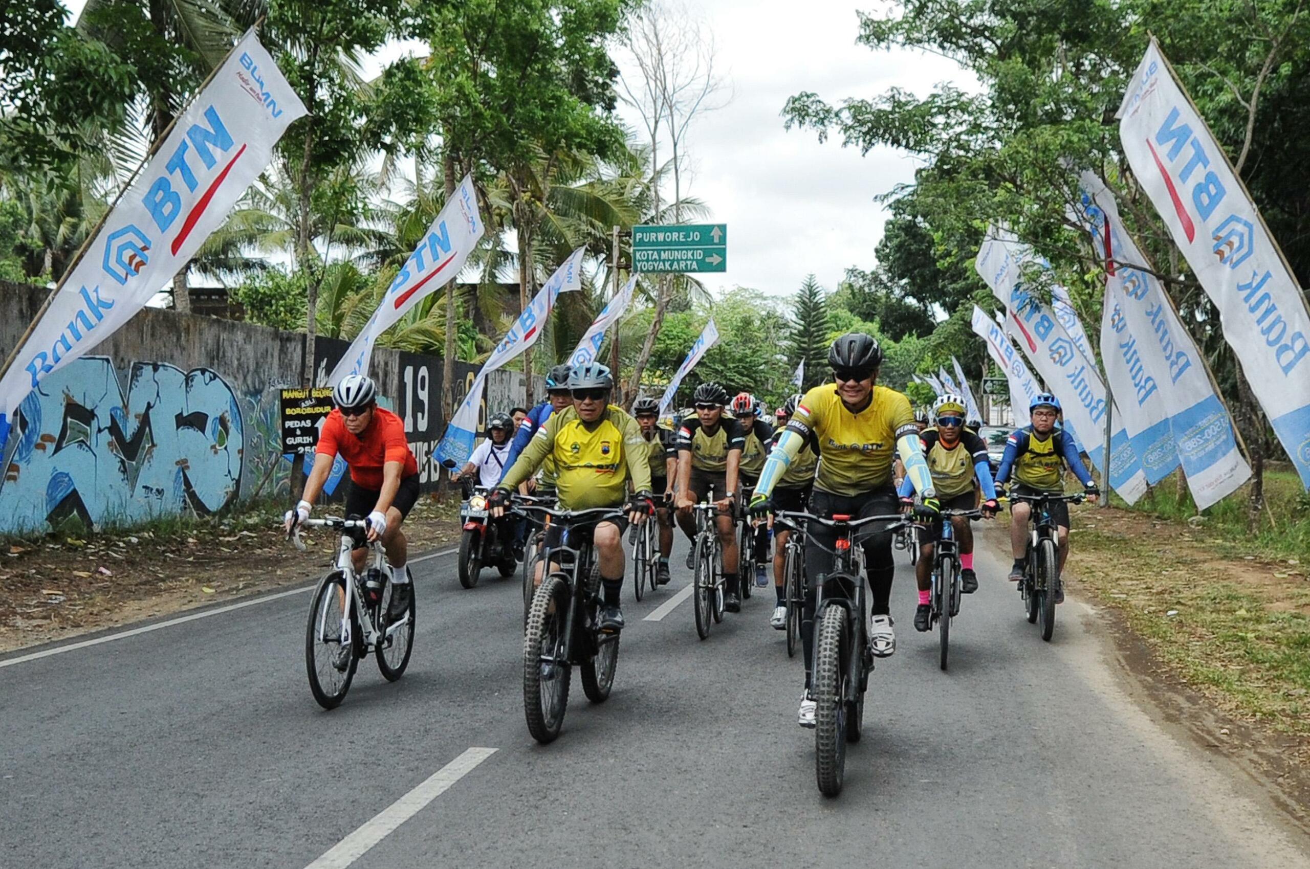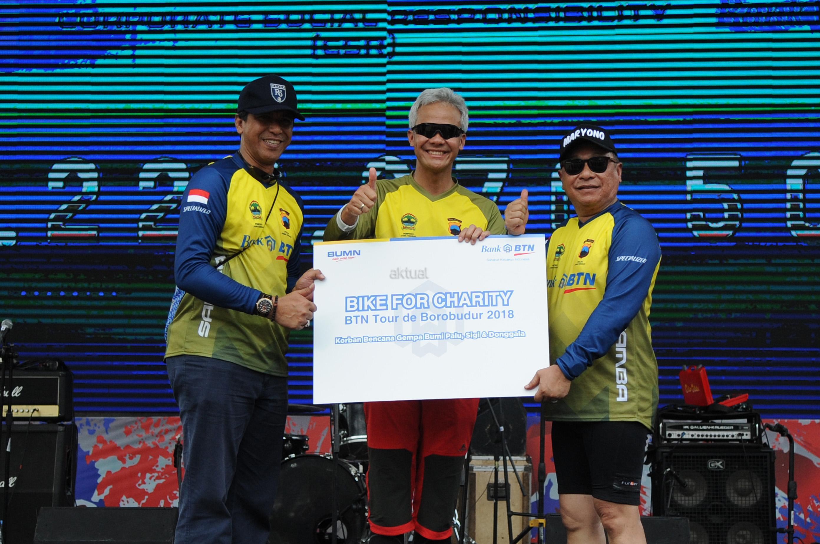 Direktur Utama Bank BTN Maryono bersama Gubernur Jawa Tengah Ganjar Pranowo ikut serta dalam memeriahkan BTN Tour de Borobudur 2018 di depan hotel Sahid Rich Yogyakarta, Minggu (4/11). Rombongan pesepeda akan bergerak menuju candi Borobudur yang merupakan finish dari etape kedua BTN Tour de Borobudur 2018 yang berlangsung sejak Sabtu (3/11) dengan total jarak seluruh etape lebih dari 200 KM. Sebelum finish di candi Borobudur para peserta gowes sempat melintasi Balai Ekonomi Desa (Balkondes) yang dibangun Bank BTN sebagai bentuk dukungan kepada pemerintah dalam pengembangan industri rakyat dibawah koordinasi Kementrian BUMN. Balkondes tersebut merupakan pitstop terakhir untuk kemudian peserta gowes mengakhiri di halaman candi Borobudur sebagai puncak dari seluruh etape yang disiapkan dalam rangka BTN Tour de Borobudur 2018. Di akhir acara para pesepeda berhasil mengumpulkan dana sebesar Rp229.370.500 sebagai sumbangan yang akan diserahkan untuk korban musibah gempa di Palu,Donggala dan Sigi. AKTUAL/Eko S Hilman