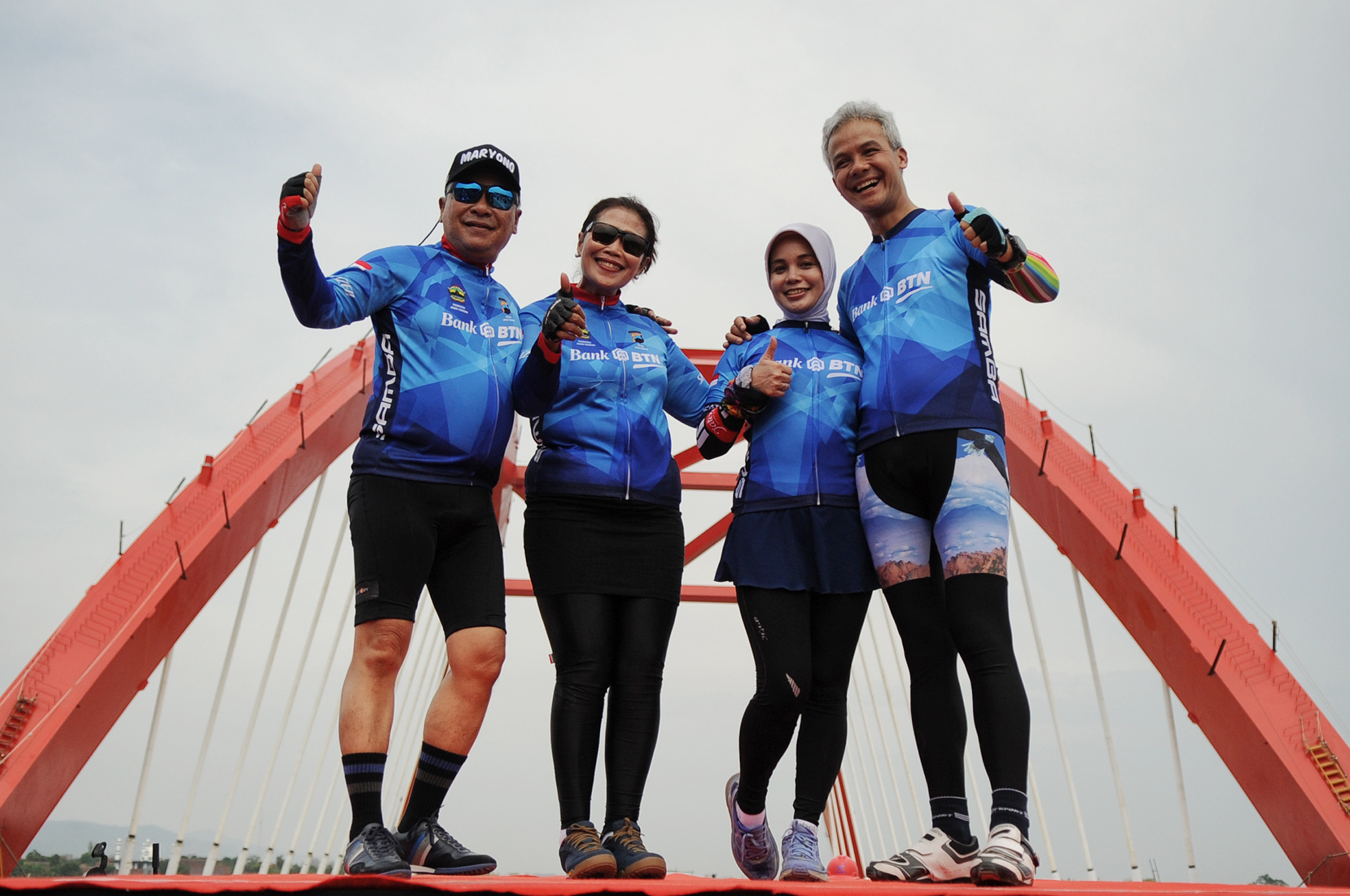Direktur Utama Bank BTN Maryono bersama Gubernur Jawa Tengah Ganjar Pranowo beserta istri bergabung bersama usai melepas lebih dari 2.000 pesepeda yang ikut serta dalam memeriahkan BTN Tour de Borobudur 2018 di halaman Balai Kota Semarang, Sabtu (3/11). Beberapa pesepeda dari Jerman, Jepang, Australia, Belanda, dan Prancis tampak turut mengayuh sepedanya yang akan mengambil rute sejauh 200 KM dari kota Semarang dan dijadwalkan berakhir di candi Borobudur pada Minggu 4/11. BTN Tour de Borobudur 2018 juga diwarnai kegiatan sosial penanaman 10.000 pohon trembesi di sepanjang jalan tol Bawean yang menghubungkan Kabupaten Batang dan Kabupaten Kendal sepanjang 75 KM. AKTUAL/POOL