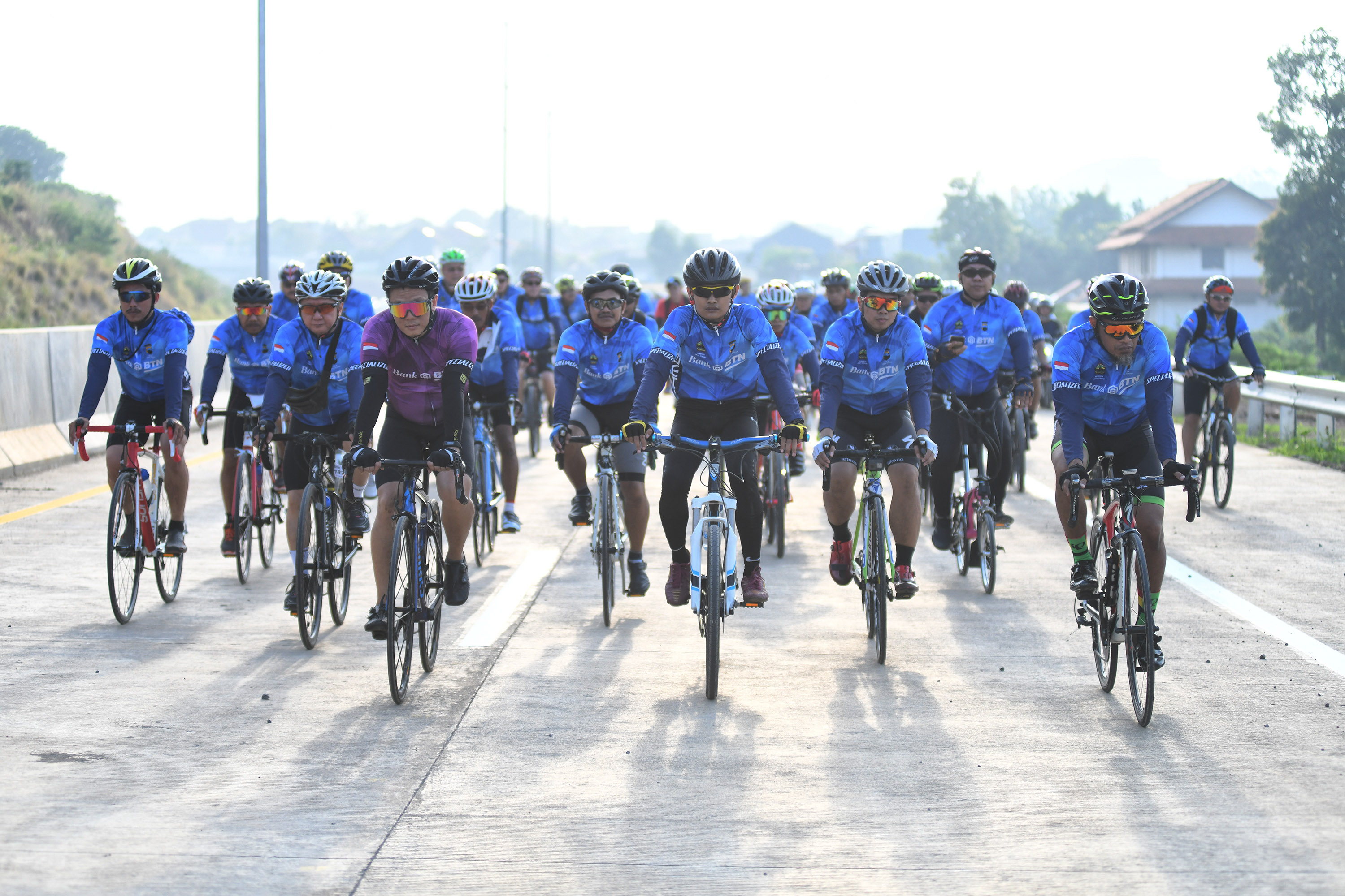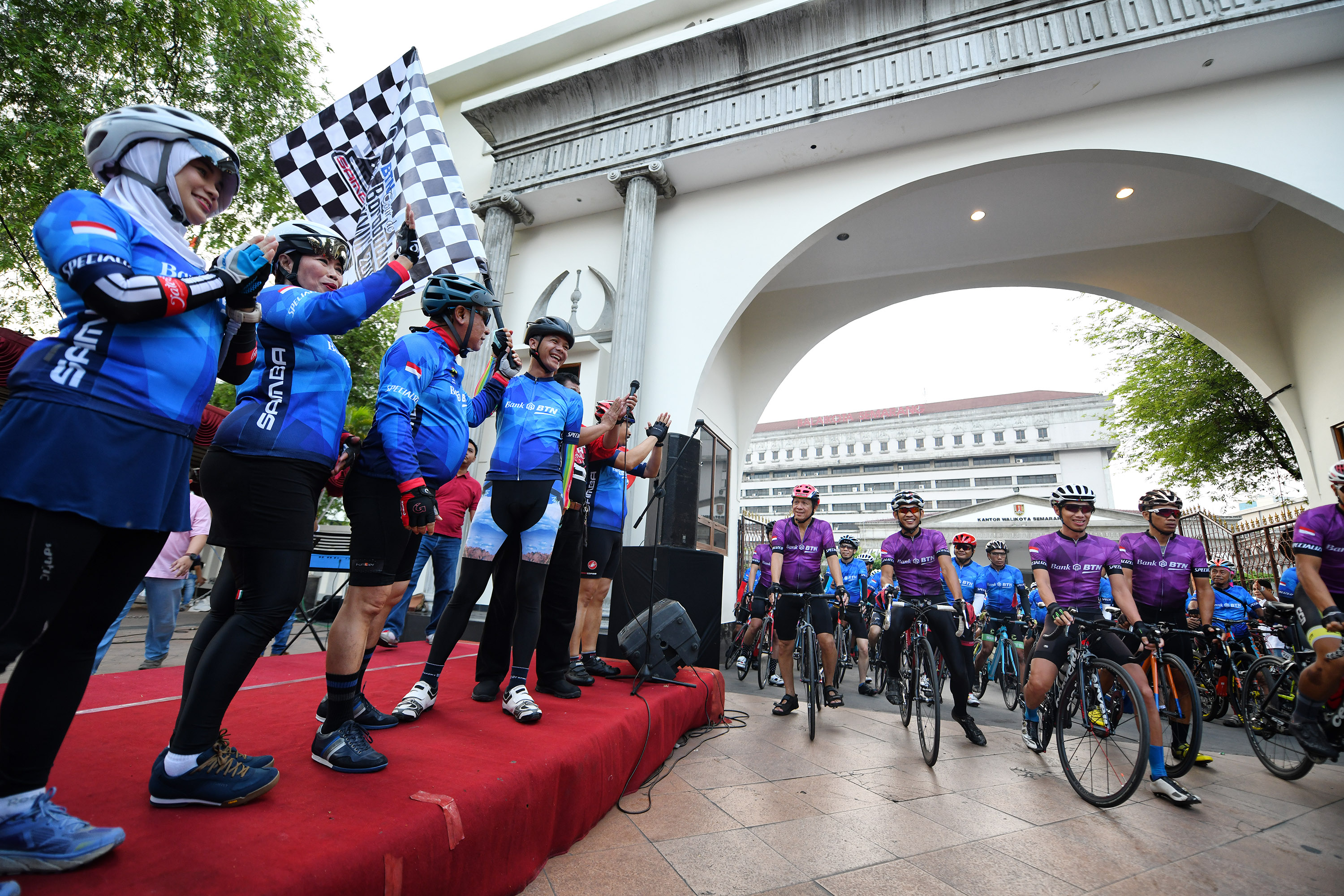 Direktur Utama Bank BTN Maryono bersama Gubernur Jawa Tengah Ganjar Pranowo usai melepas lebih dari 2.000 pesepeda yang ikut serta dalam memeriahkan BTN Tour de Borobudur 2018 di halaman Balai Kota Semarang, Sabtu (3/11). Beberapa pesepeda dari Jerman, Jepang, Australia, Belanda, dan Prancis tampak turut mengayuh sepedanya yang akan mengambil rute sejauh 200 KM dari kota Semarang dan dijadwalkan berakhir di candi Borobudur pada Minggu 4/11. BTN Tour de Borobudur 2018 juga diwarnai kegiatan sosial penanaman 10.000 pohon trembesi di sepanjang jalan tol Bawean yang menghubungkan Kabupaten Batang dan Kabupaten Kendal sepanjang 75 KM. AKTUAL/POOL