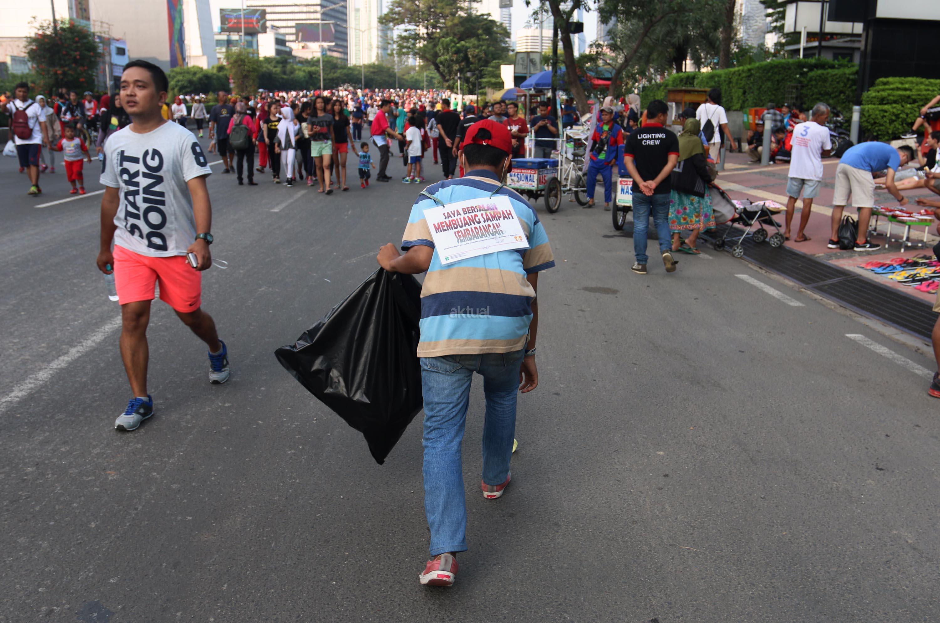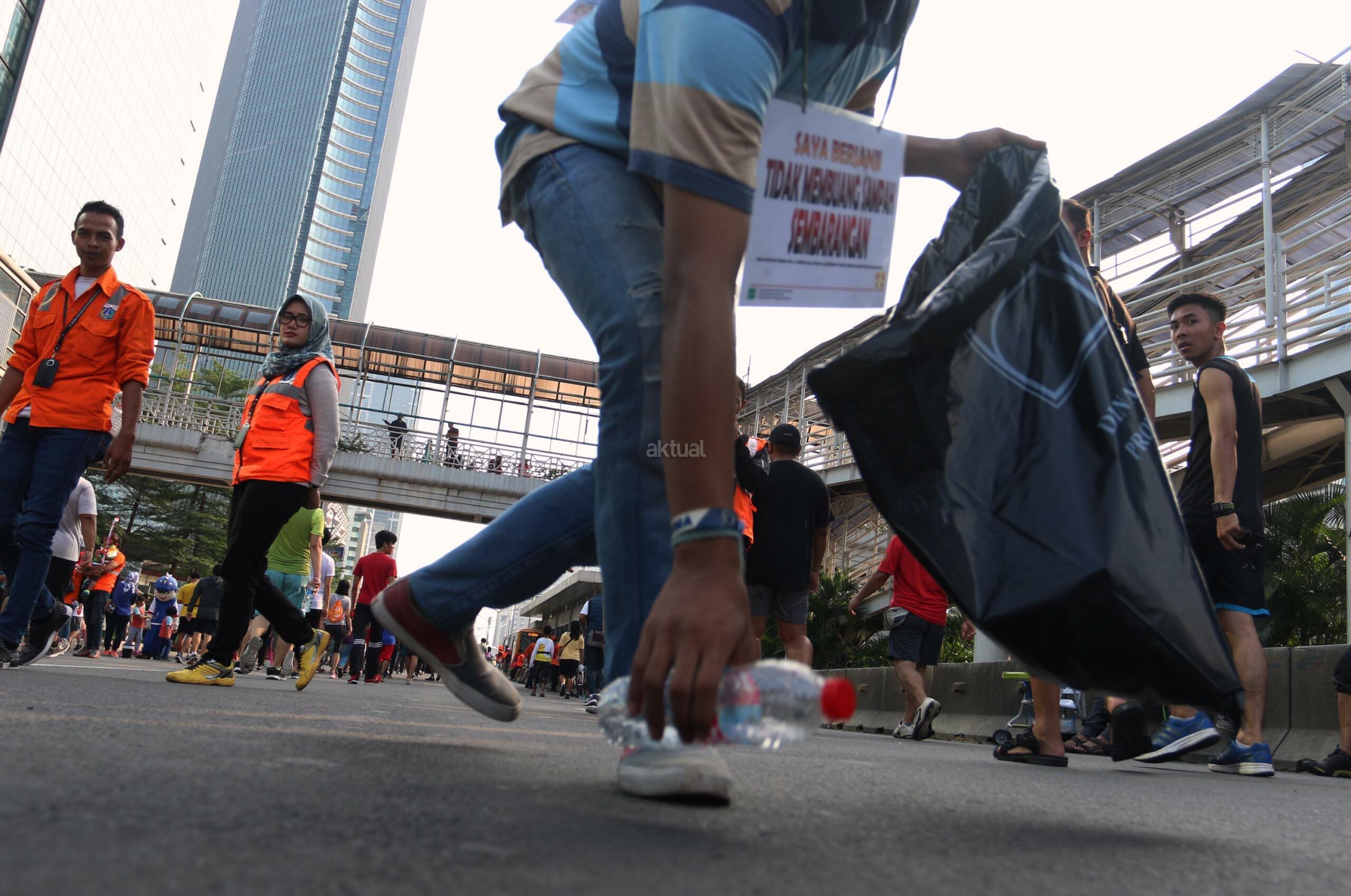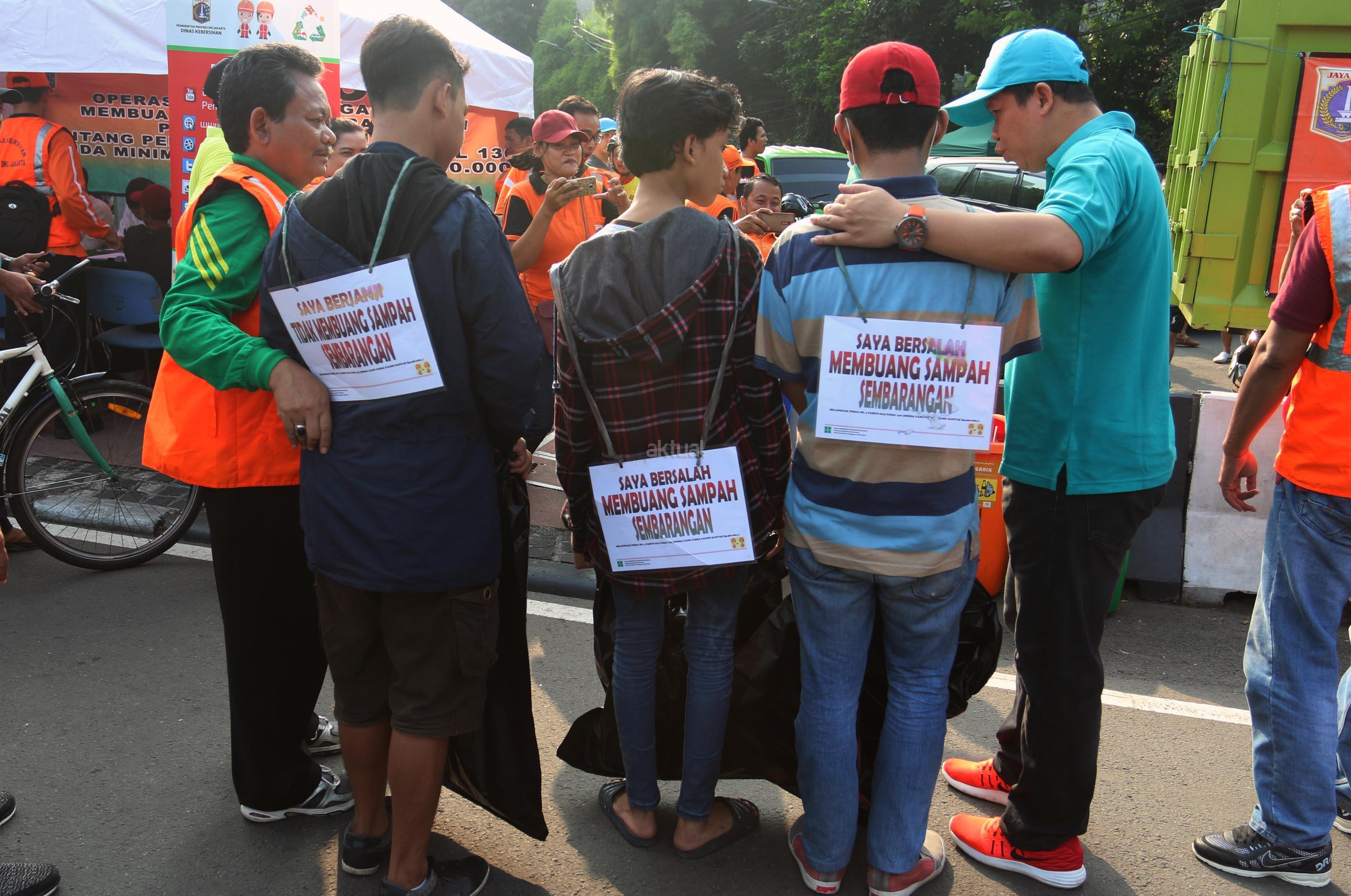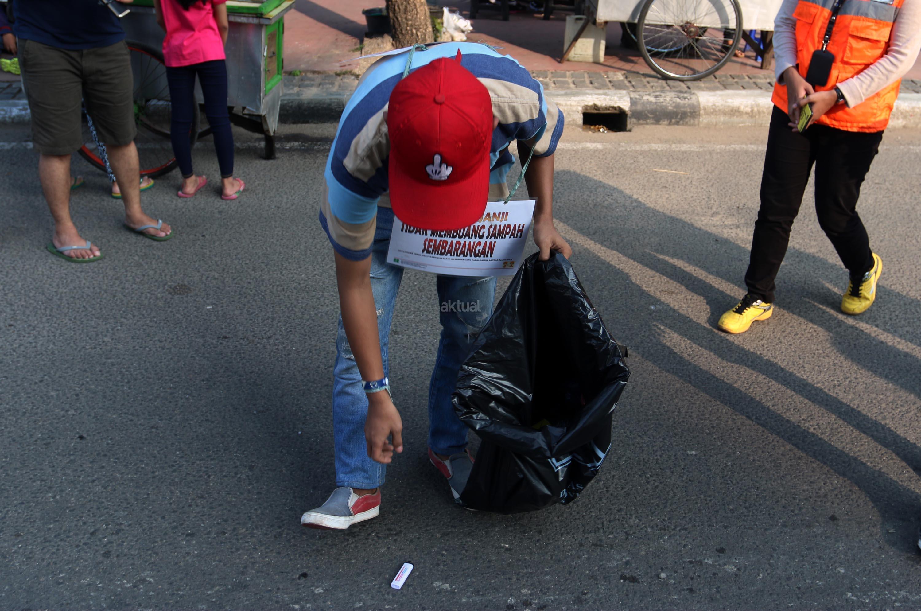 Seorang pengunjung dikenakan sanksi memunguti sampah arena di kawasan car free day (CFD) , Jakarta, Minggu (9/7/2017). Sejumlah pengunjung terjaring operasi tangkap tangan (OTT) karena membuang sampah sembarang di arena CFD. AKTUAL/Munzir