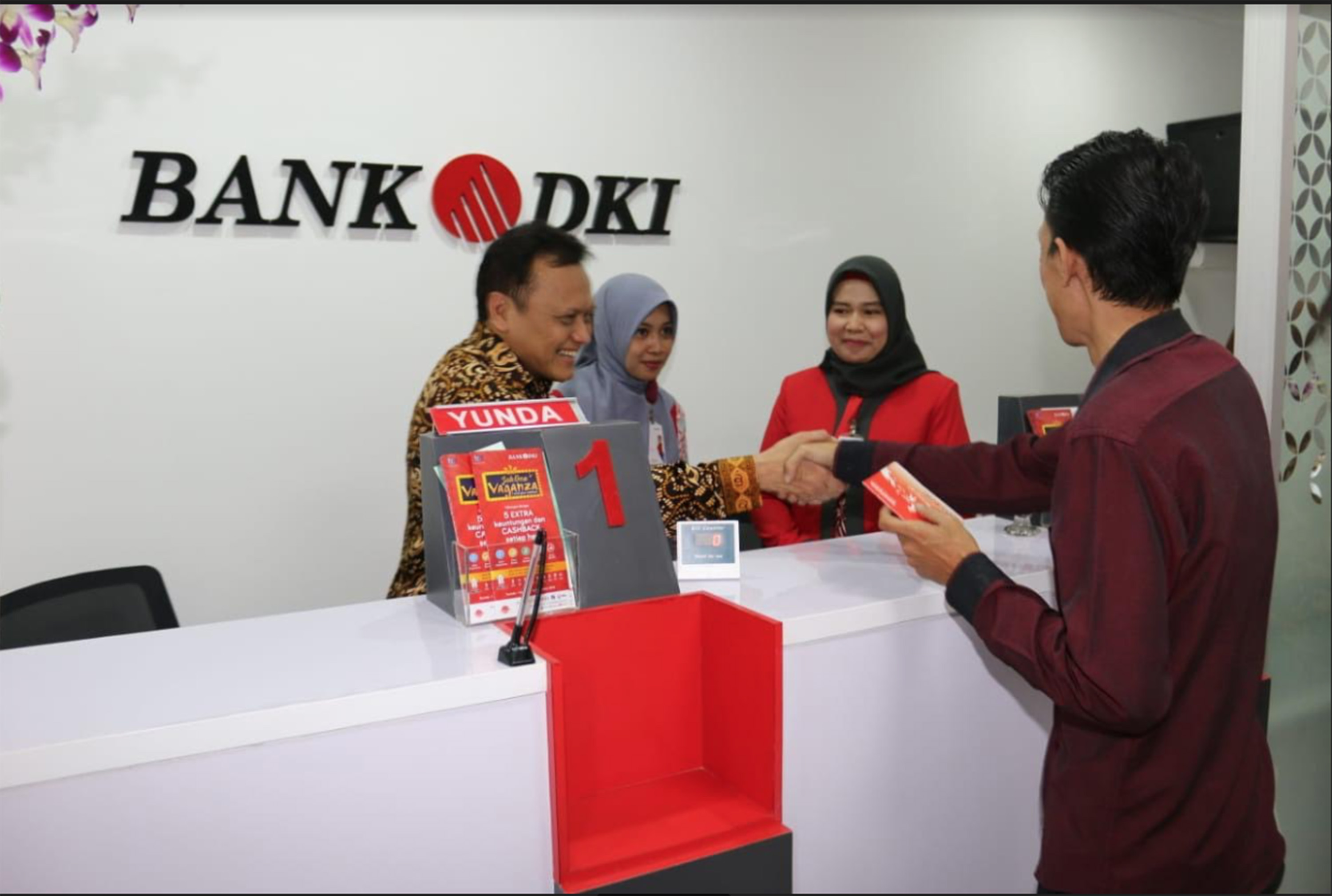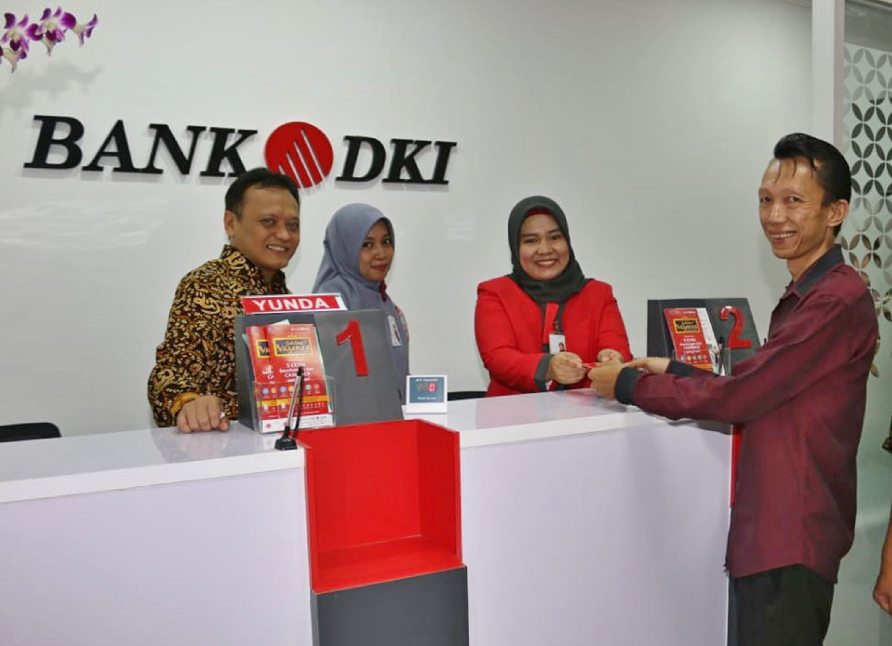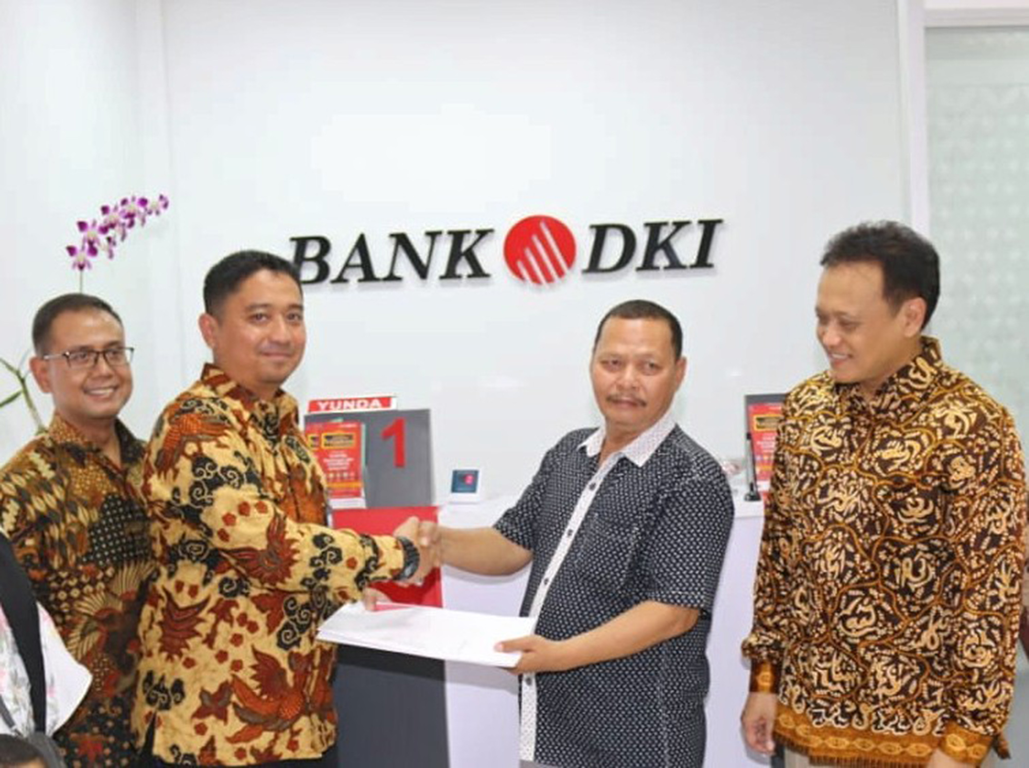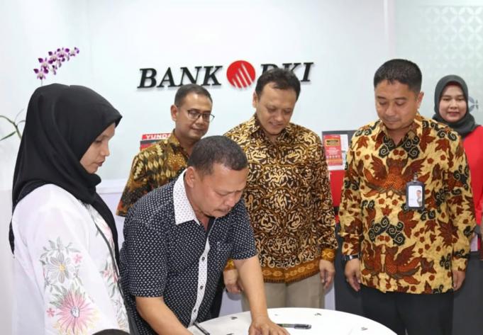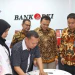 Direktur Teknologi & Operasional Bank DKI, Priagung Suprapto (kedua kanan) menyaksikan penandatanganan perjanjian kredit usai meresmikan pembukaan Kantor Kas Bank DKI, Pasar Baru, Bantar Gebang, Bekasi, Jawa Barat, Kamis (30/8). Pada saat bersamaan, Bank DKI juga melakukan pembukaan Kantor Kas ITC Depok, Kantor Kas PGC Cililitan dan Kantor Kas Pasar Kranggan Mas. Dalam upaya meningkatkan kemudahan warga DKI Jakarta dalam pembayaran pajak daerah, Bank DKI memberikan layanan pembayaran Pajak Bumi & Bangunan/PBB-P2 DKI Jakarta melalui aplikasi layanan keuangan JakOne Mobile. Selain menerima pembayaran PBB, Bank DKI juga dapat menerima pembayaran Pajak Kendaraan Bermotor (PKB) tahunan DKI Jakarta kapan dan dimana saja melalui JakOne Mobile.  AKTUAL/Pool Bank DKI