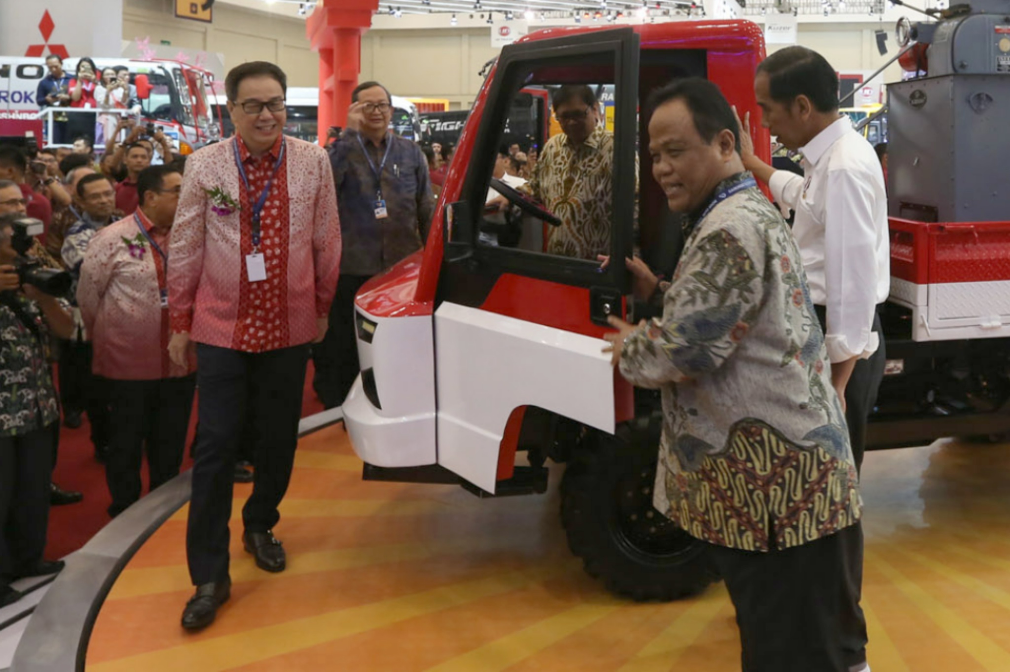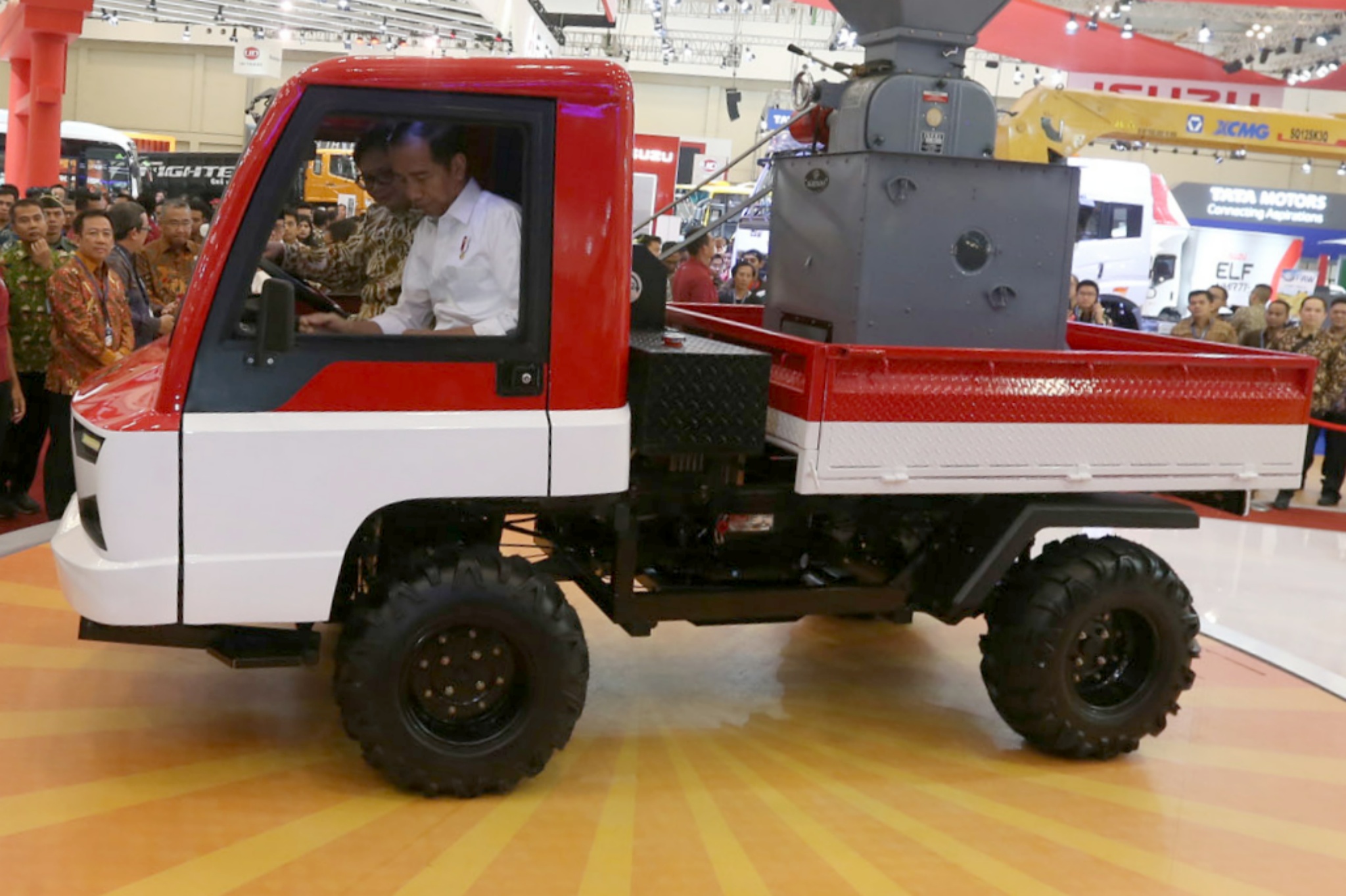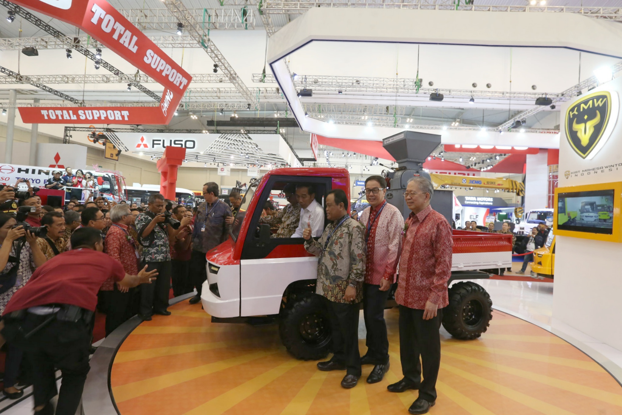 Presiden Joko Widodo, Menperin Airlangga Hartarto, Presiden Direktur PT Astra International Tbk Prijono Sugiarto dan Ketua Umum Gaikindo Yohannes Nangoi saat meninjau Alat Mekanisme Multiguna Pedesaan (AMMDes) saat peluncuran serta pembukaann Gaikindo Indonesia International Auto Show (GIIAS) 2018 di ICE BSD, Tangsel, Kamis (2/8). Presiden Jokowi menjajal mobil pedesaan yang dirakit oleh PT Kiat Mahesa Wintor Indonesia (KMWI) dan PT Kiat Mahesa Wintor Distributor (KMWD. Ada 40 kendaraan baru dan konsep yang akan dirilis dalam pameran otomotif berskala International, GIIAS 2018 mengsung tema ” Beyond Mobility”. AKTUAL/Eko S Hilman