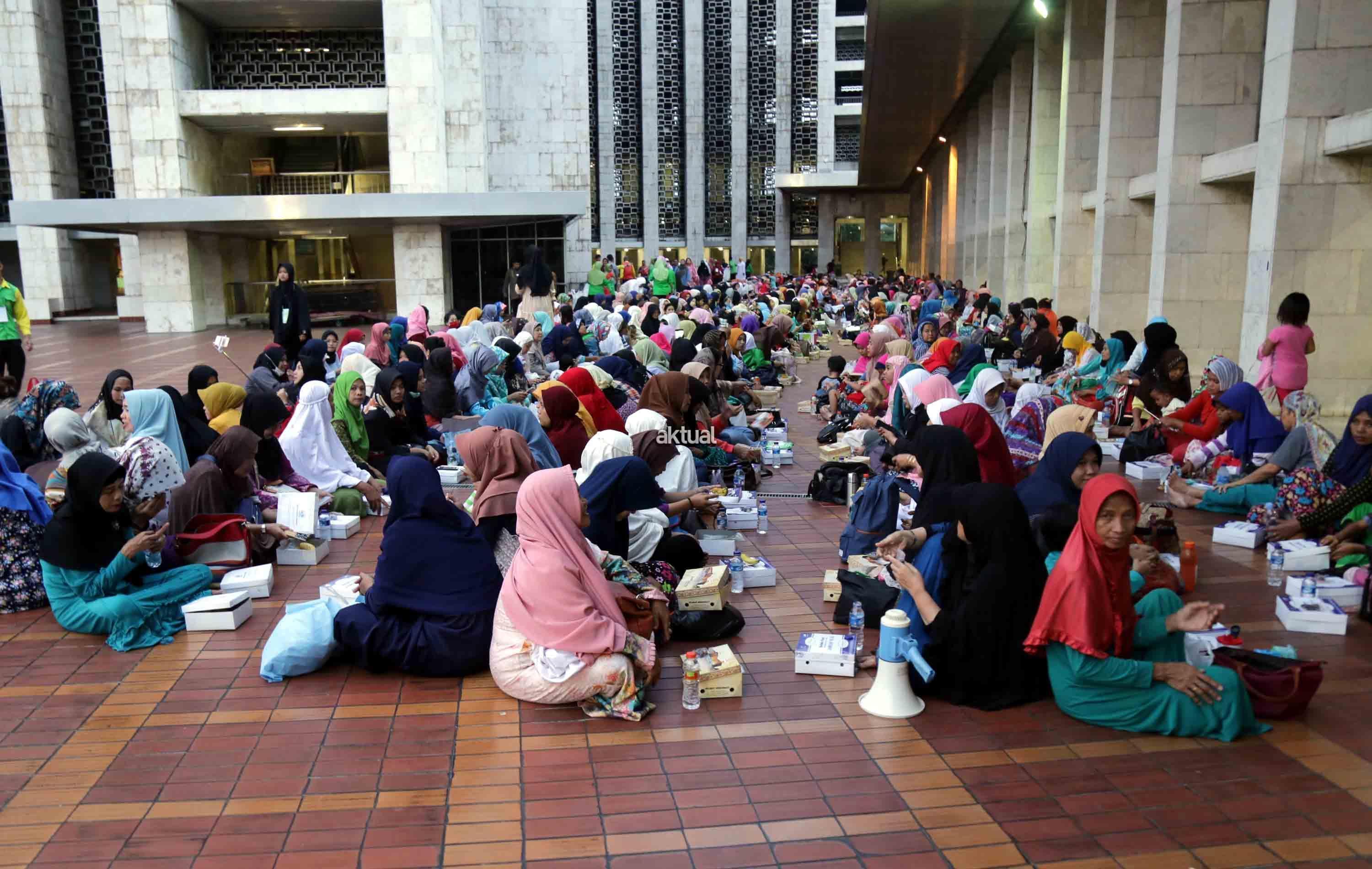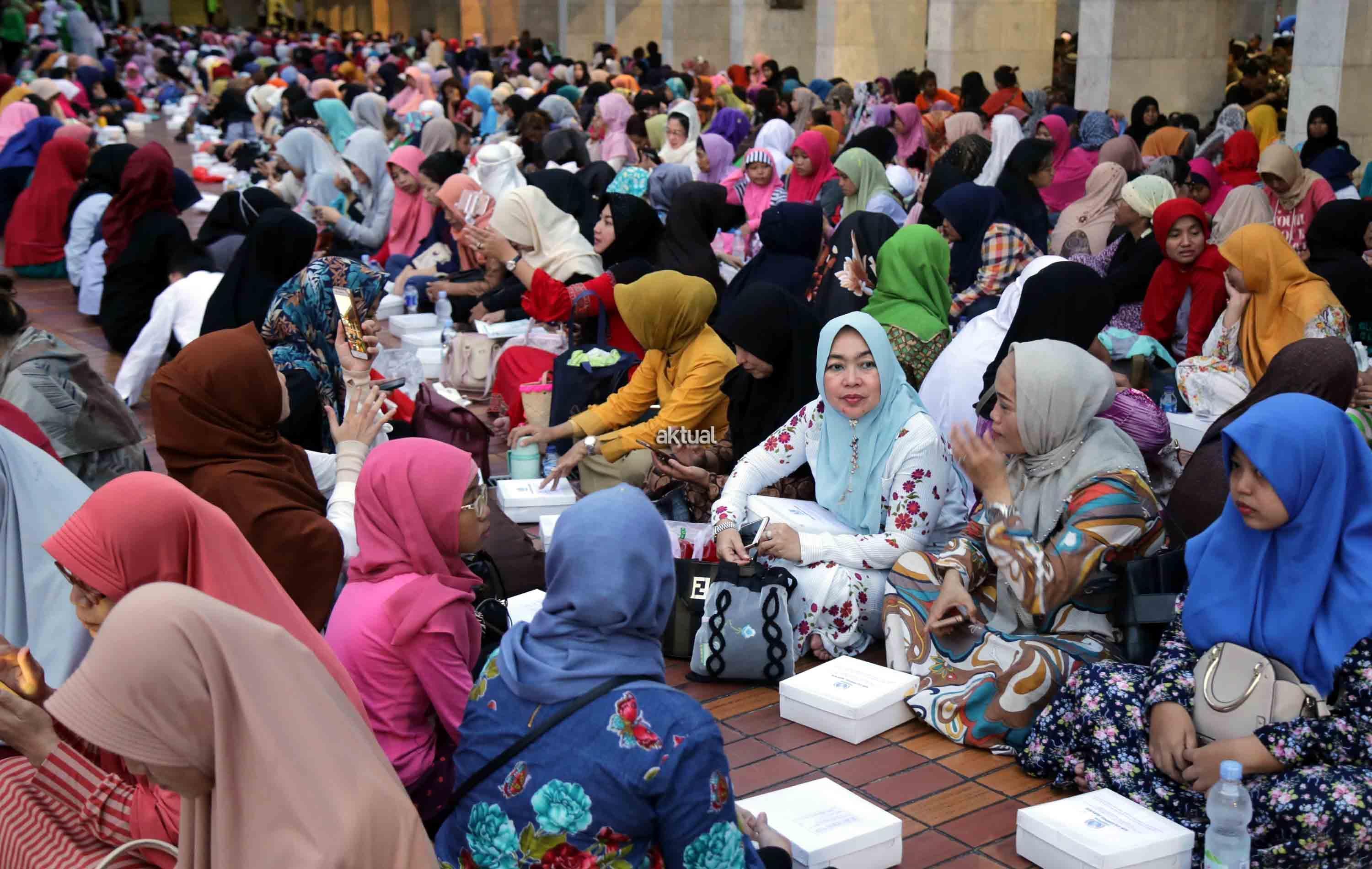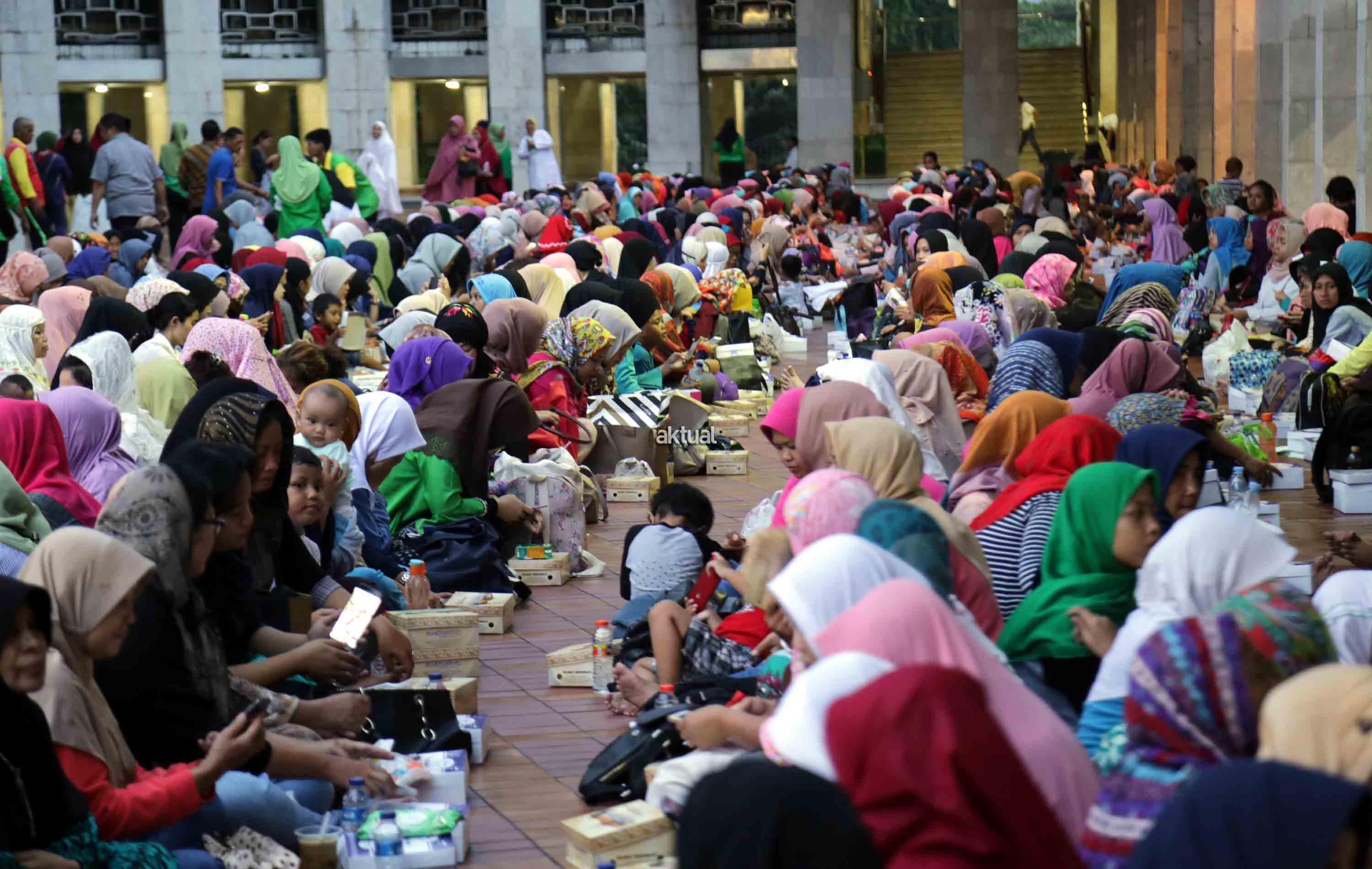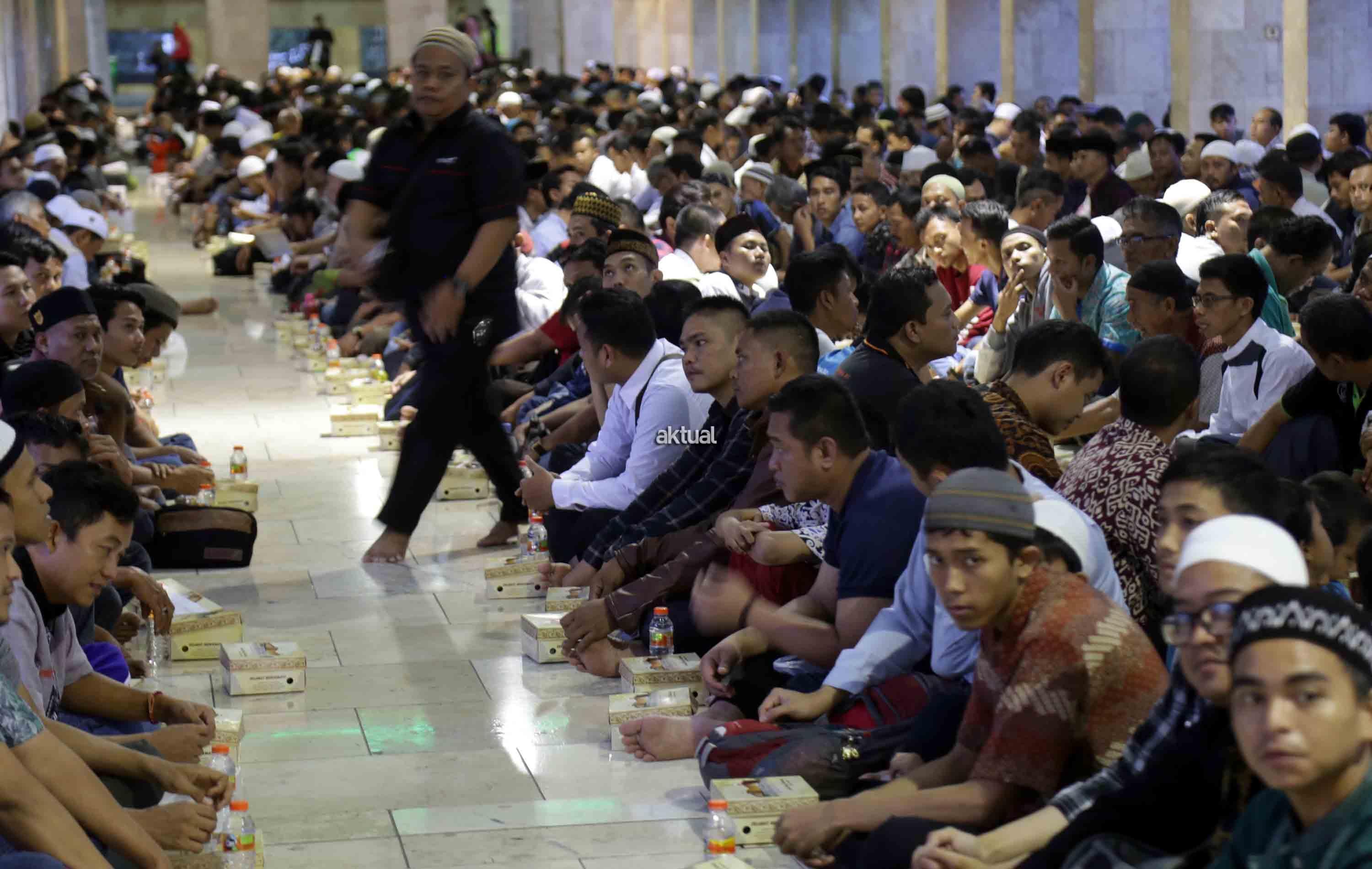 Warga mengikuti buka puasa bersama pada hari pertama bulan Ramadhan yang digelar di Masjid Istiqlal, Jakarta, Kamis (17/5/18). Pada hari pertama puasa ini masjid menyediakan 3.228 boks untuk warga yang berbuka di Masjid Istiqlal. AKTUAL/Tino Oktaviano