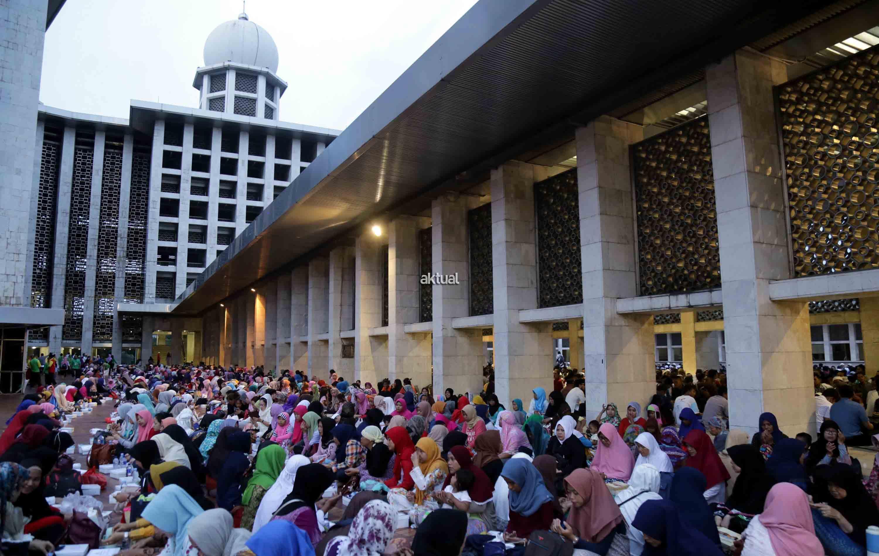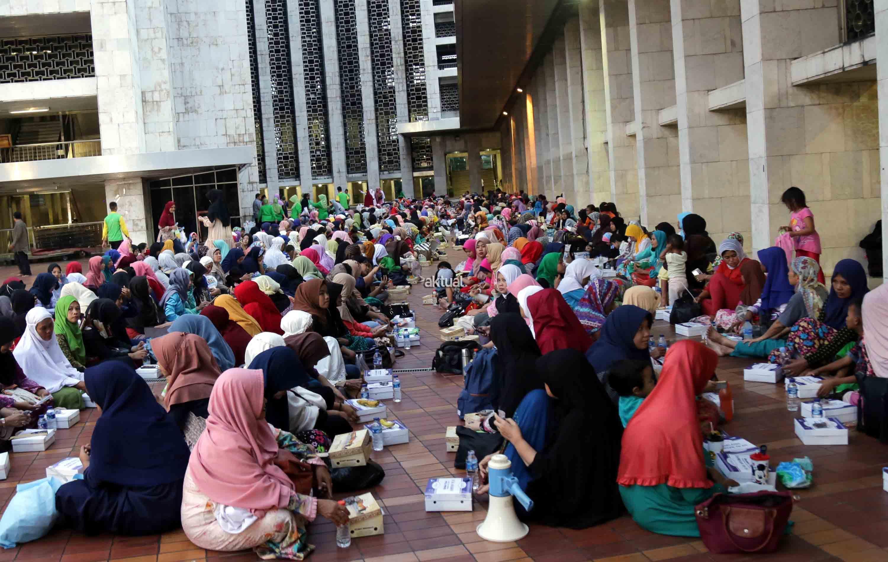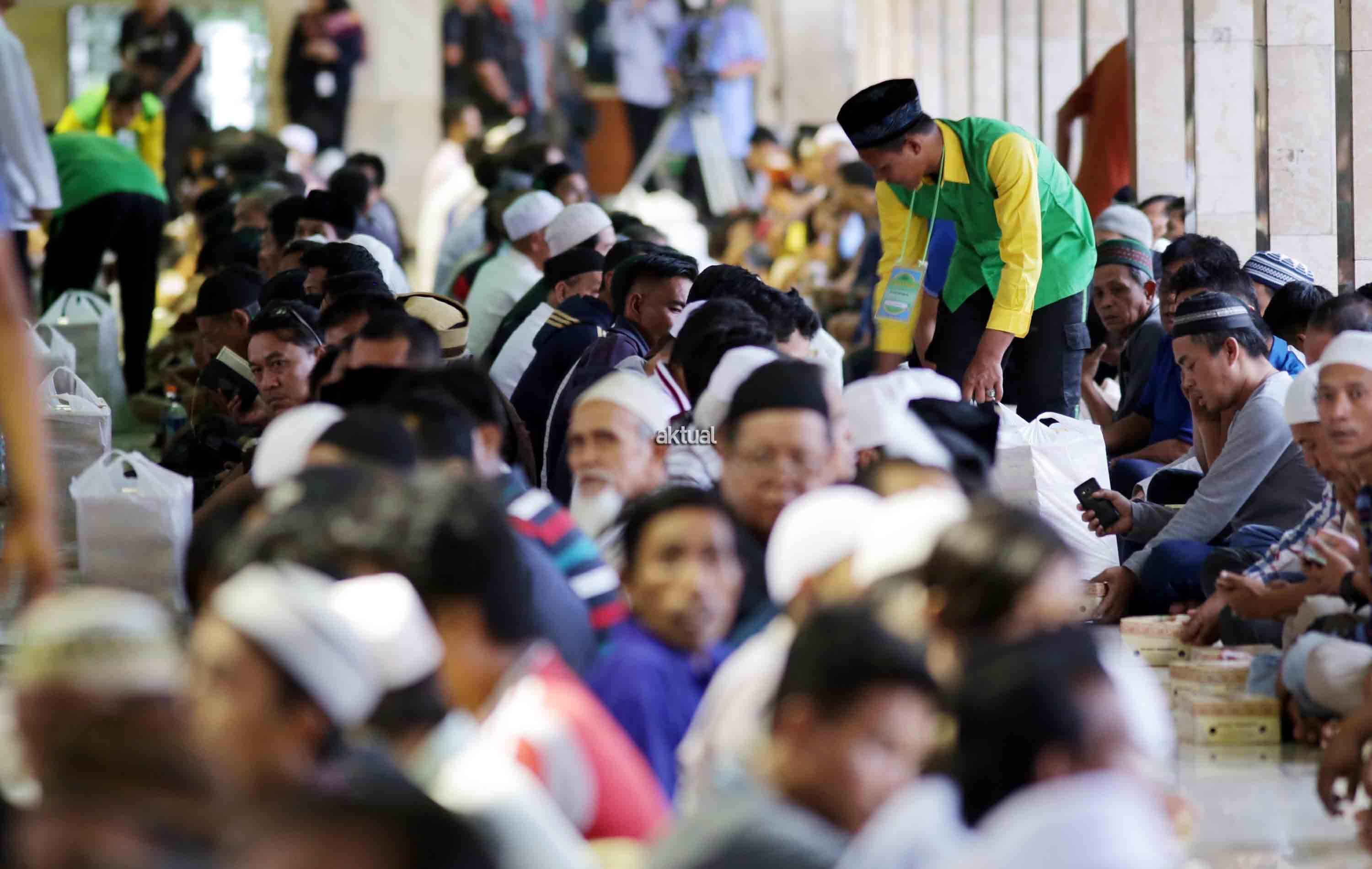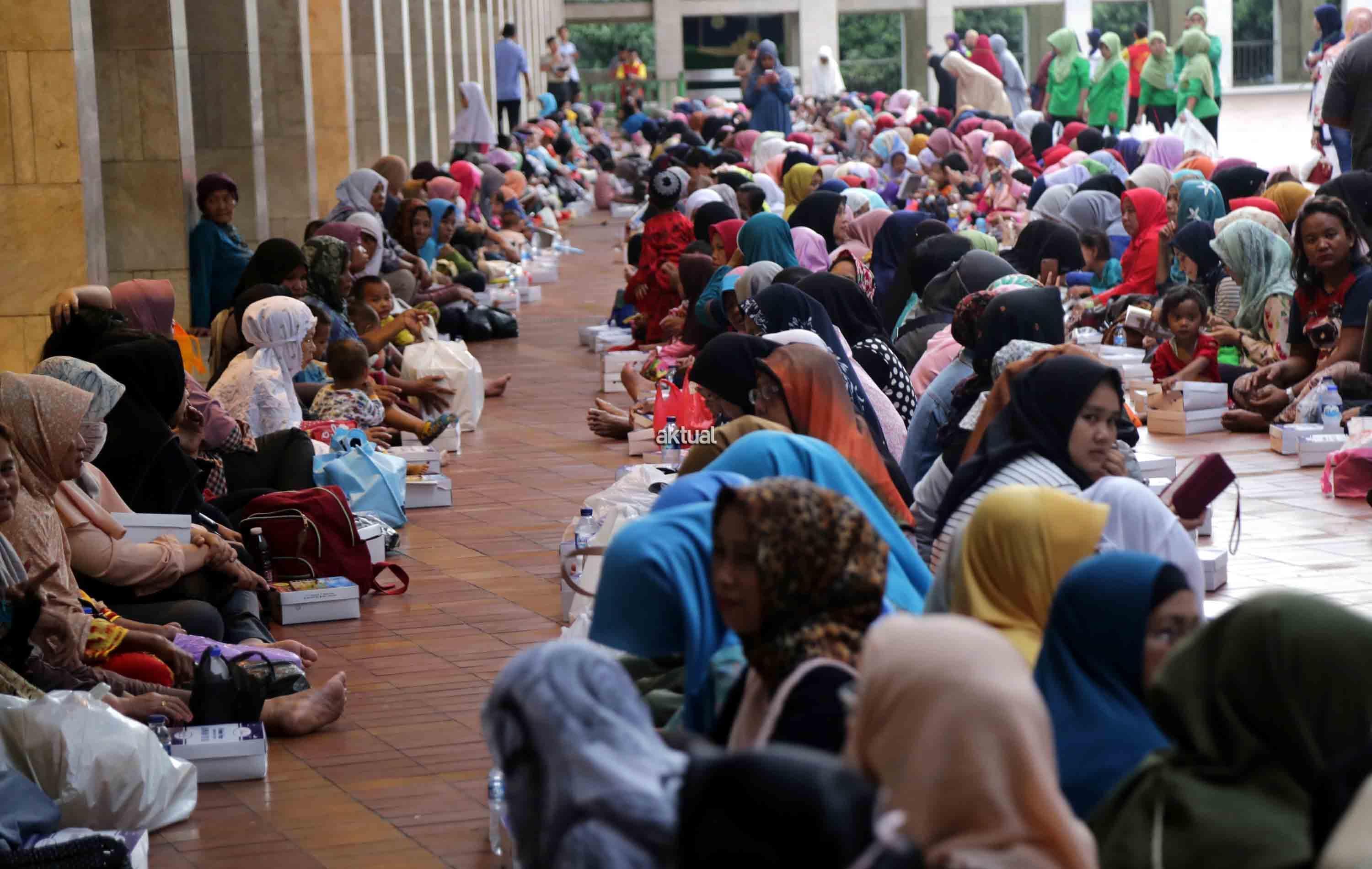Warga mengikuti buka puasa bersama pada hari pertama bulan Ramadhan yang digelar di Masjid Istiqlal, Jakarta, Kamis (17/5/18). Pada hari pertama puasa ini masjid menyediakan 3.228 boks untuk warga yang berbuka di Masjid Istiqlal. AKTUAL/Tino Oktaviano