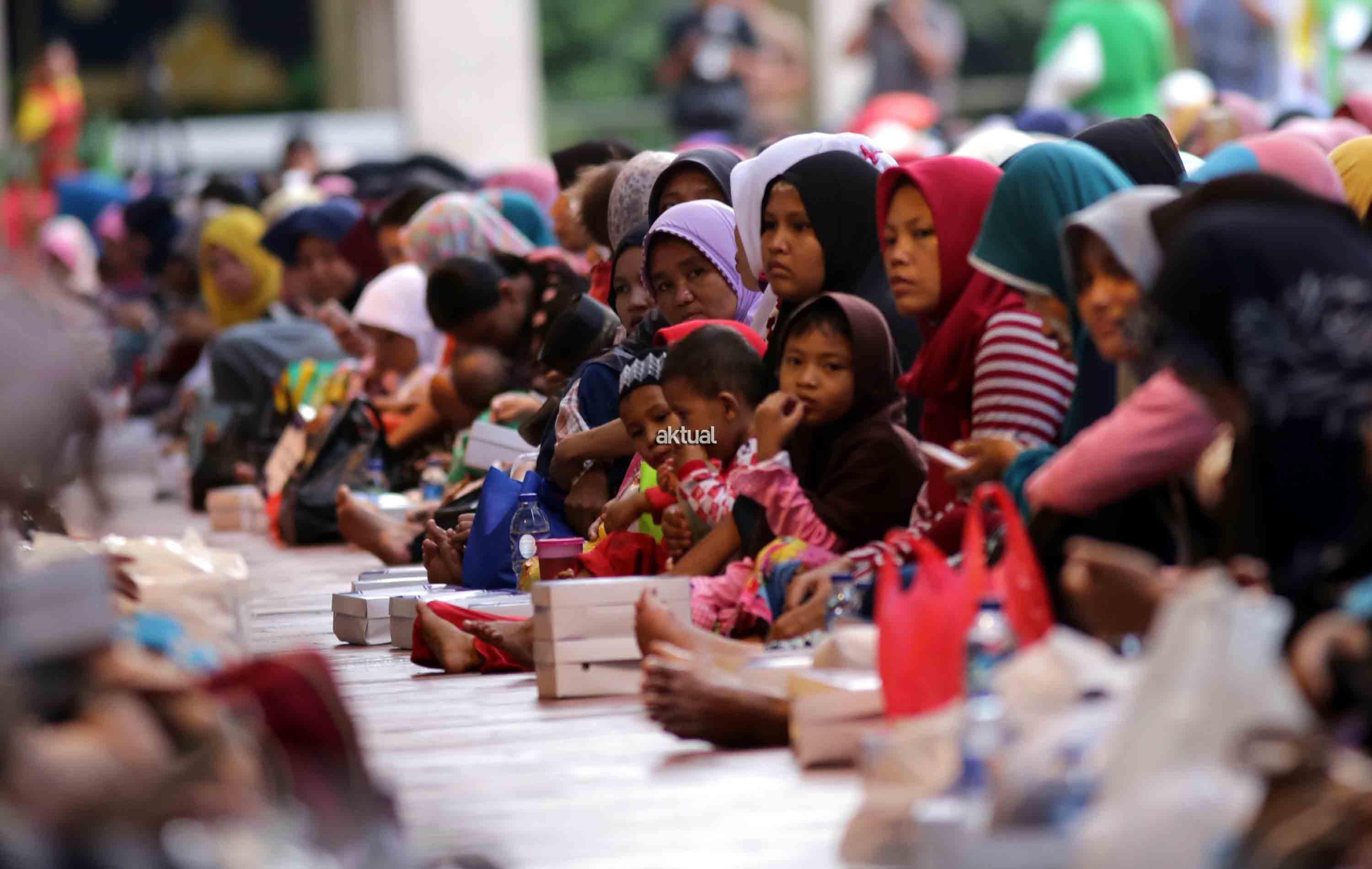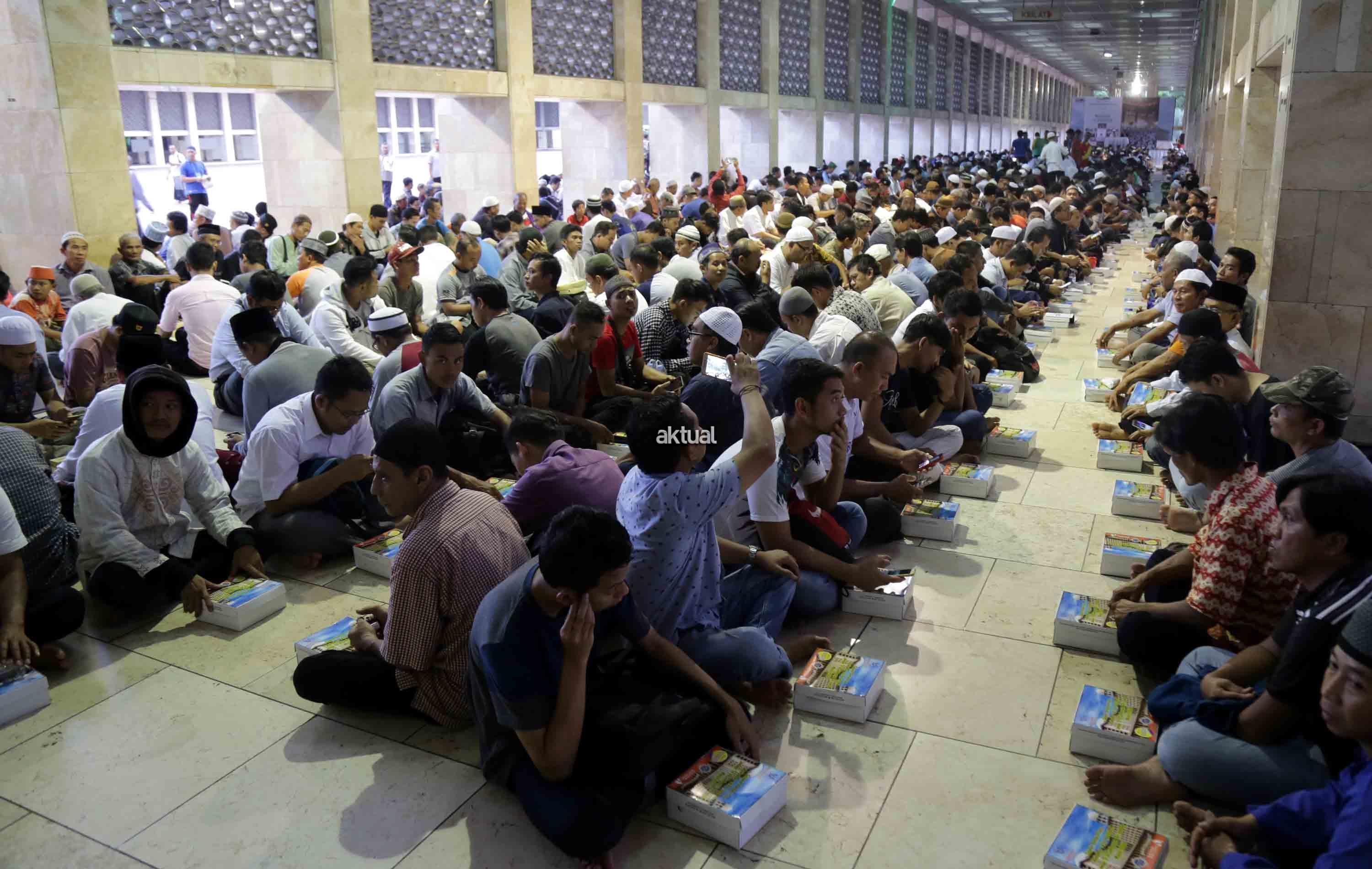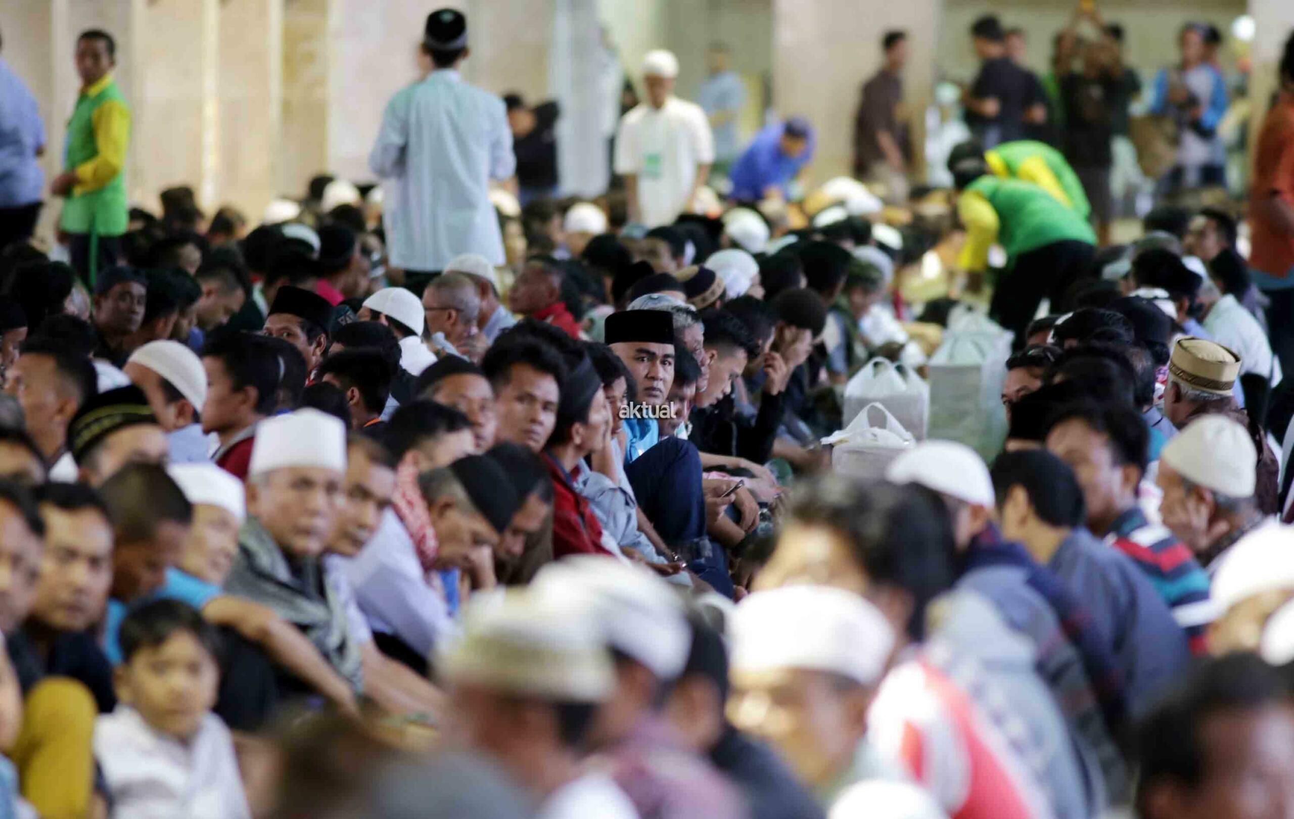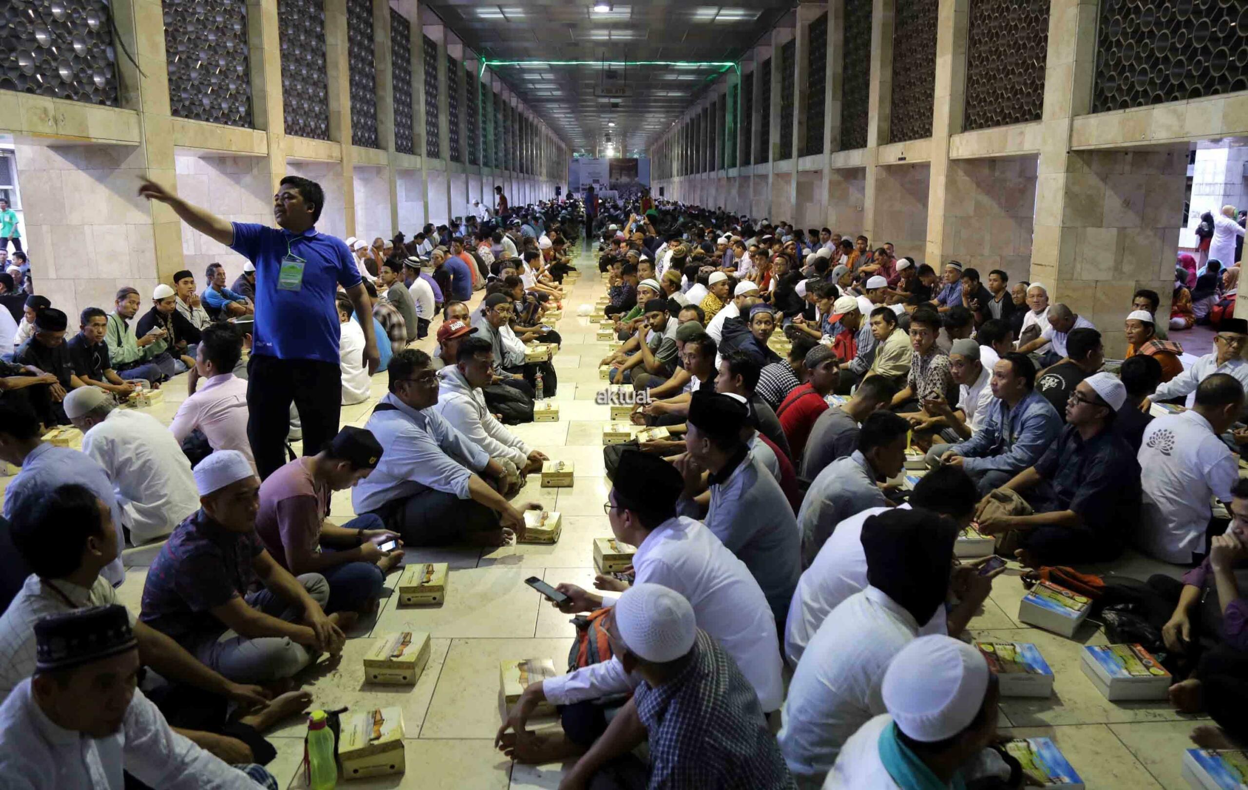 Warga mengikuti buka puasa bersama pada hari pertama bulan Ramadhan yang digelar di Masjid Istiqlal, Jakarta, Kamis (17/5/18). Pada hari pertama puasa ini masjid menyediakan 3.228 boks untuk warga yang berbuka di Masjid Istiqlal. AKTUAL/Tino Oktaviano