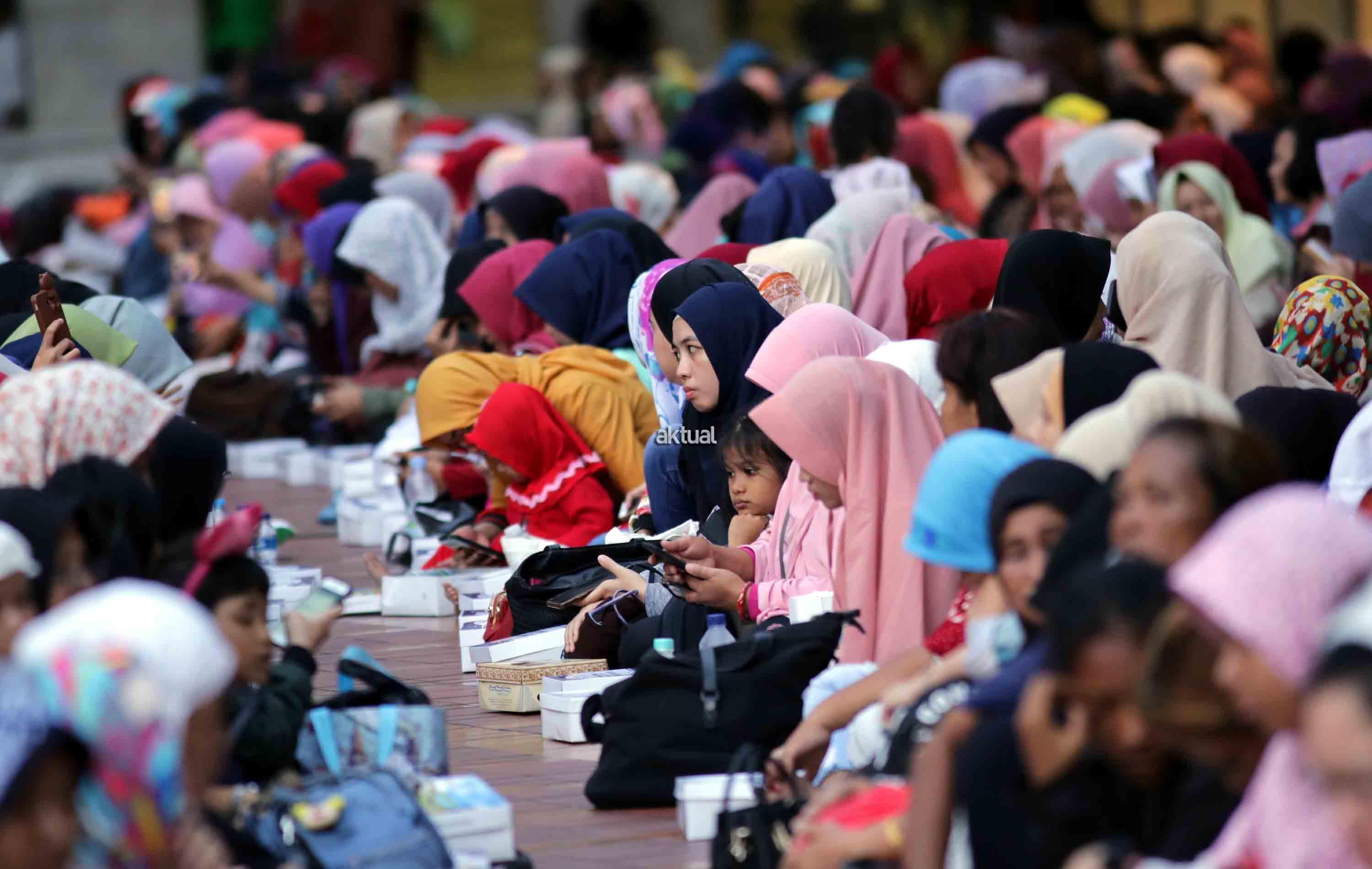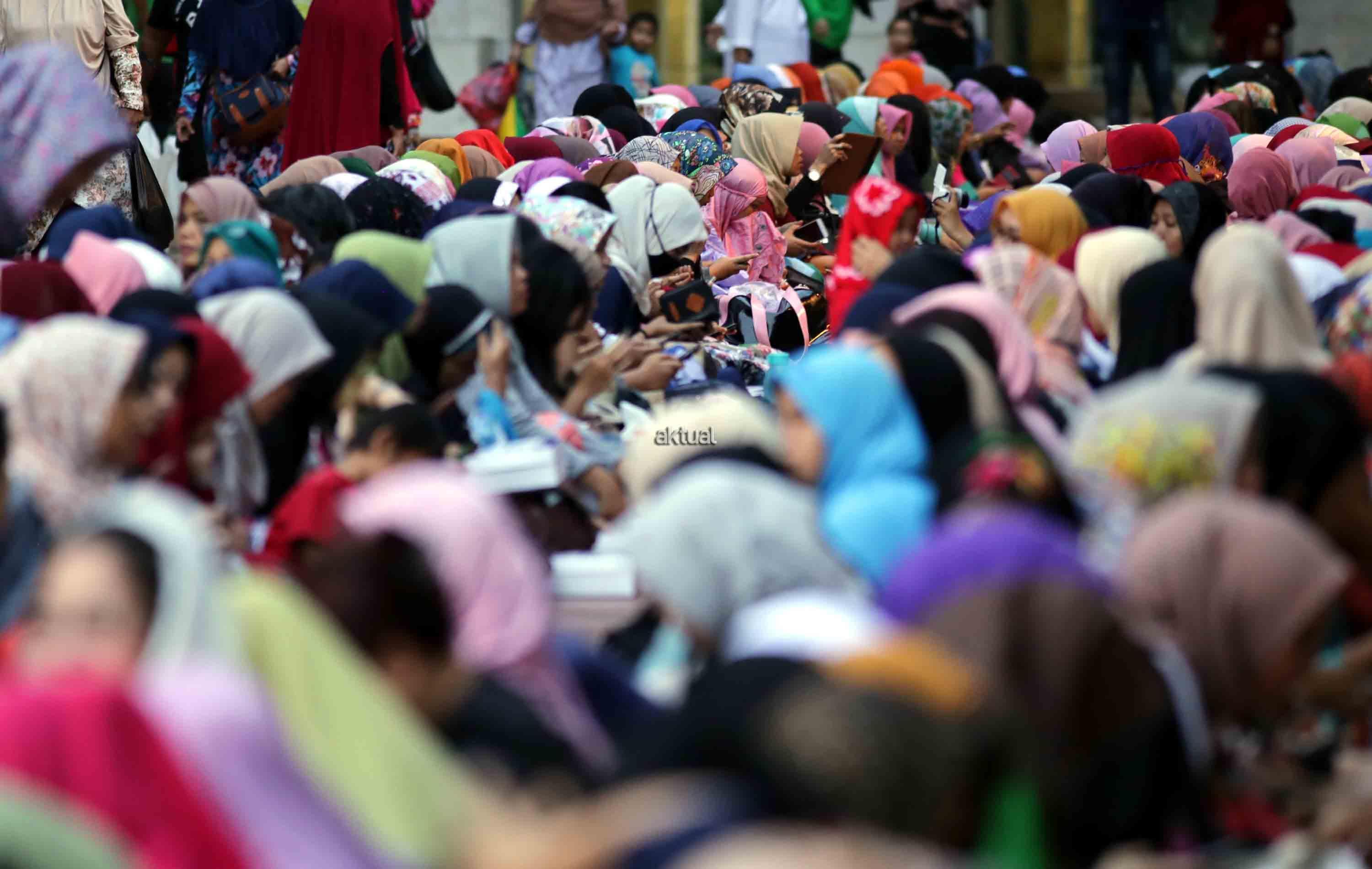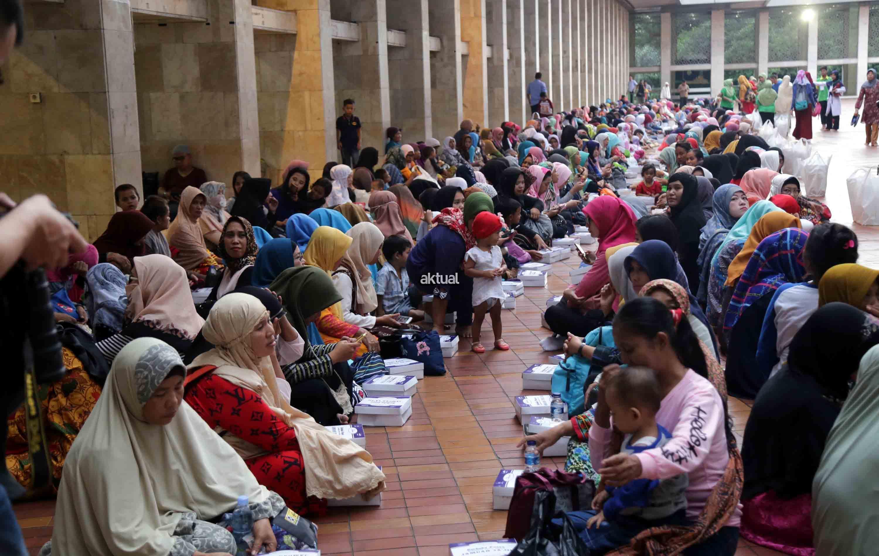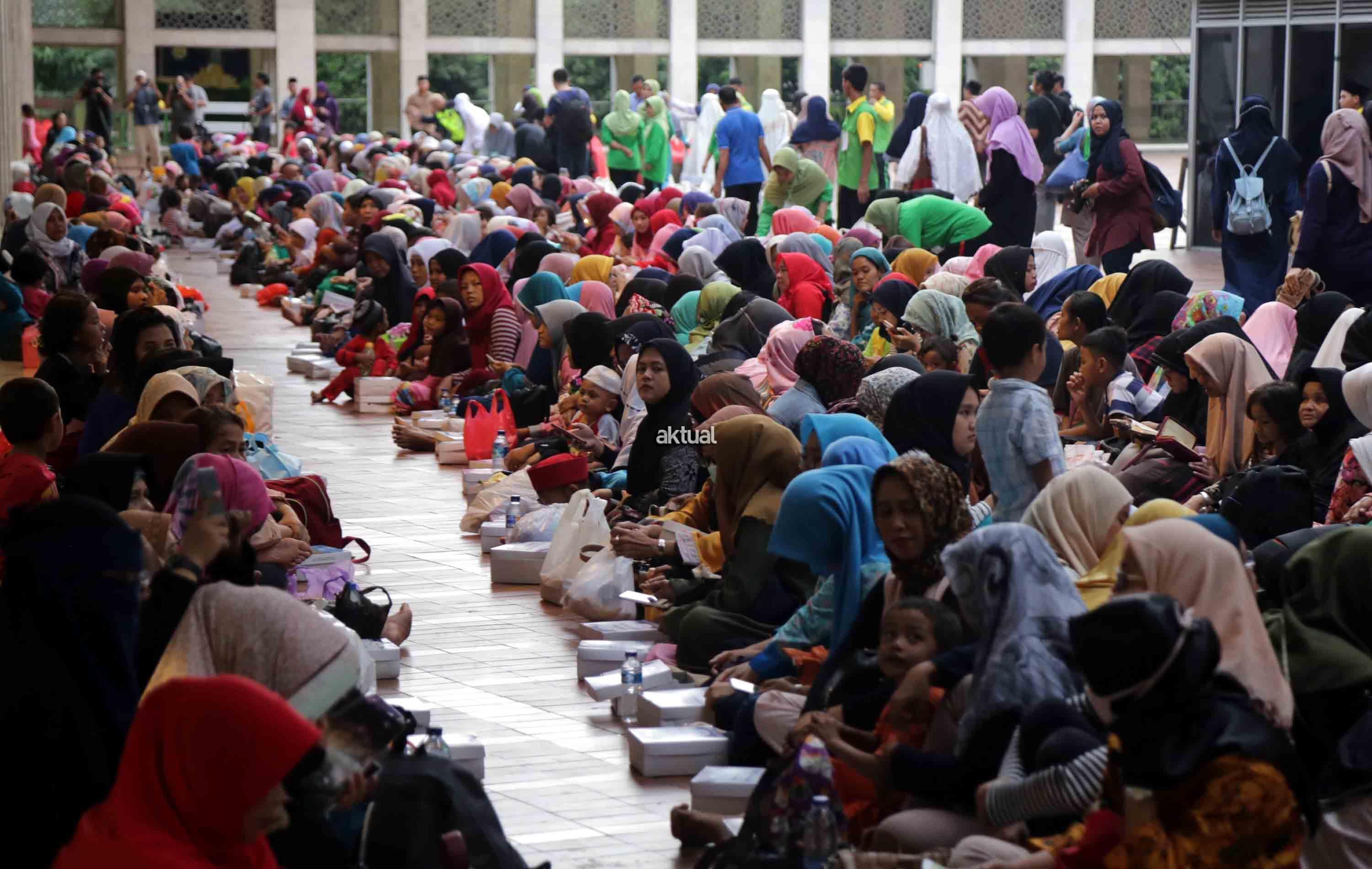 Warga mengikuti buka puasa bersama pada hari pertama bulan Ramadhan yang digelar di Masjid Istiqlal, Jakarta, Kamis (17/5/18). Pada hari pertama puasa ini masjid menyediakan 3.228 boks untuk warga yang berbuka di Masjid Istiqlal. AKTUAL/Tino Oktaviano