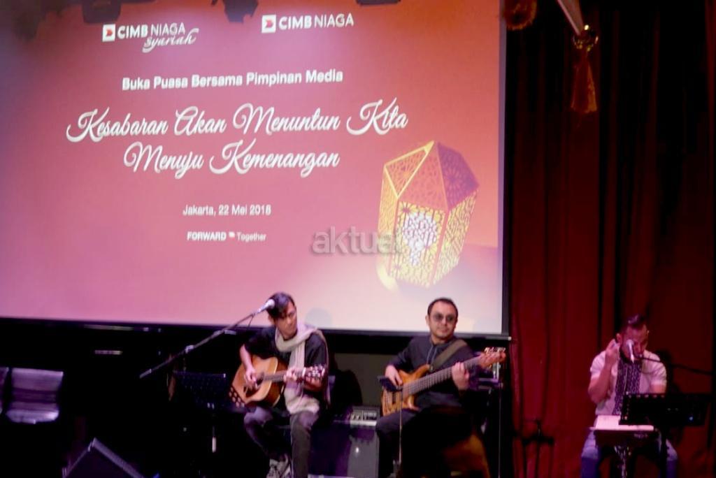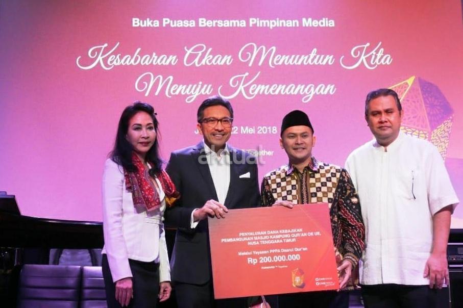 Presiden Direktur CIMB Niaga Tigor M. Siahaan (kedua kiri) didampingi Direktur Syariah Banking CIMB Niaga Pandji P. Djajanegara (kanan) dan Direktur Compliance, Corporate Secretary and Legal CIMB Niaga Fransiska Oei (kiri) menyerahkan donasi Dana Kebajikan CIMB Niaga Syariah sebesar Rp200 juta kepada Direktur Utama PPPA Daarul Qur’an M. Anwar Sani (kedua kanan) di sela Buka Puasa Bersama Pimpinan Media di Jakarta, Selasa (22/5/2018). Donasi akan disalurkan untuk pembangunan Masjid Kampung Qur’an Oe Ue, Nusa Tenggara Timur. AKTUAL/Eko S Hilman