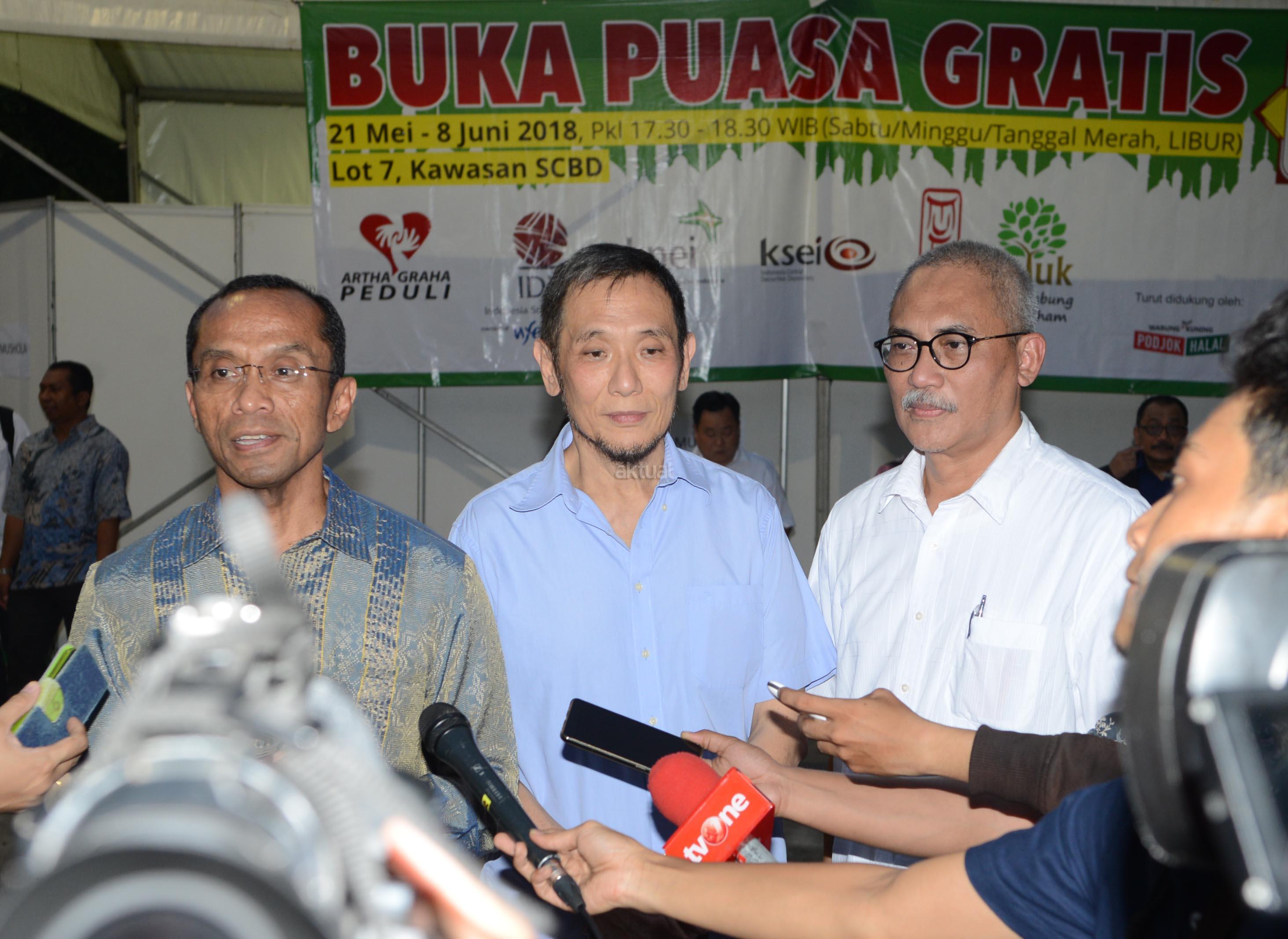 Ketua Harian Artha Graha Peduli Heka Hertanto (kanan) bersama dengan Direktur BEI Hamdi Hassyarbaini (kiri) dan Ka. Komunitas Muslim Tionghoa Indonesia Jusuf Hamka memberikan keterangan setelah pembukaan acara buka puasa gratis yang diprakarsai oleh Artha Graha peduli, IDX, KPEI, KSEI dan Muslim Thionghoa Indonesia di Kawasan SCBD Lod 7, Jakarta, Senin (21/5) Program buka puasa gratis bagi masyarakat umum ini akan berlangsung dari 21 Mei sampai dengan 8 Juni 2018. AKTUAL/Eko S Hilman