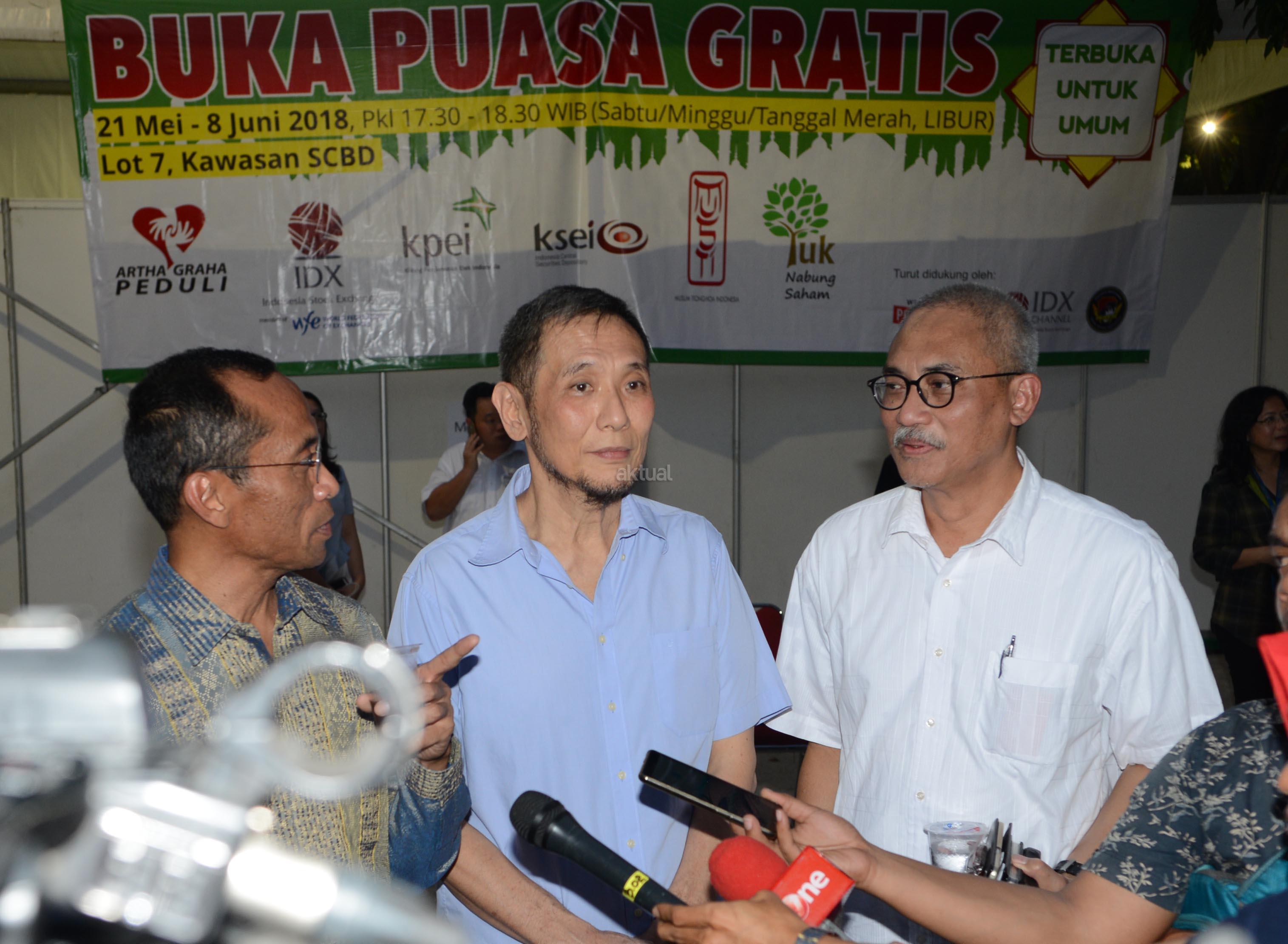 Ketua Harian Artha Graha Peduli Heka Hertanto (kanan) bersama dengan Direktur BEI Hamdi Hassyarbaini (kiri) dan Ka. Komunitas Muslim Tionghoa Indonesia Jusuf Hamka memberikan keterangan setelah pembukaan acara buka puasa Gratis yang diprakarsai oleh Artha Graha peduli, IDX, KPEI, KSEI dan Muslim Thionghoa Indonesia di Kawasan SCBD Lod 7, Jakarta, Senin (21/5) Program buka puasa gratis bagi masyarakat umum ini akan berlangsung dari 21 Mei sampai dengan 8 Juni 2018. AKTUAL/Eko S Hilman