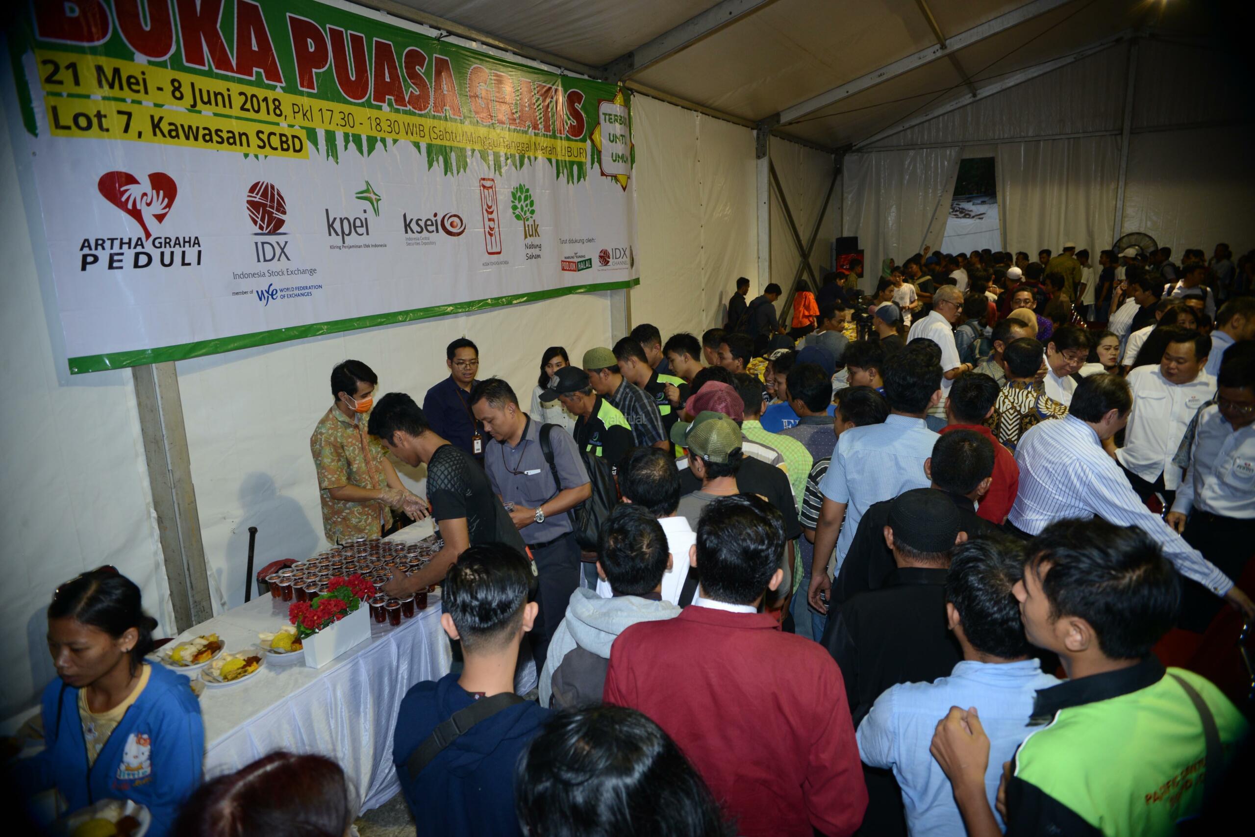 Masyarakat umum saat menikmatiu buka puasa gratis yang dibuka oleh Ketua Harian Artha Graha Peduli Heka Hertanto bersama dengan Direktur BEI Hamdi Hassyarbaini dan Ka. Komunitas Muslim Tionghoa Indonesia Jusuf Hamka pada acara buka pusa Gratis yang di prakarsai oleh Artha Graha peduli, IDX, KPEI, KSEI dan Muslim Thiong Hoa Indonesia di Kawasan SCBD Lod 7, Jakarta, Senin (21/5). Program buka puasa gratis bagi masyarakat umum ini akan berlangsung dari 21 Mei sampai dengan 8 Juni 2018. AKTUAL/Eko S Hilman