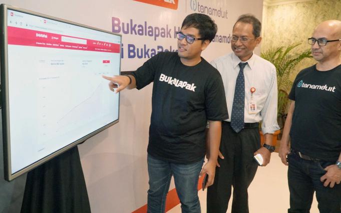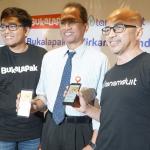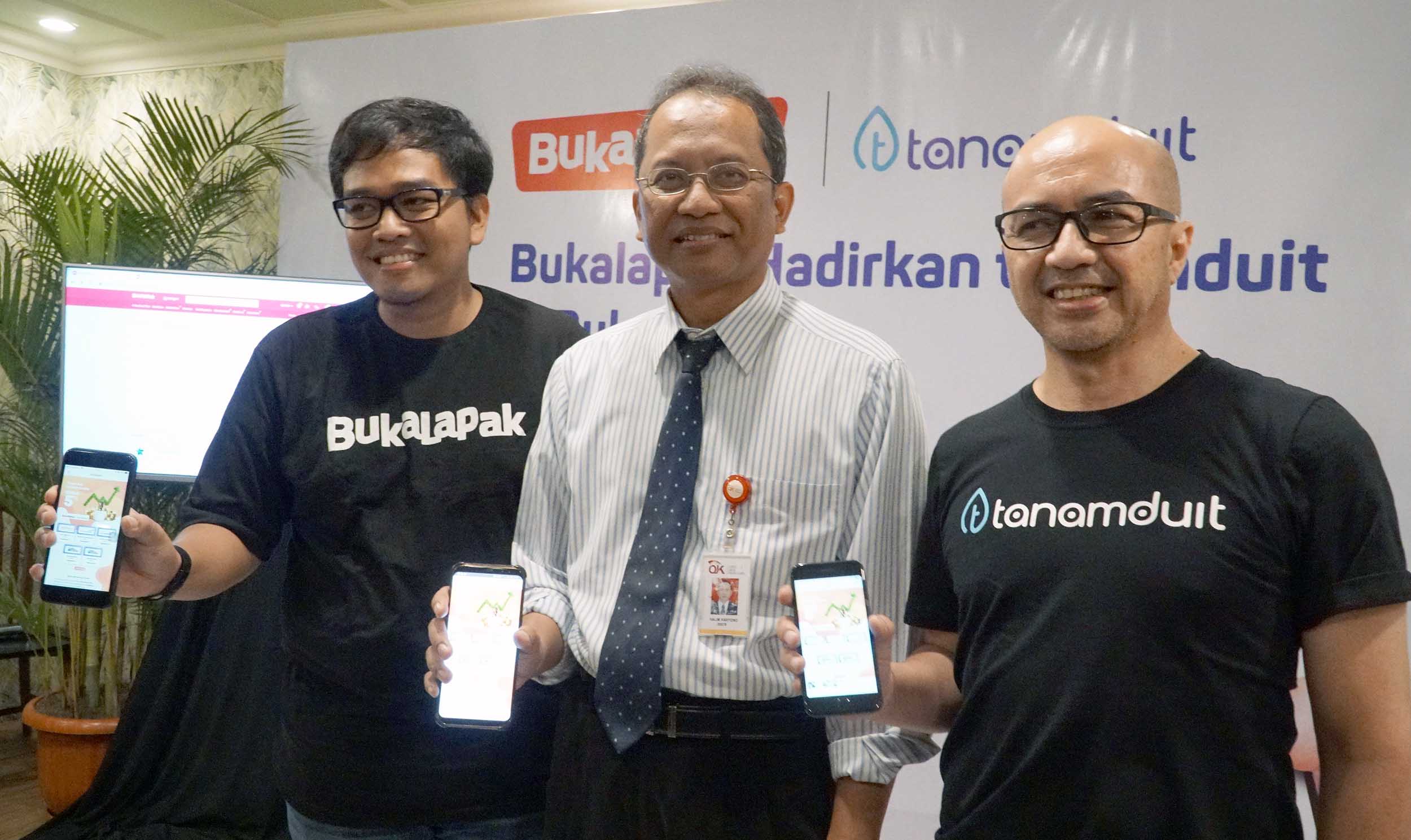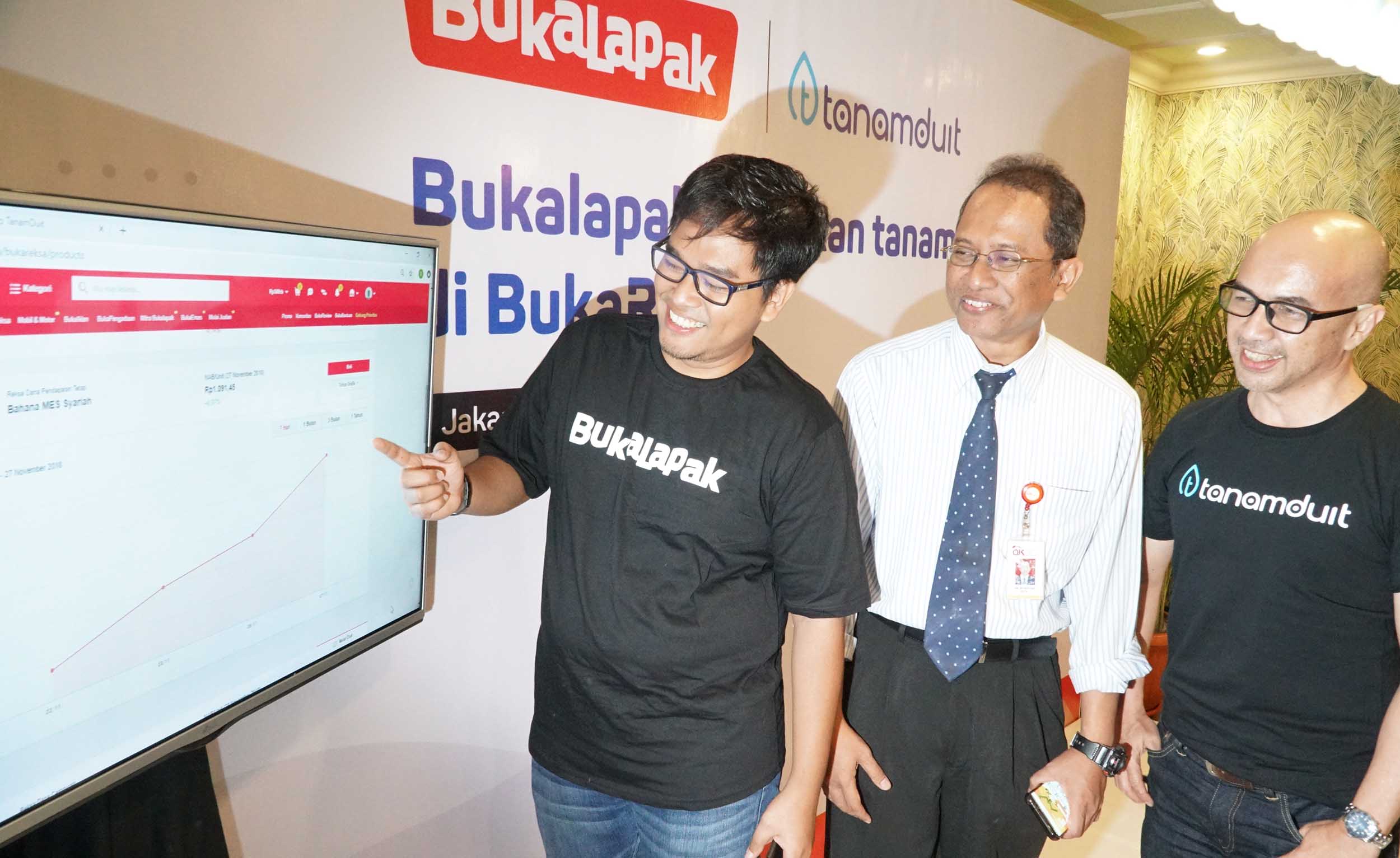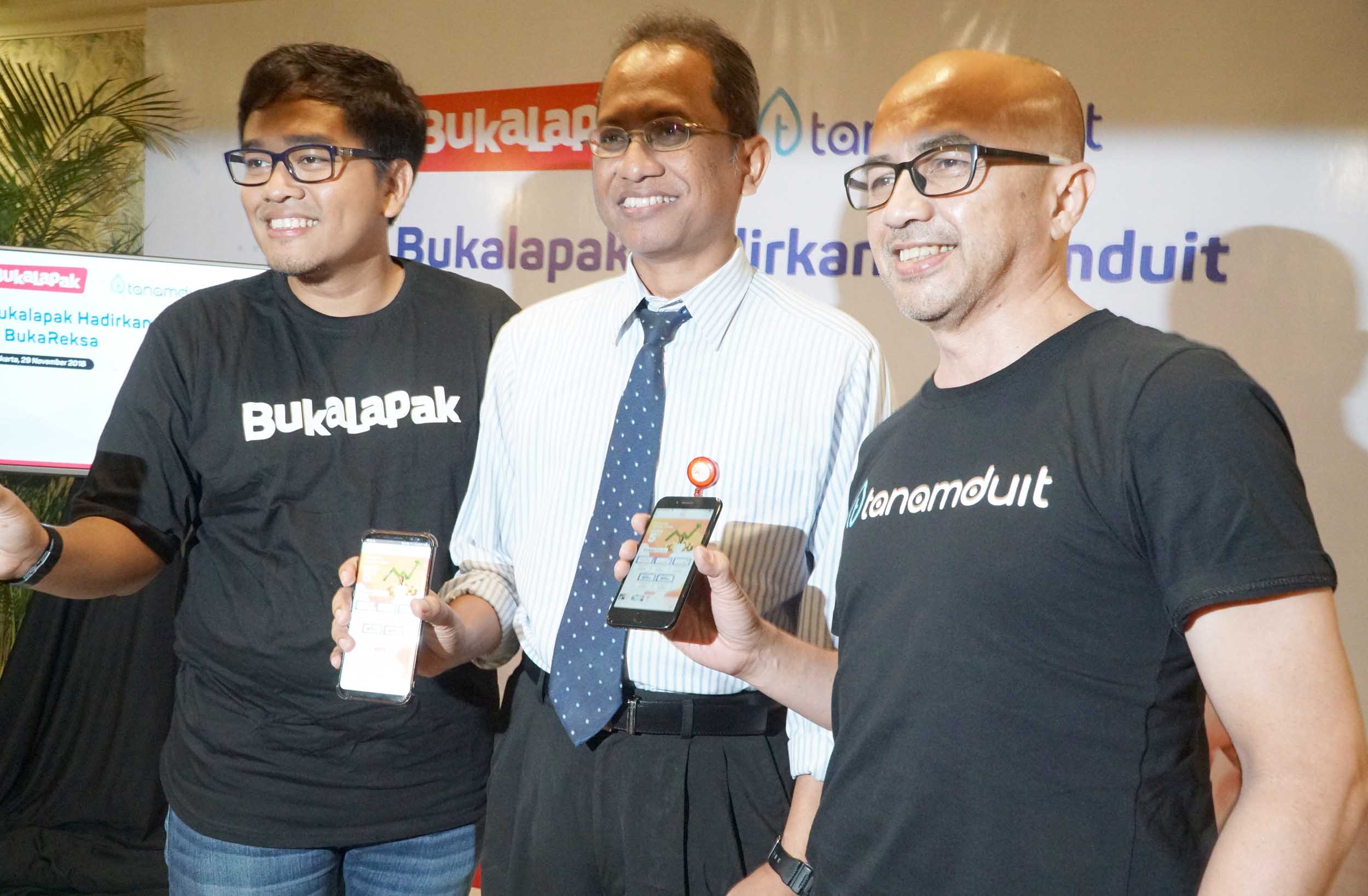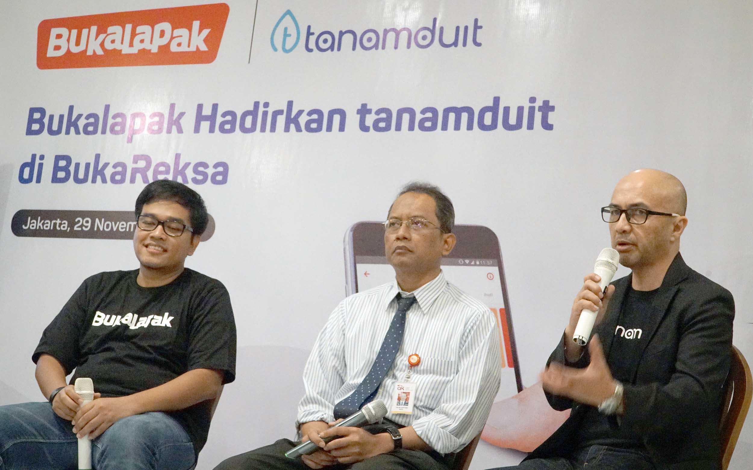 (dari kiri ke kanan) Head of Payment & Financial Services Bukalapak Destya Danang Pradityo, Deputi Direktur Pengelolaan Investasi OJK Halim Haryono dan Direktur Pengembangan Bisnis Tanamduit Muhammad Hanif saat hadir dalam jumpa pers di Jakarta, Kamis (29/11). Bukalapak sebagai salah satu perusahaan teknologi terbesar di Indonesia berkomitmen untuk memanfaatkan teknologi guna membantu meningkatkan pertumbuhan ekonomi Indonesia. Bukalapak melalui BukaReksa memperluas pilihan investasi dengan mengandeng Tanamduit sebagai agen penjual efek reksa dana (APERD) yang memiliki lisensi dari OJK. 5 produk investasi baru yang hadir di BukaReksa adalah Bahana MES Syariah, Batavia Dana Dinamis, Sucorinvest Sharia Equity Fund, Sucorinvest Maxi Fund serta Batavia Dana Saham. AKTUAL/Eko S Hilman