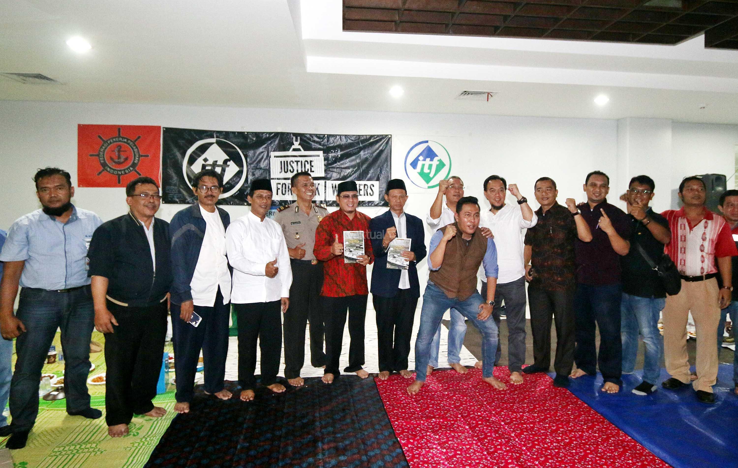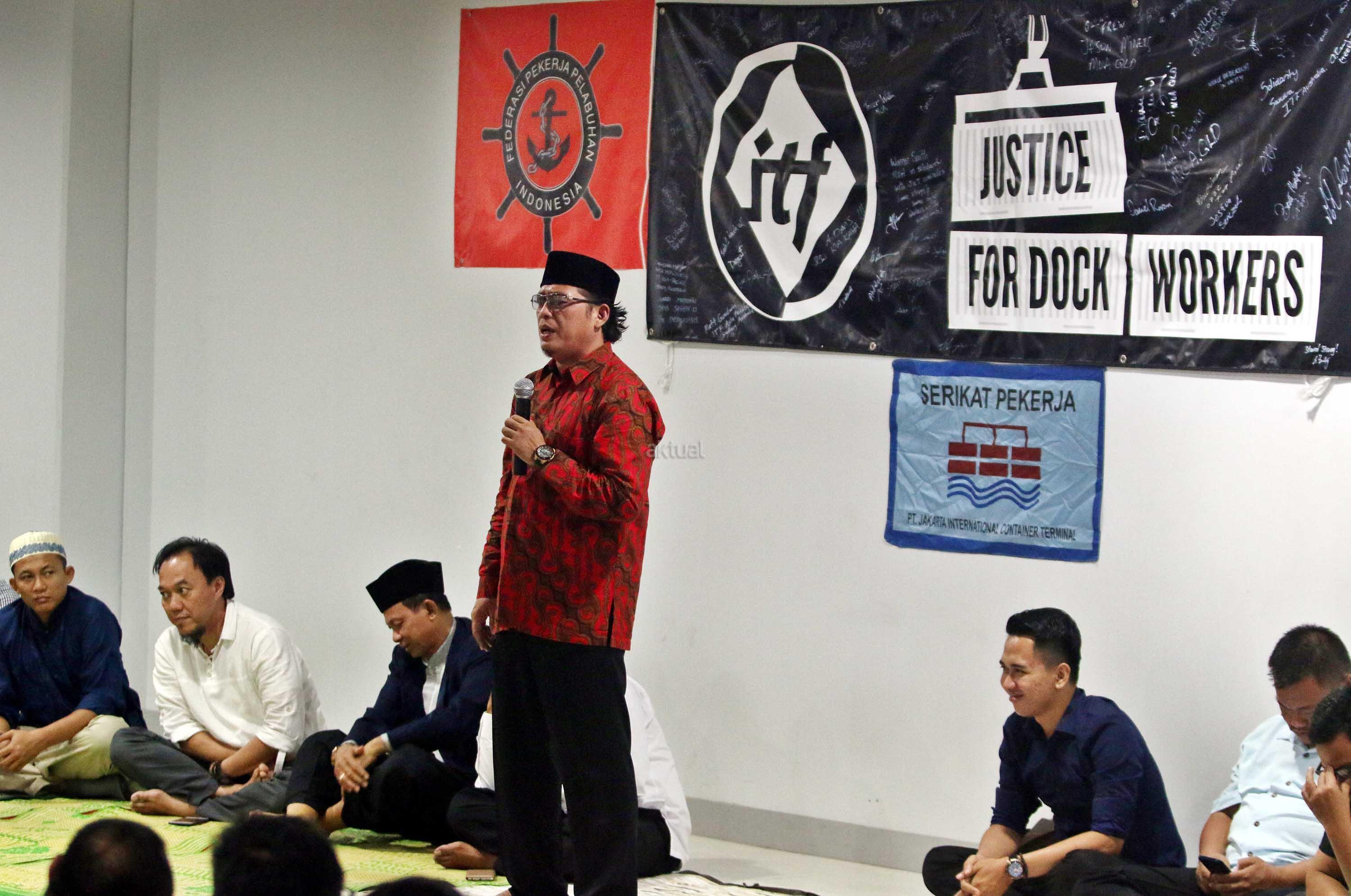 Serikat Pekerja Jakarta International Container Terminal (SP JICT) bersama ratusan pekerja pelabuhan dan afiliasi, mengadakan buka puasa bersama di kantor Sekretariat SP JICT, Jakarta Utara, Rabu (6/6/2018). Selain berbuka, pekerja JICT juga turut mensosialisasikan buku “Melawan Konspirasi Global di Teluk Jakarta” yang mengungkapkan pelanggaran hukum dan kerugian negata kontrak JICT - Koja senilai hampir Rp 6 Milyar. AKTUAL/Tino Oktaviano