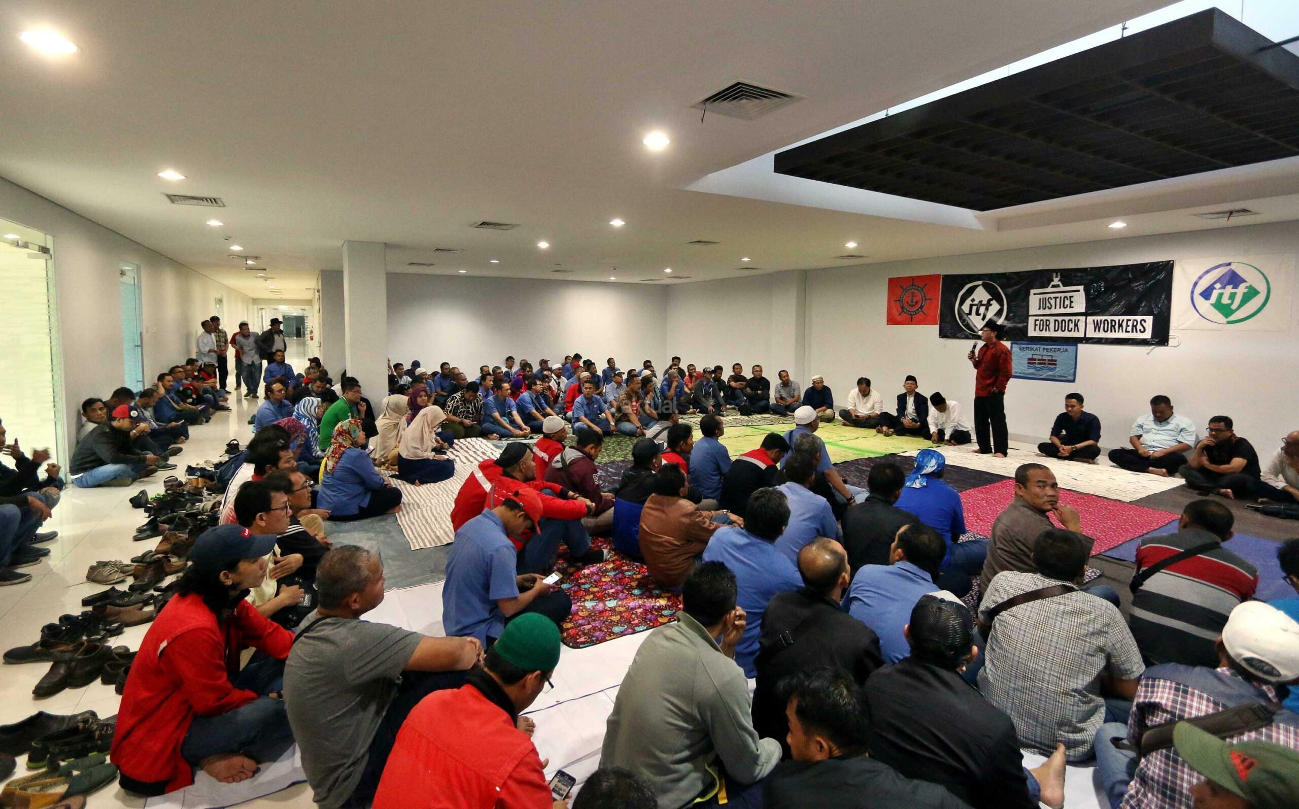 Serikat Pekerja Jakarta International Container Terminal (SP JICT) bersama ratusan pekerja pelabuhan dan afiliasi, mengadakan buka puasa bersama di kantor Sekretariat SP JICT, Jakarta Utara, Rabu (6/6/2018). Selain berbuka, pekerja JICT juga turut mensosialisasikan buku “Melawan Konspirasi Global di Teluk Jakarta” yang mengungkapkan pelanggaran hukum dan kerugian negata kontrak JICT – Koja senilai hampir Rp 6 Milyar. AKTUAL/Tino Oktaviano