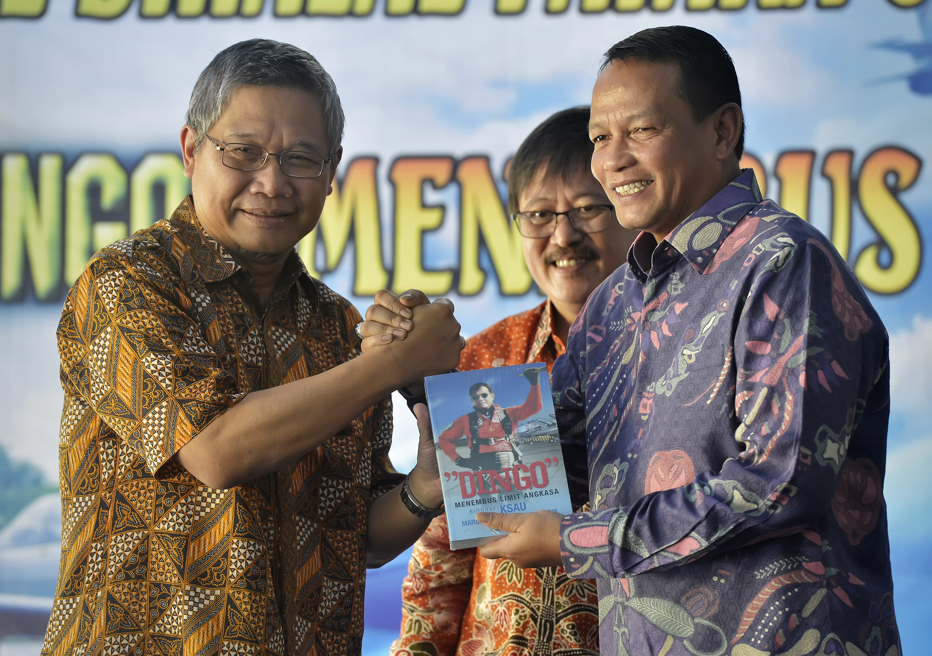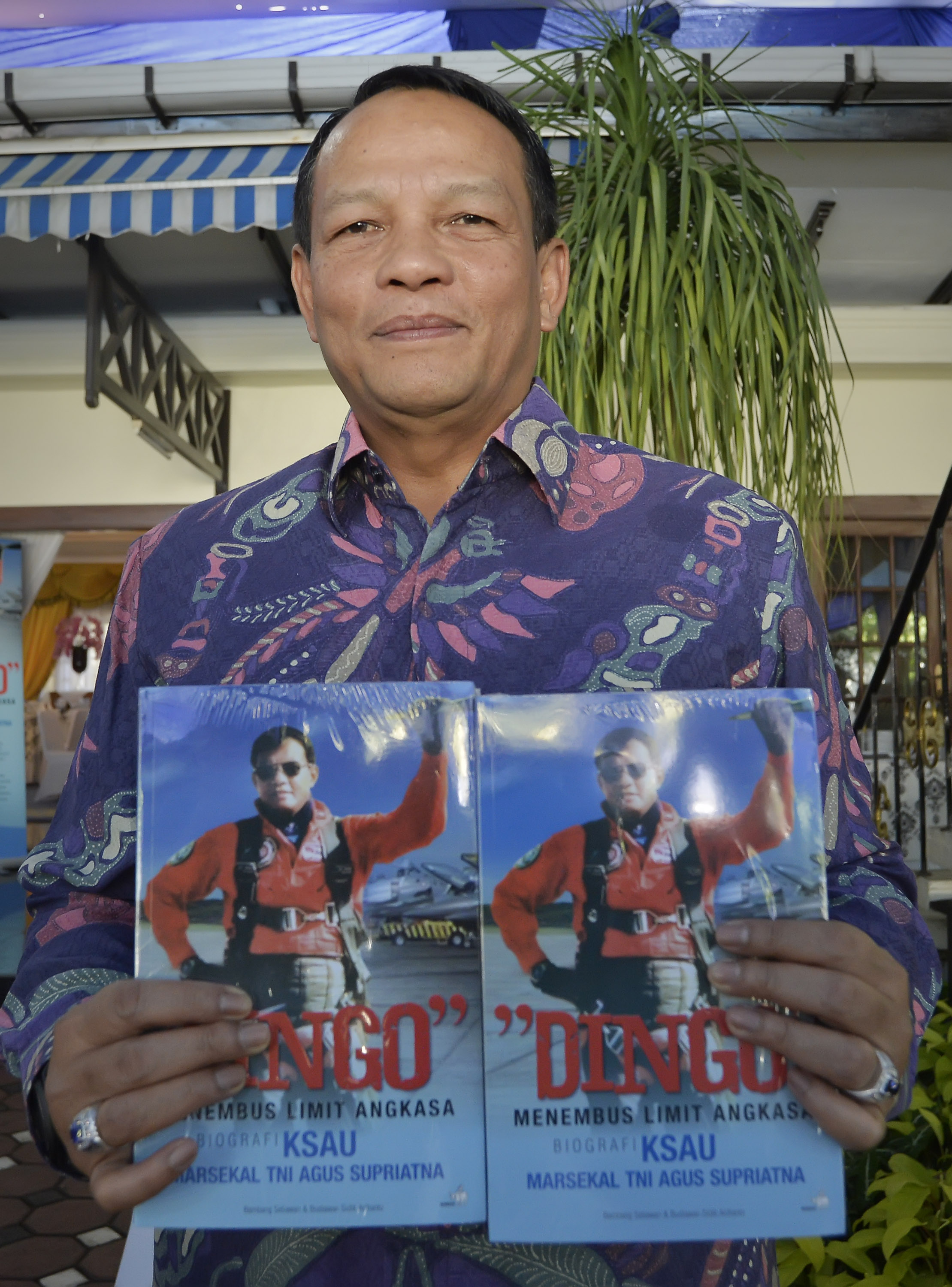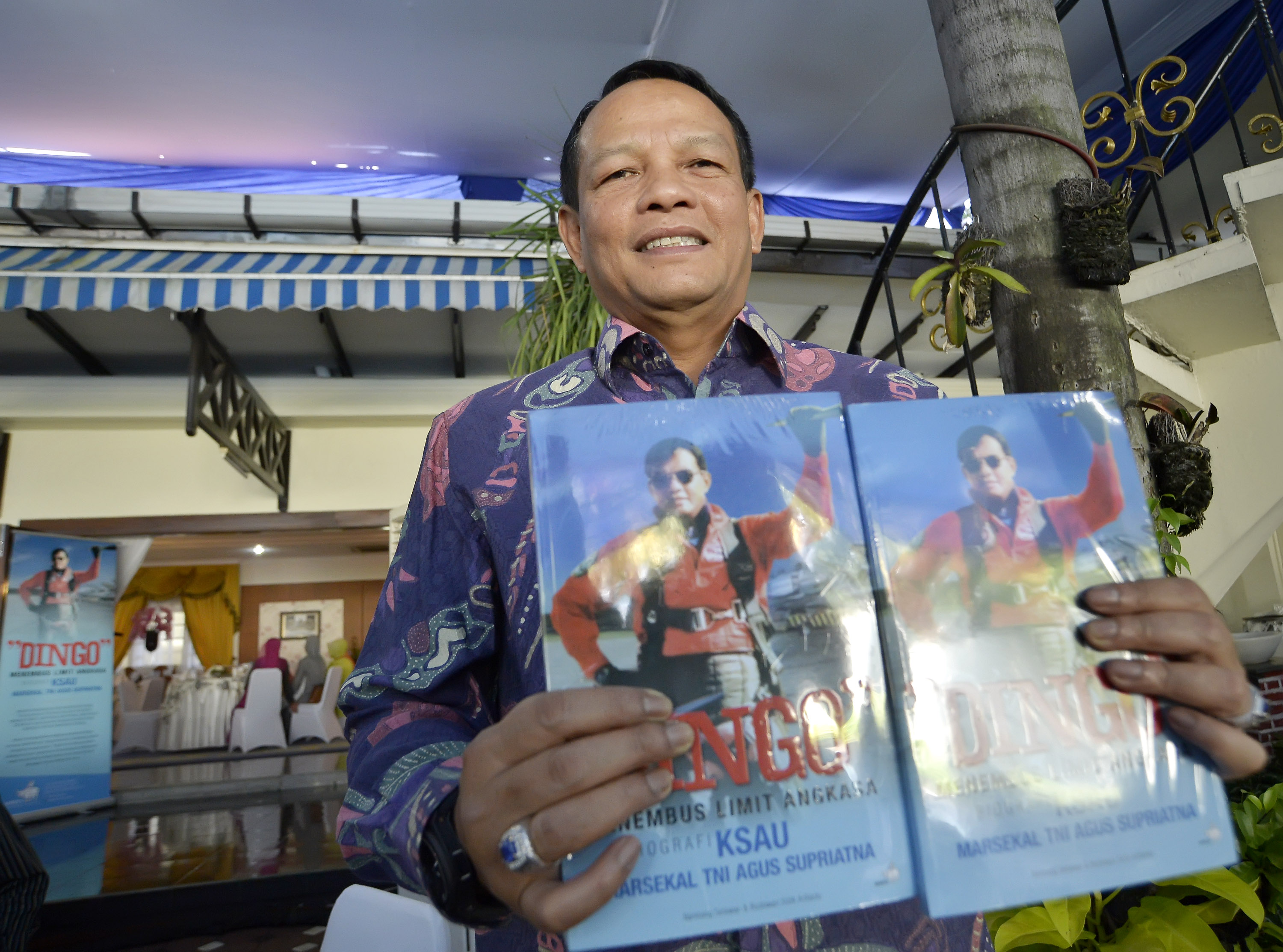 Kepala Staf Angkatan Udara (KSAU) Marsekal TNI Agus Supriatna menunjukkan buku biografi "Dingo : Menembus Limit Angkasa" saat peluncurannya di Jakarta, Sabtu (23/7). Buku tersebut berisi biografi KSAU Agus Supriatna dari mulai kelahiran, pendidikan Akabri AU, hingga karya penugasan yang membawanya menjadi Kepala Staf TNI Angkatan Udara. ANTARA FOTO/Yudhi Mahatma/ama/16