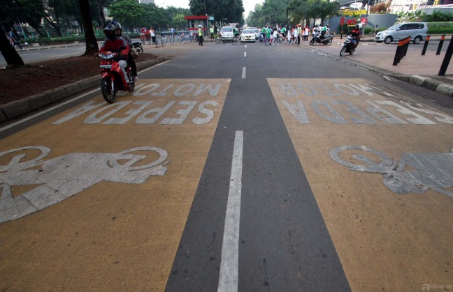 Jakarta, Aktual.co —Pemprov DKI Jakarta yang pada hari Rabu (17/12) mulai memberlakukan pelarangan motor melintas di jalan Thamrin-Medan Merdeka Barat, membuat suasana di Bundaran Hotel Indonesia (HI) menuju Thamrin, jalan Medan Merdeka Barat dan sebaliknya terlihat sepi