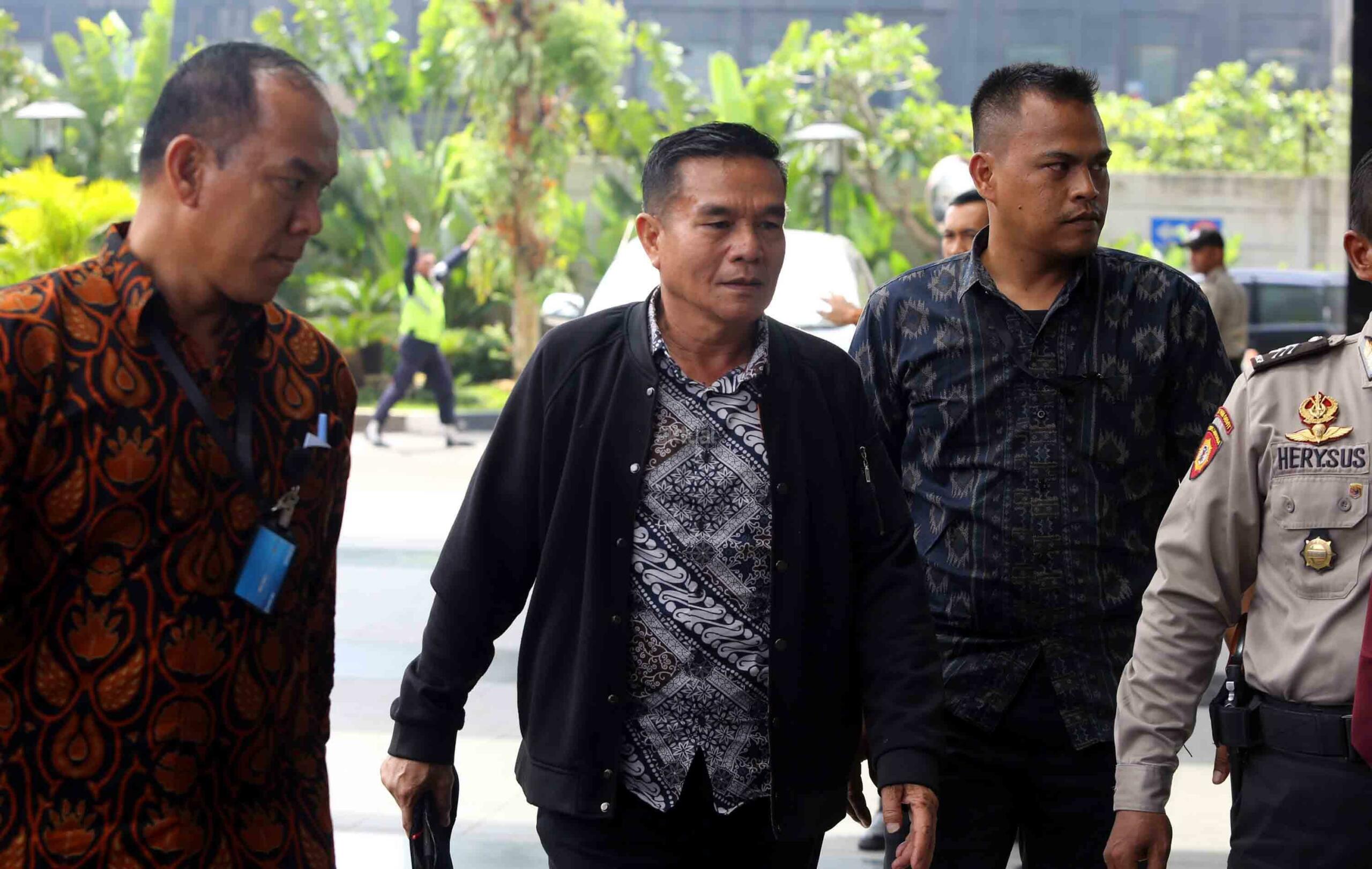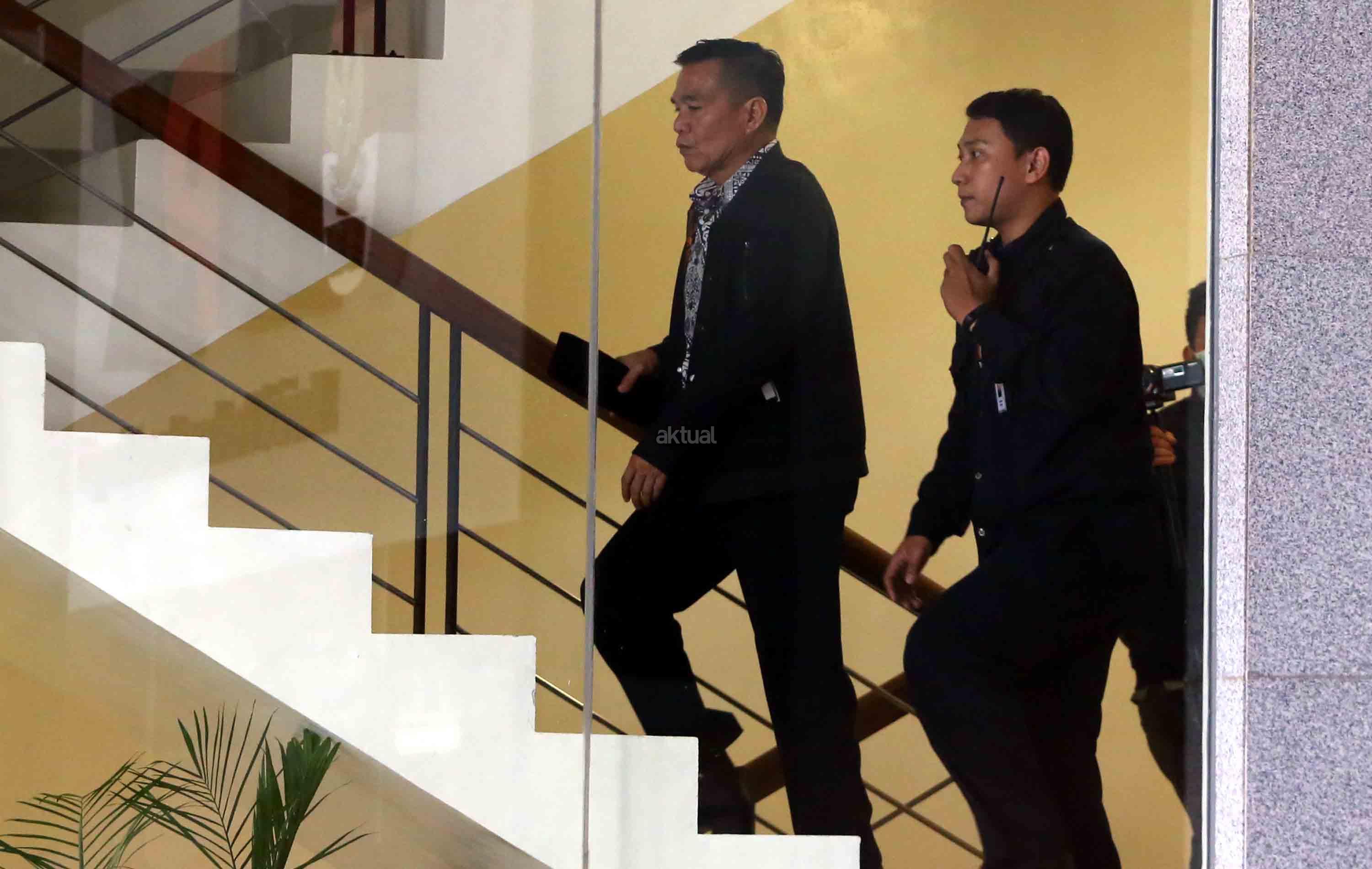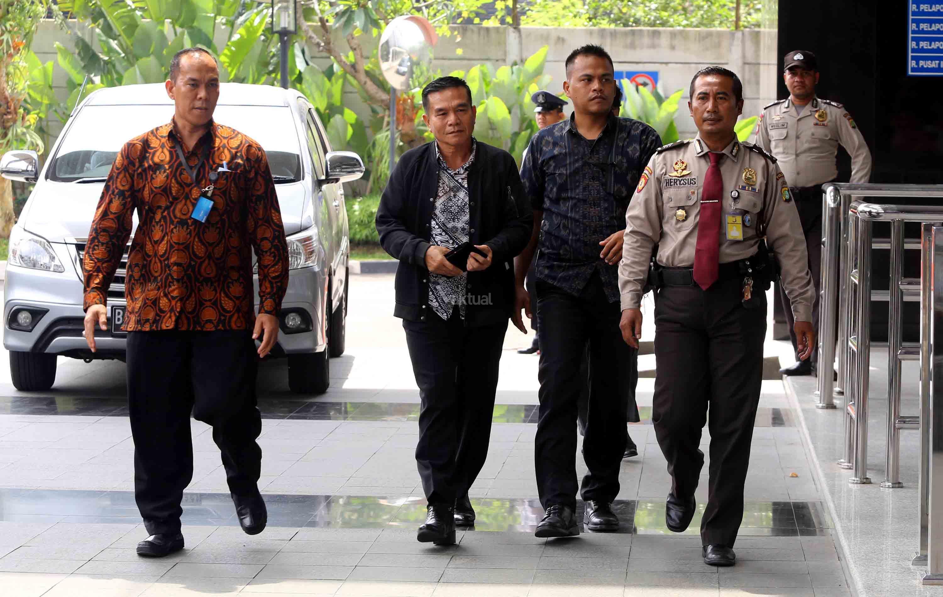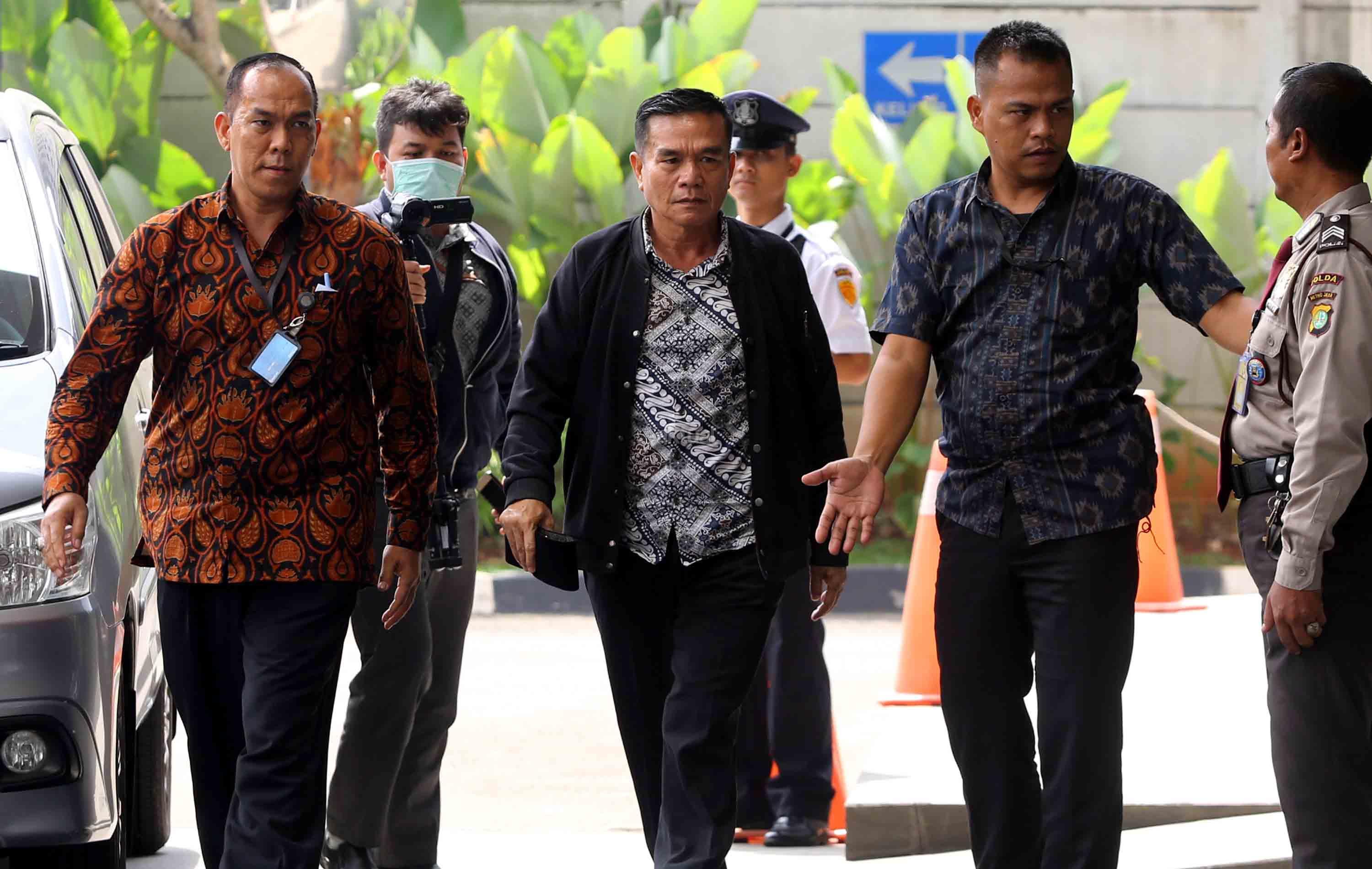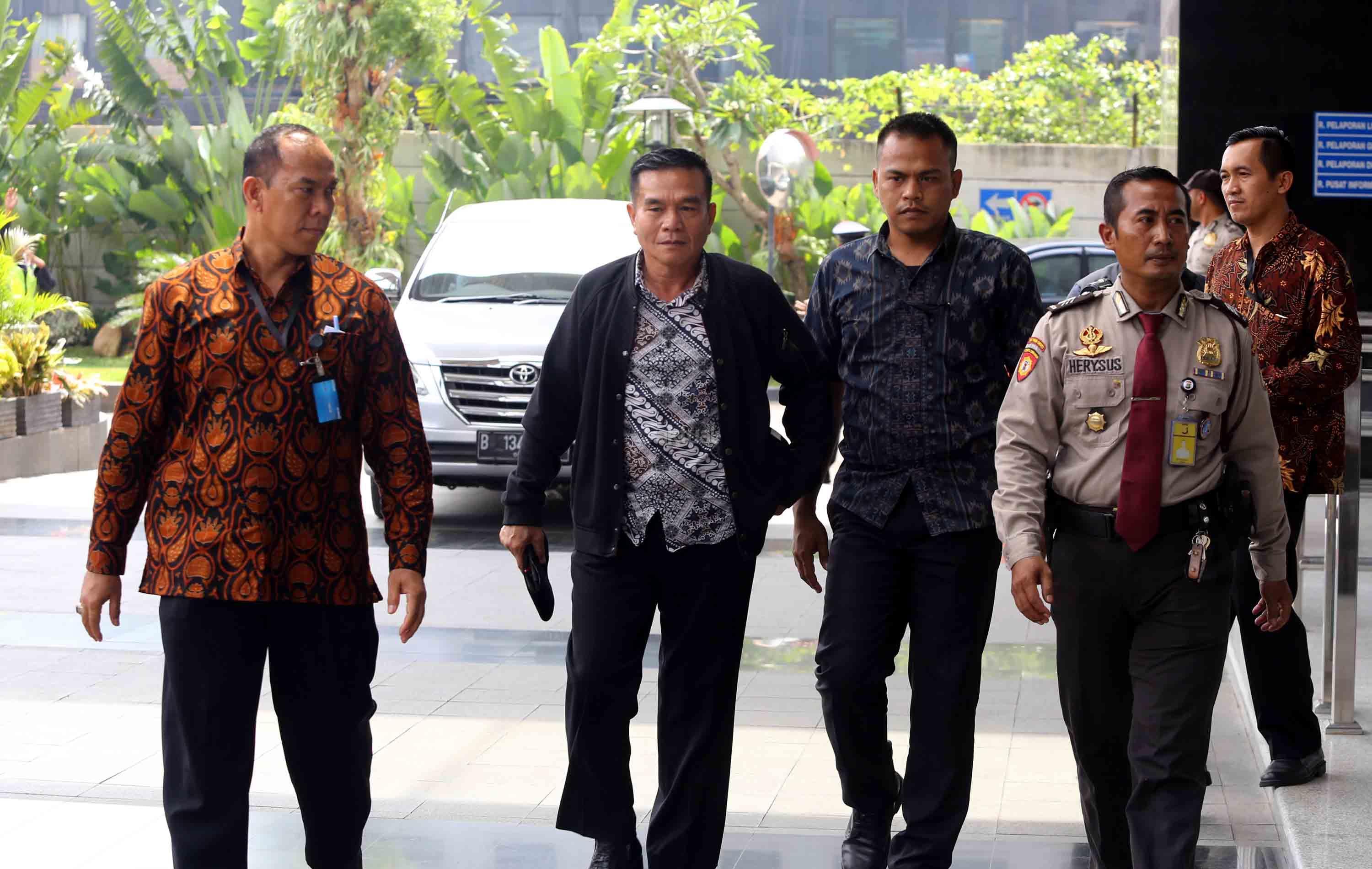 Bupati Bengkulu Selatan Dirwan Mahmud (tengah) digiring petugas saat tiba untuk menjalani pemeriksaan di gedung KPK, Jakarta, Rabu (16/5/18). KPK melakukan Operasi Tangkap Tangan (OTT) terhadap Bupati Bengkulu Selatan Dirwan Mahmud di kediamannya. Dari OTT tersebut turut terjaring istri dari Dirwan Mahmud, Heni Dirwan, wiraswasta JU, dan WA dengan barang bukti uang sekitar Rp100 juta. AKTUAL/Tino Oktaviano