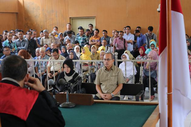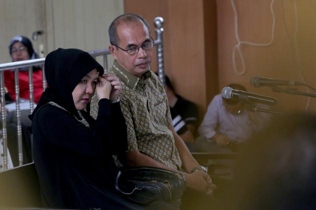 Bupati Musi Banyuasin (Muba) non aktif Pahri Azhari (kanan) dan Istri Lucianty Pahri (kiri) yang menjadi terdakwa pemberi suap terkait Laporan Keterangan Pertanggung Jawaban (LKPJ) 2014 dan pengesahan APBD Kabupaten Muba tahun 2015 kepada DPRD Muba mengikuti sidang pembacaan vonis di Pengadilan Tipikor Pengadilan Negeri (PN) Klas I Palembang, Sumatera Selatan, Selasa (3/5). Majelis Hakim menjatuhkan vonis kepada Pahri Azhari tiga tahun kurungan penjara dan denda Rp100 juta subsider tiga bulan kurungan, sementara istrinya Lucianty Pahri satu tahun lima bulan kurungan penjara dan denda Rp100 juta subsider tiga bulan kurungan. ANTARA FOTO/Nova Wahyudi/foc/16.