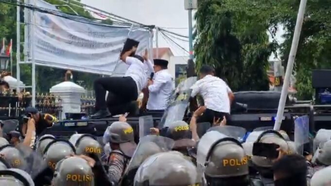 Unjuk rasa yang menuntut pengunduran diri Sudewo itu berubah ricuh. Massa melempar air minum, berusaha menerobos gerbang kantor bupati, dan membakar satu unit mobil provos milik Polres Grobogan.