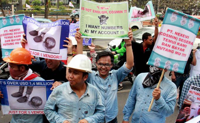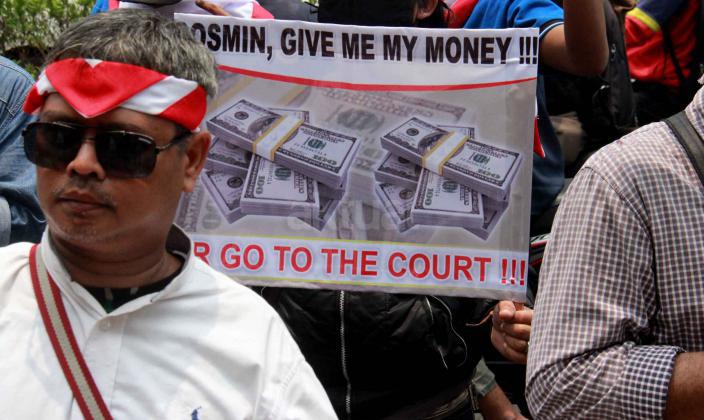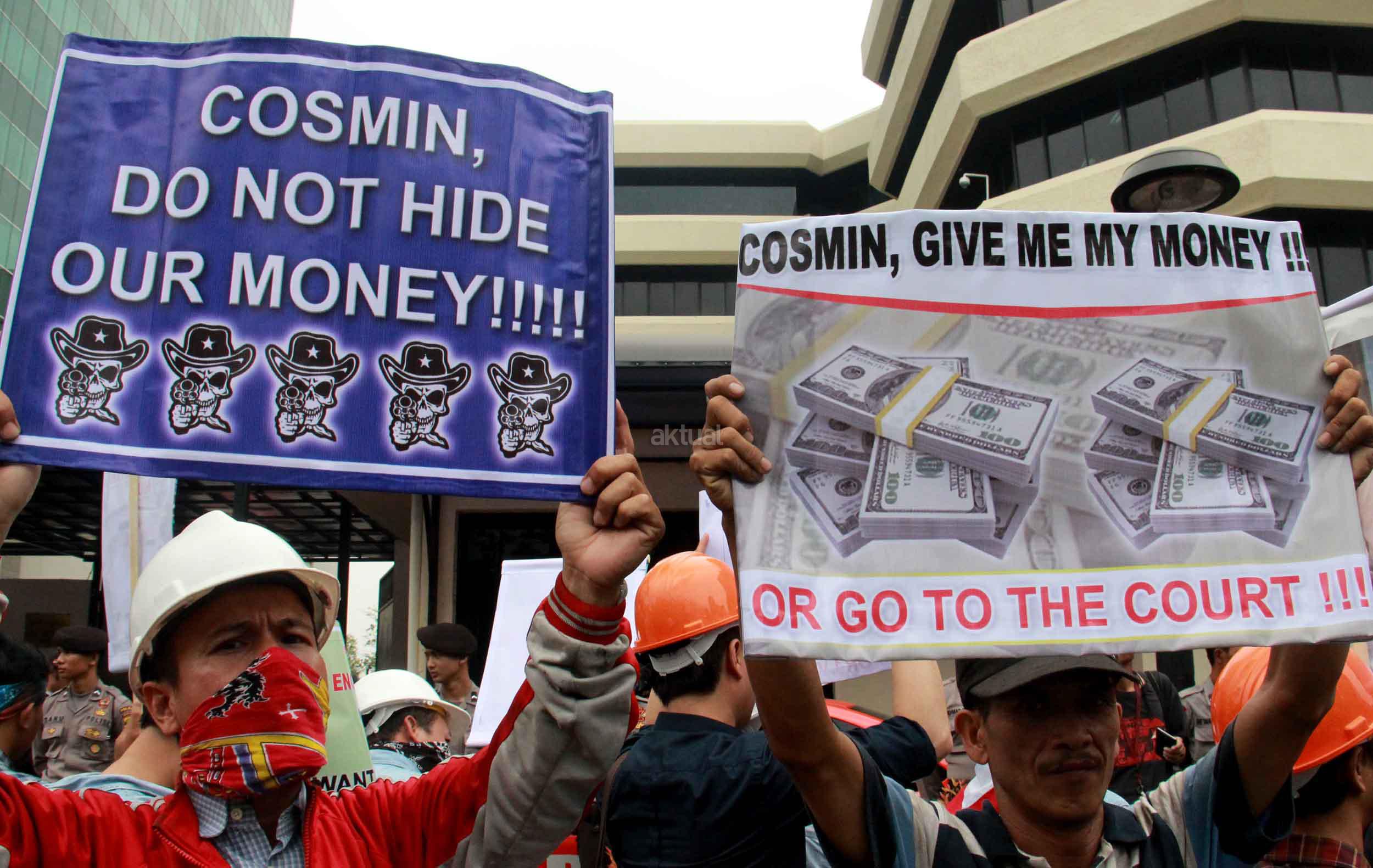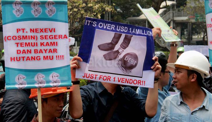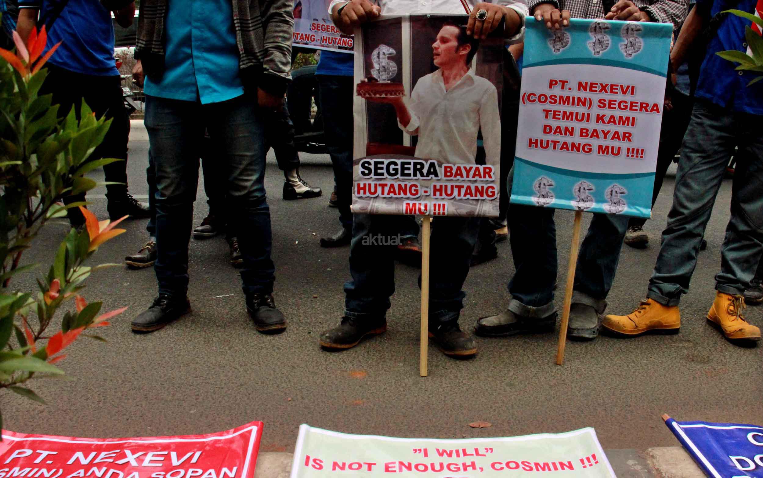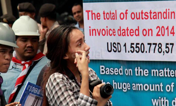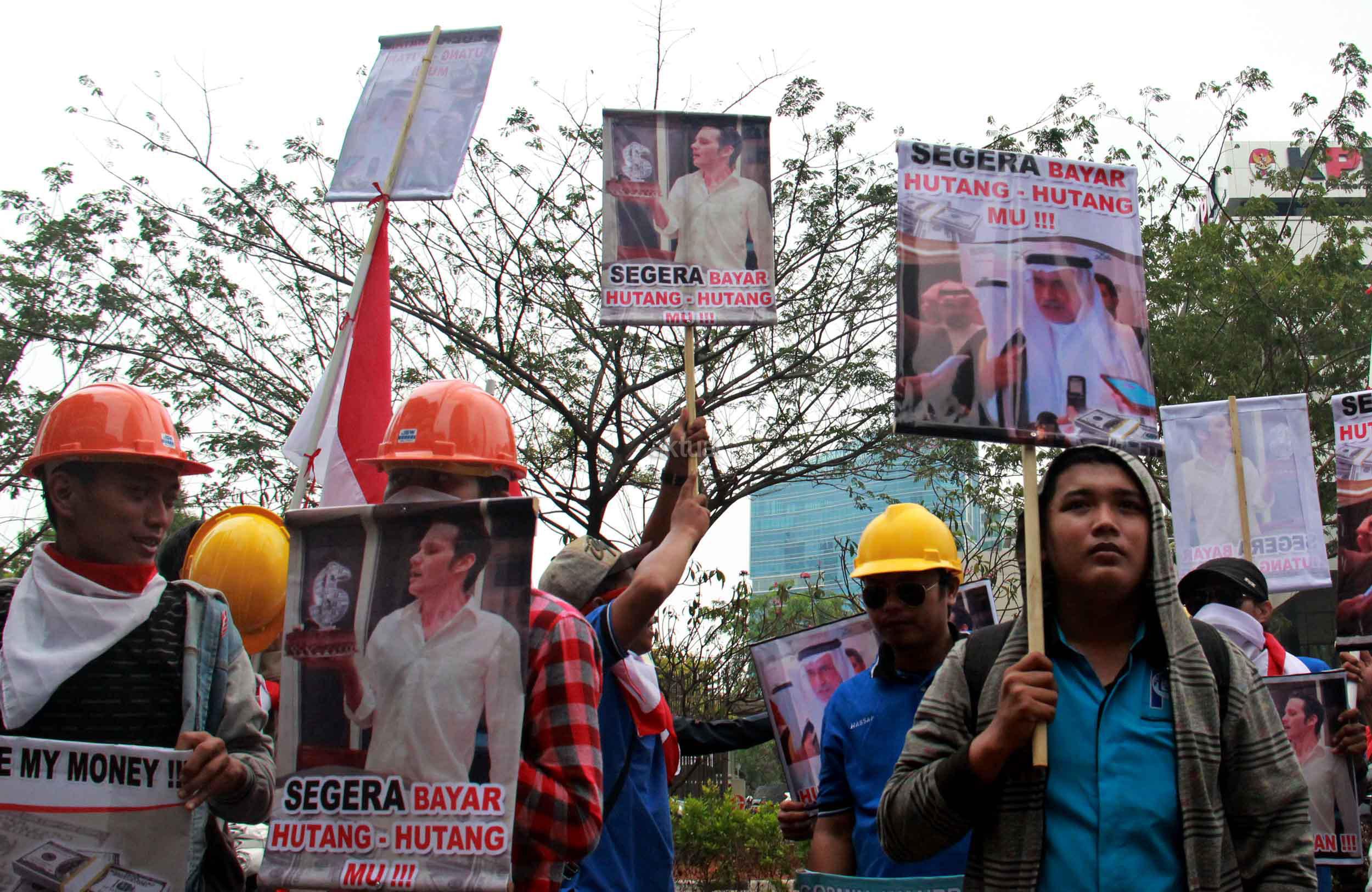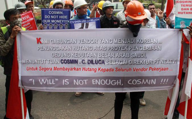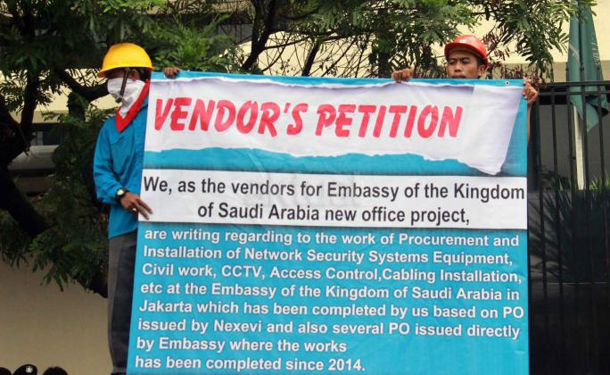 Puluhan pekerja dari beberapa vendor pengerjaan bangunan kembali melakukan aksi di depan Kedubes Arab Saudi, Jalan. HR.Rasuna Said, Jakarta Selatan, Rabu (7/10/2015). Dalam aksinya para pengunjuk rasa menuntut pihak Kedubes Arab Saudi membayarkan sisa pengerjaan bangunan Kedubes yang hingga kini belum dibayarkan.