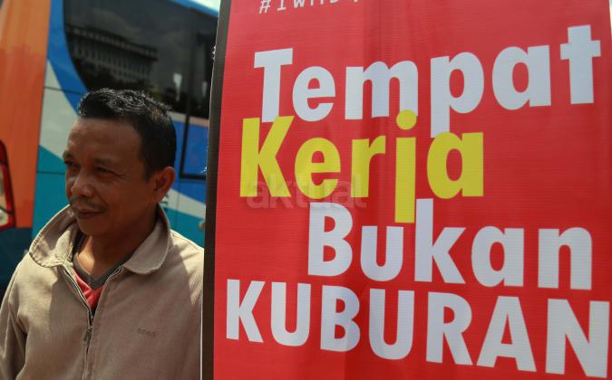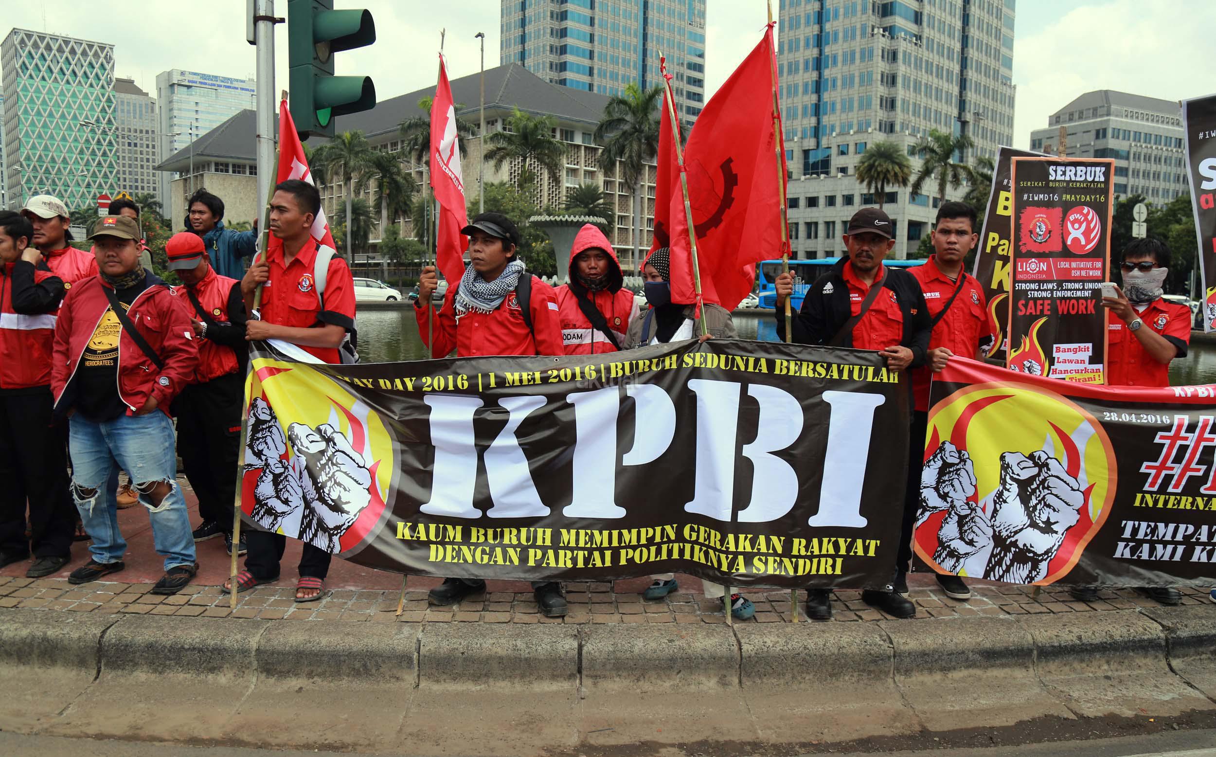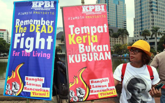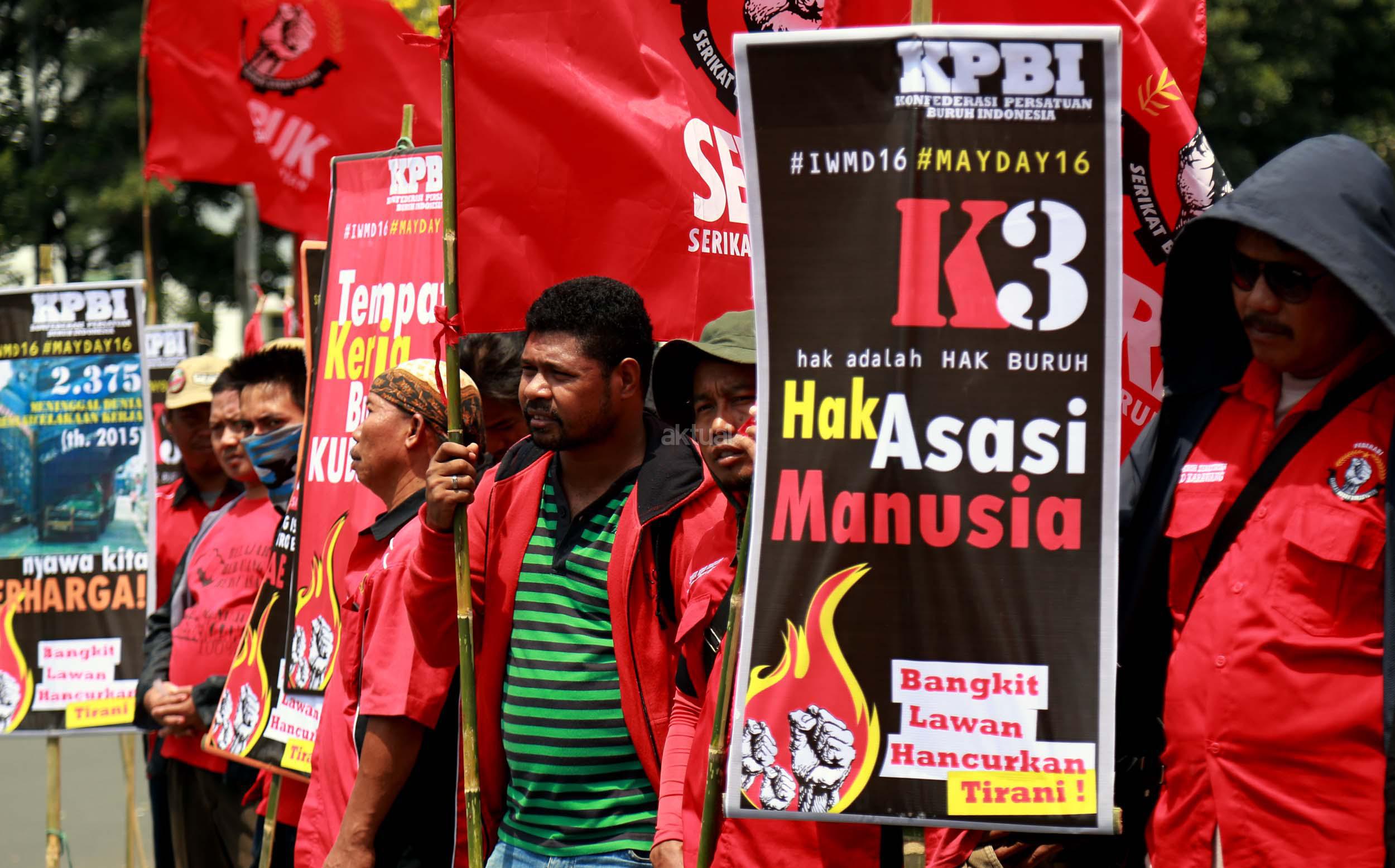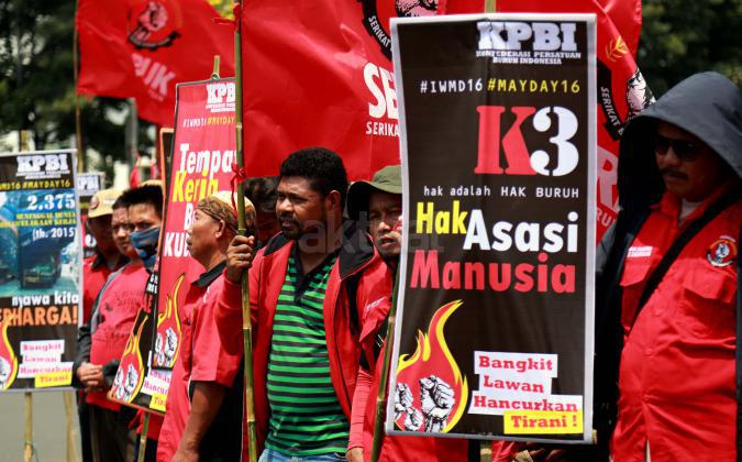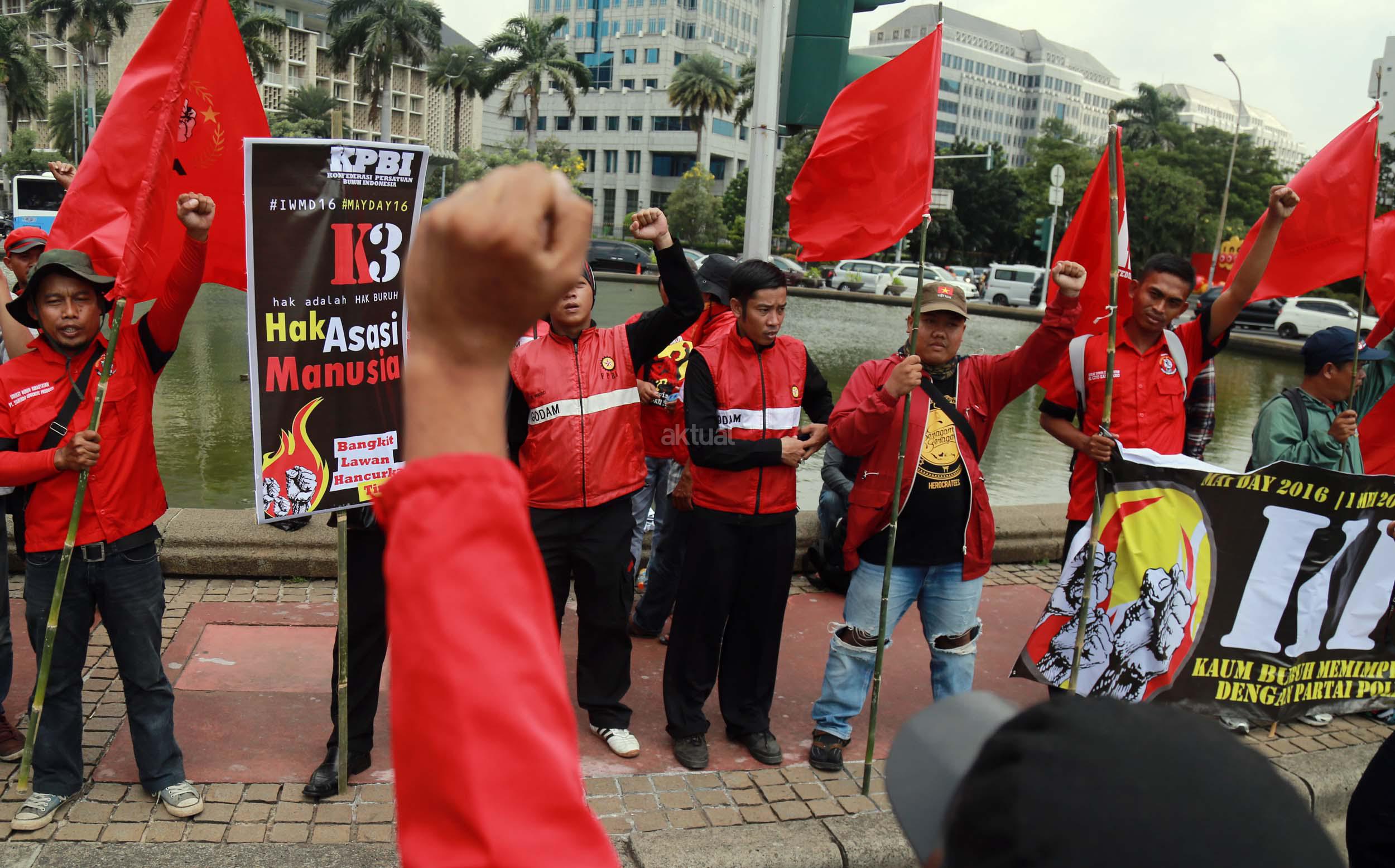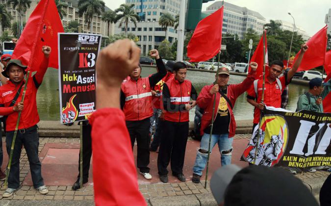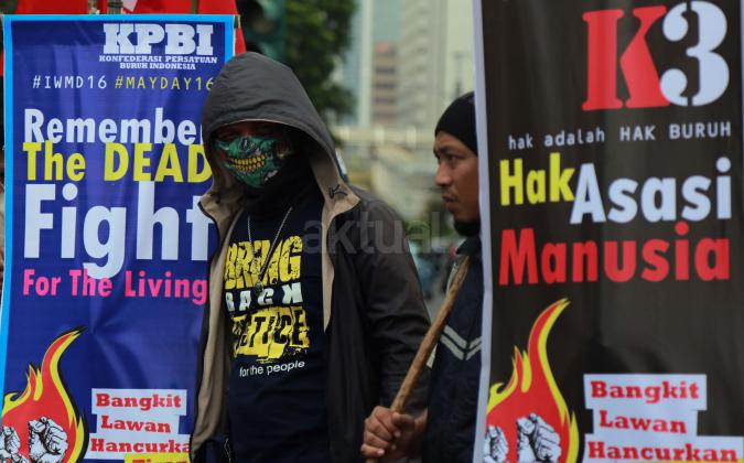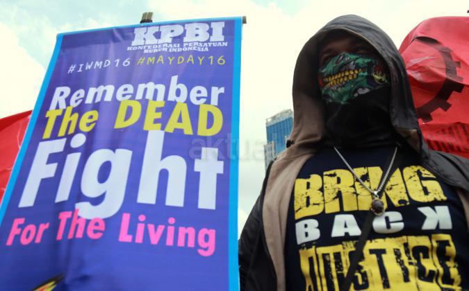 Puluhan buruh yang tergabung dalam Komite Persiapan Konfederasi Persatuan Buruh Indonesia (KP-KPBI) melakukan aksi di Jakarta, Kamis (28/4/2016). Dalam aksinya para buruh memperingati International Workers' Memorial Day (Peringatan Terhadap Kematian Pekerja) yang jatuh pada tanggal 28 April.