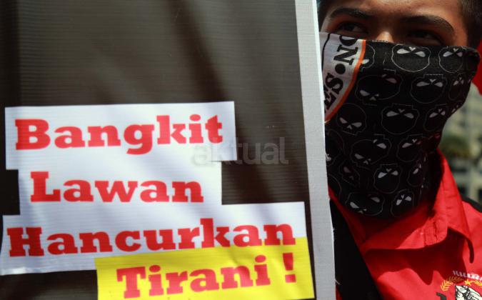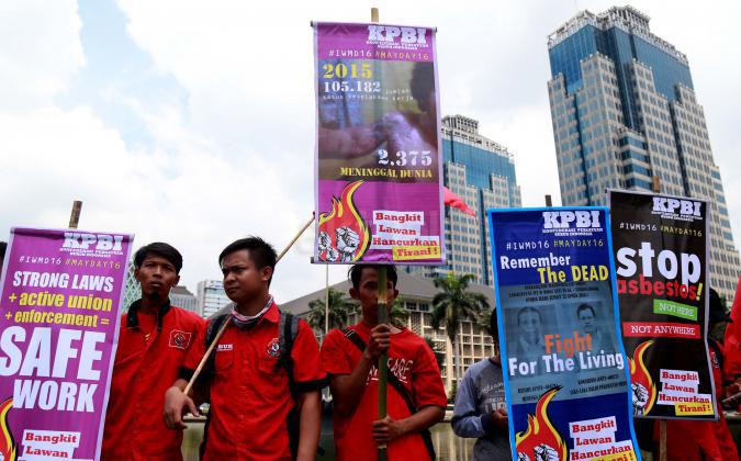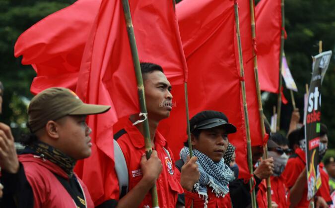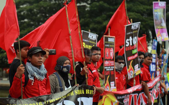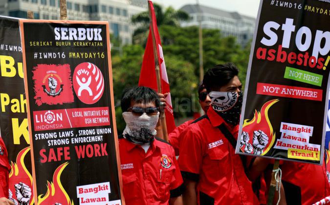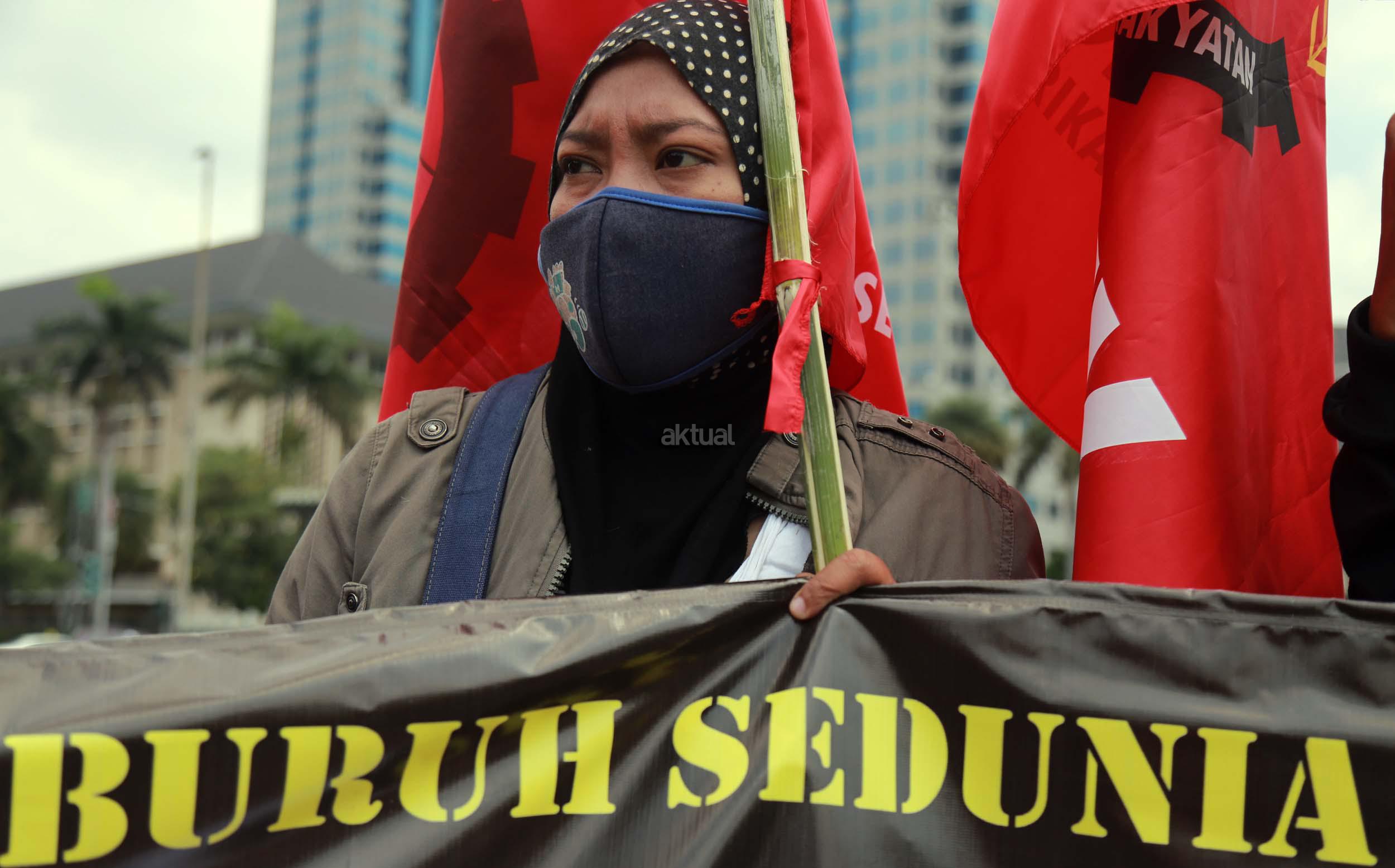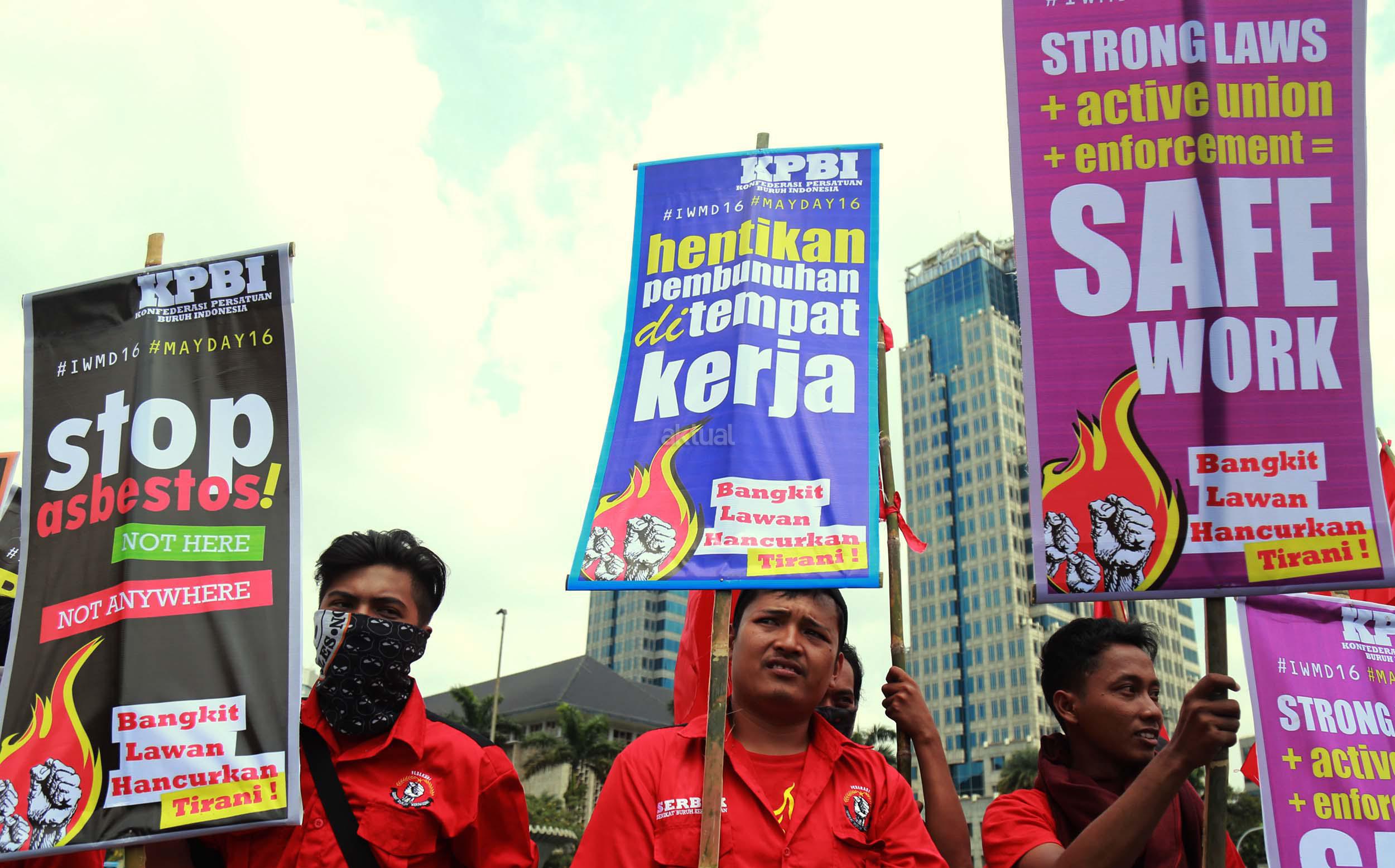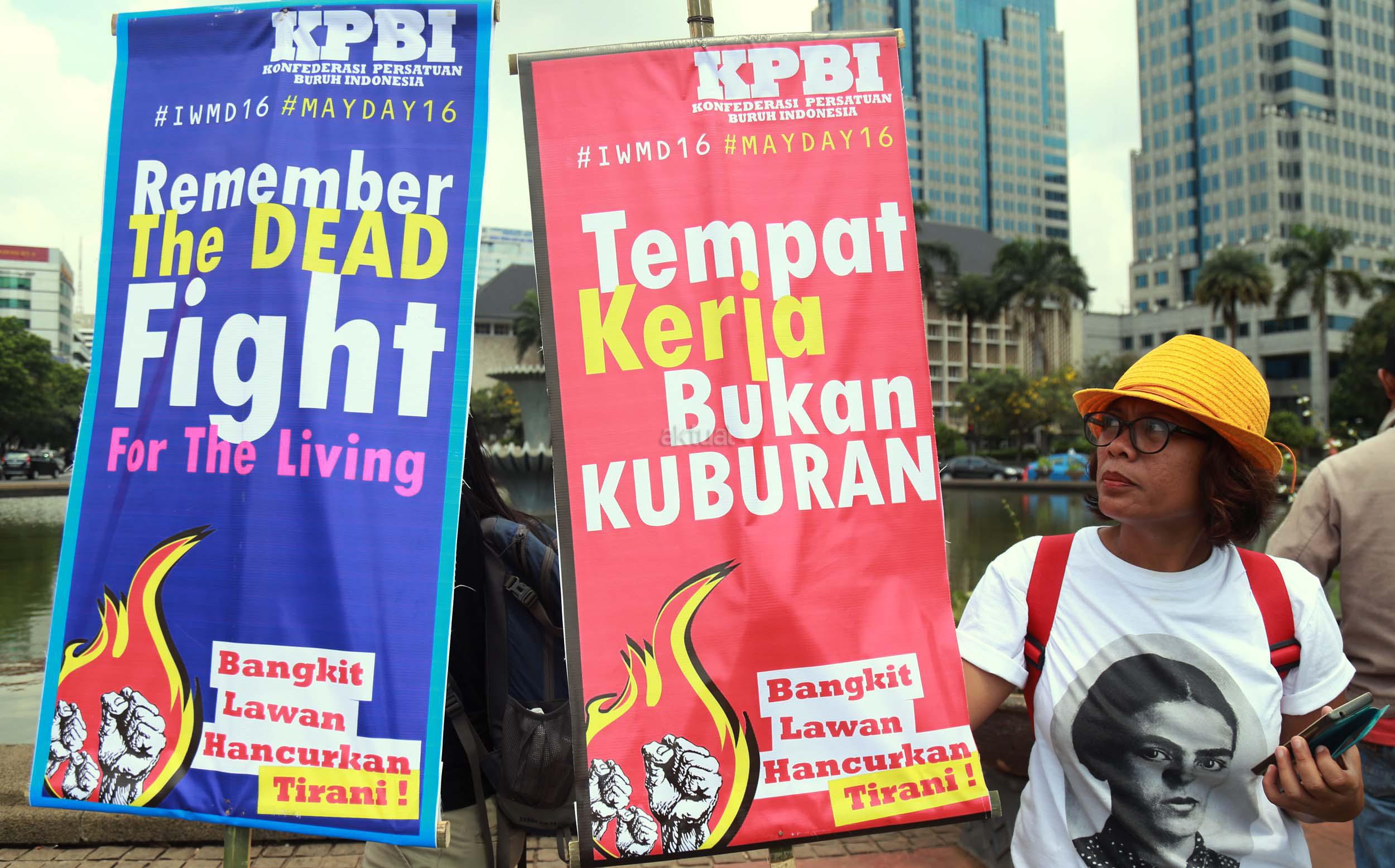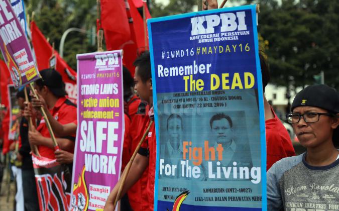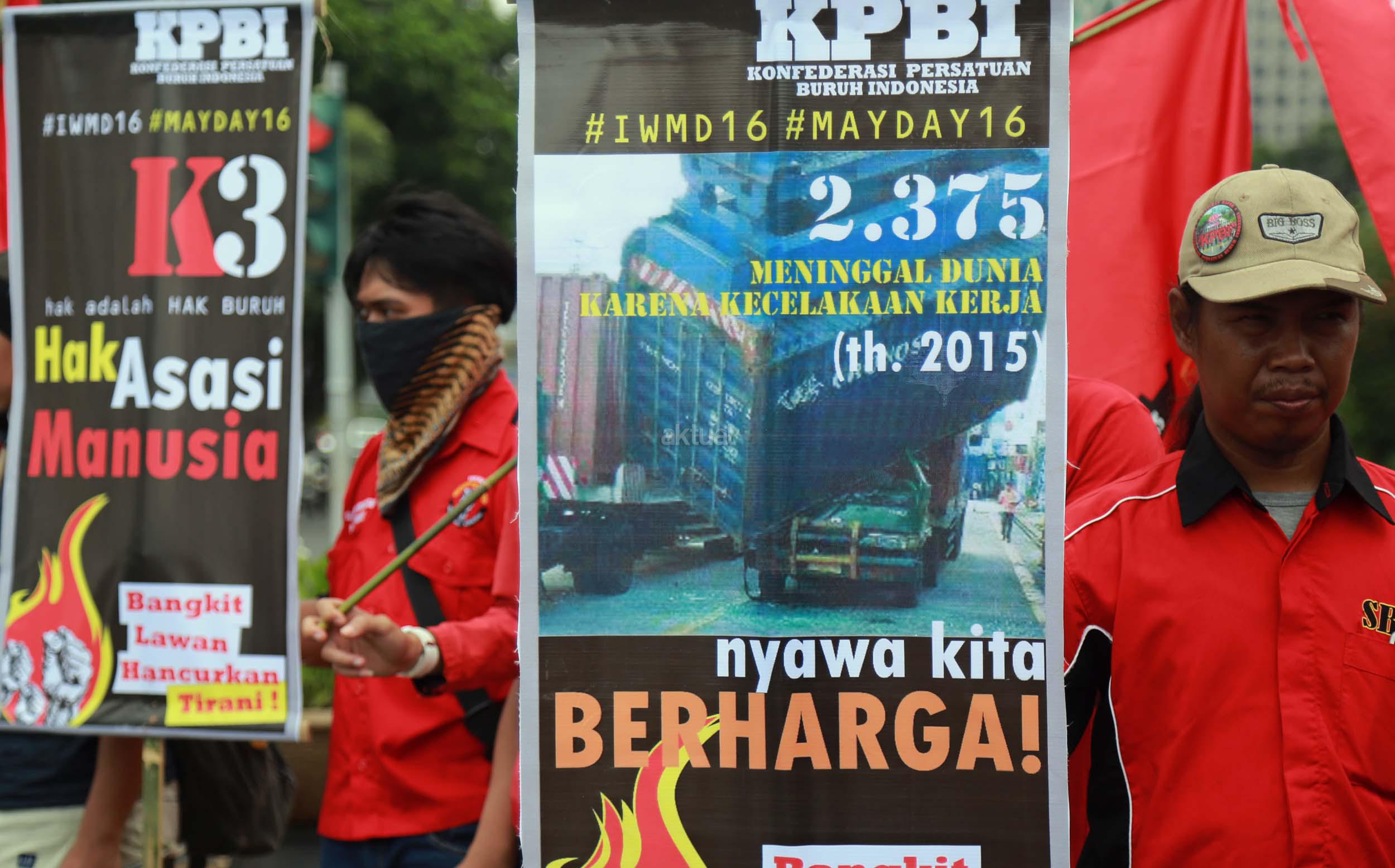 Puluhan buruh yang tergabung dalam Komite Persiapan Konfederasi Persatuan Buruh Indonesia (KP-KPBI) melakukan aksi di Jakarta, Kamis (28/4/2016). Dalam aksinya para buruh memperingati International Workers' Memorial Day (Peringatan Terhadap Kematian Pekerja) yang jatuh pada tanggal 28 April.