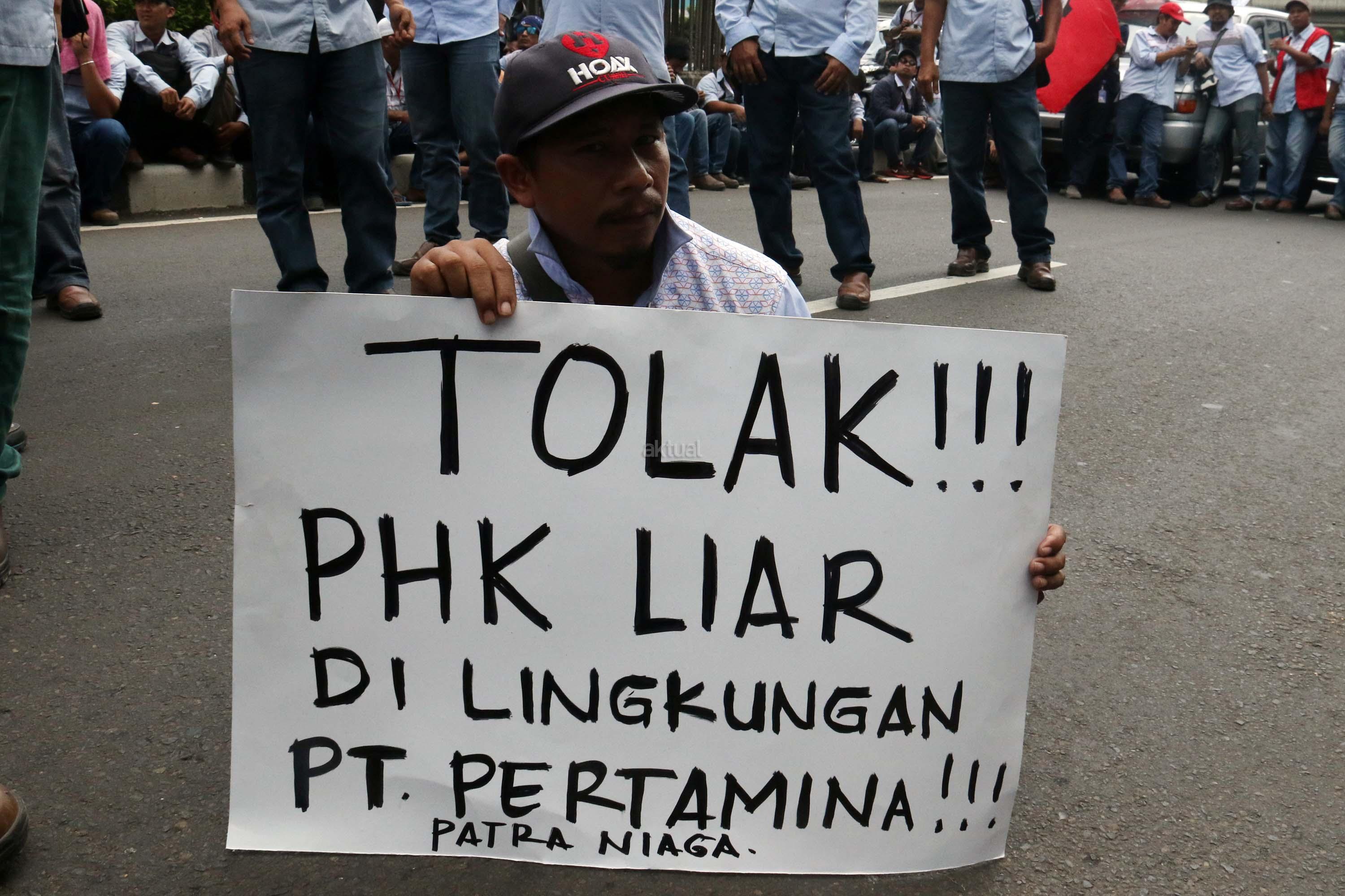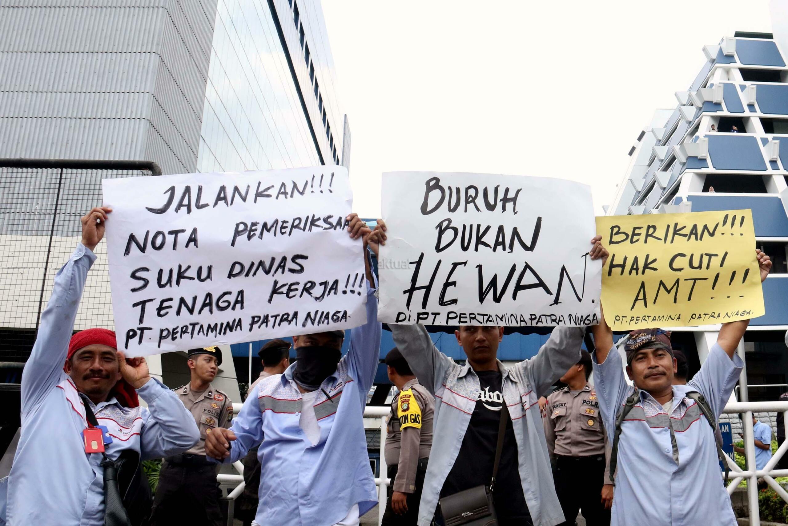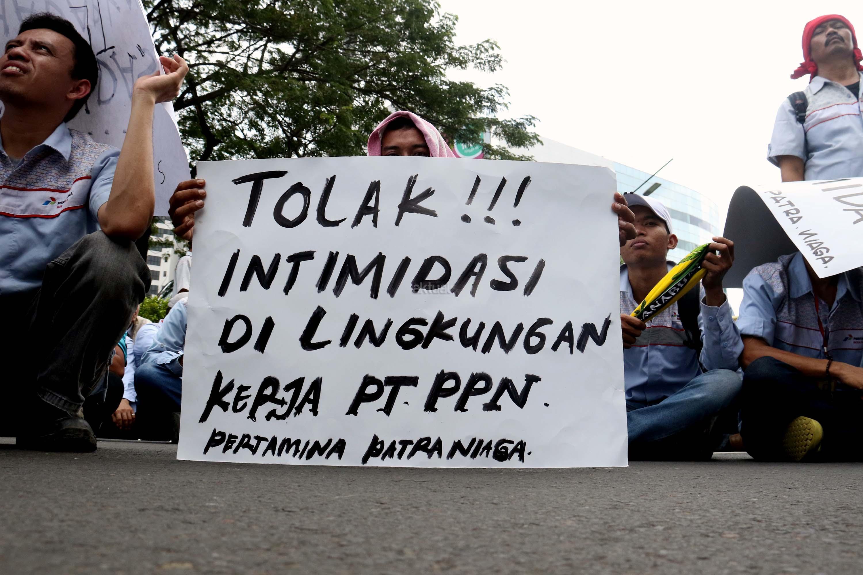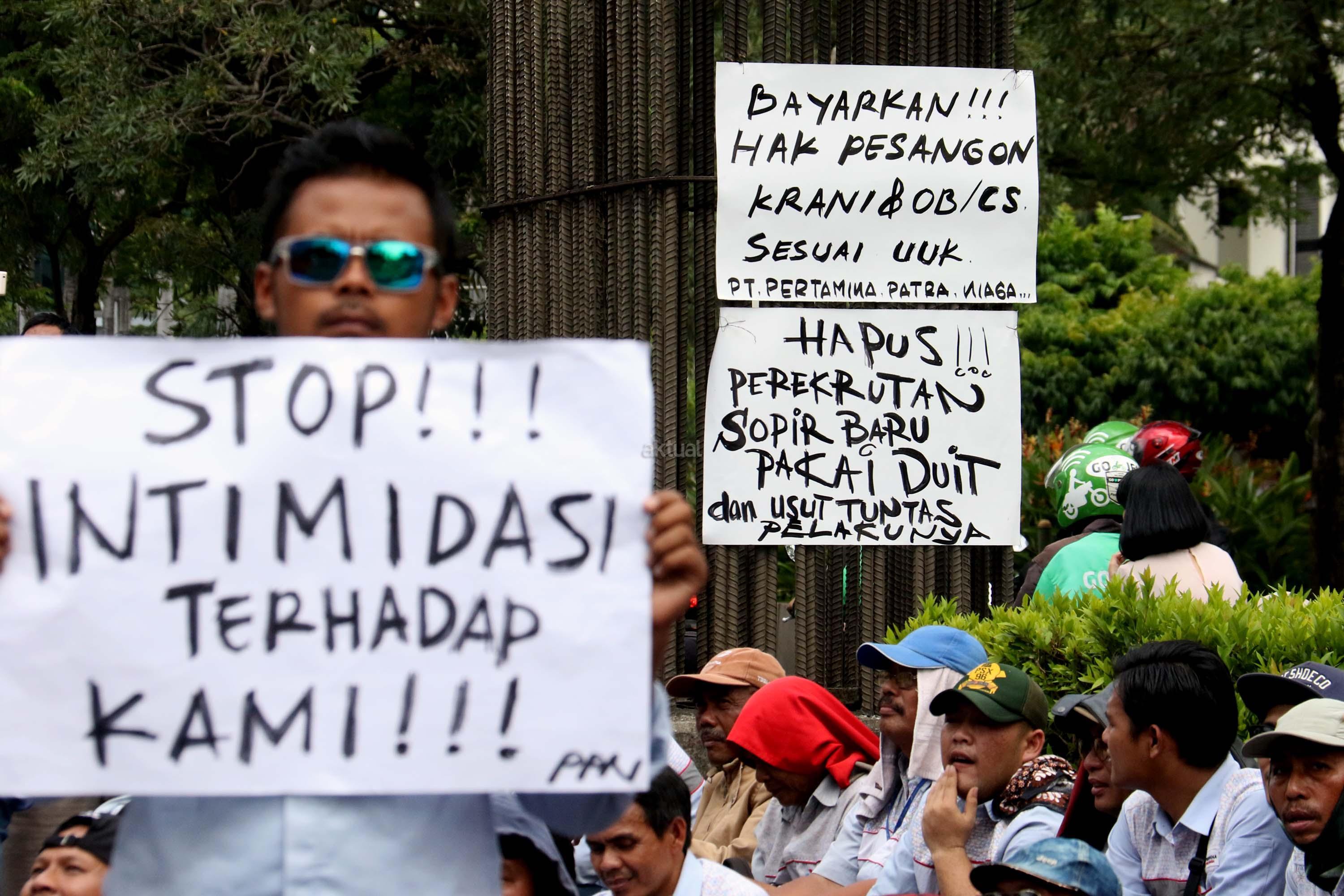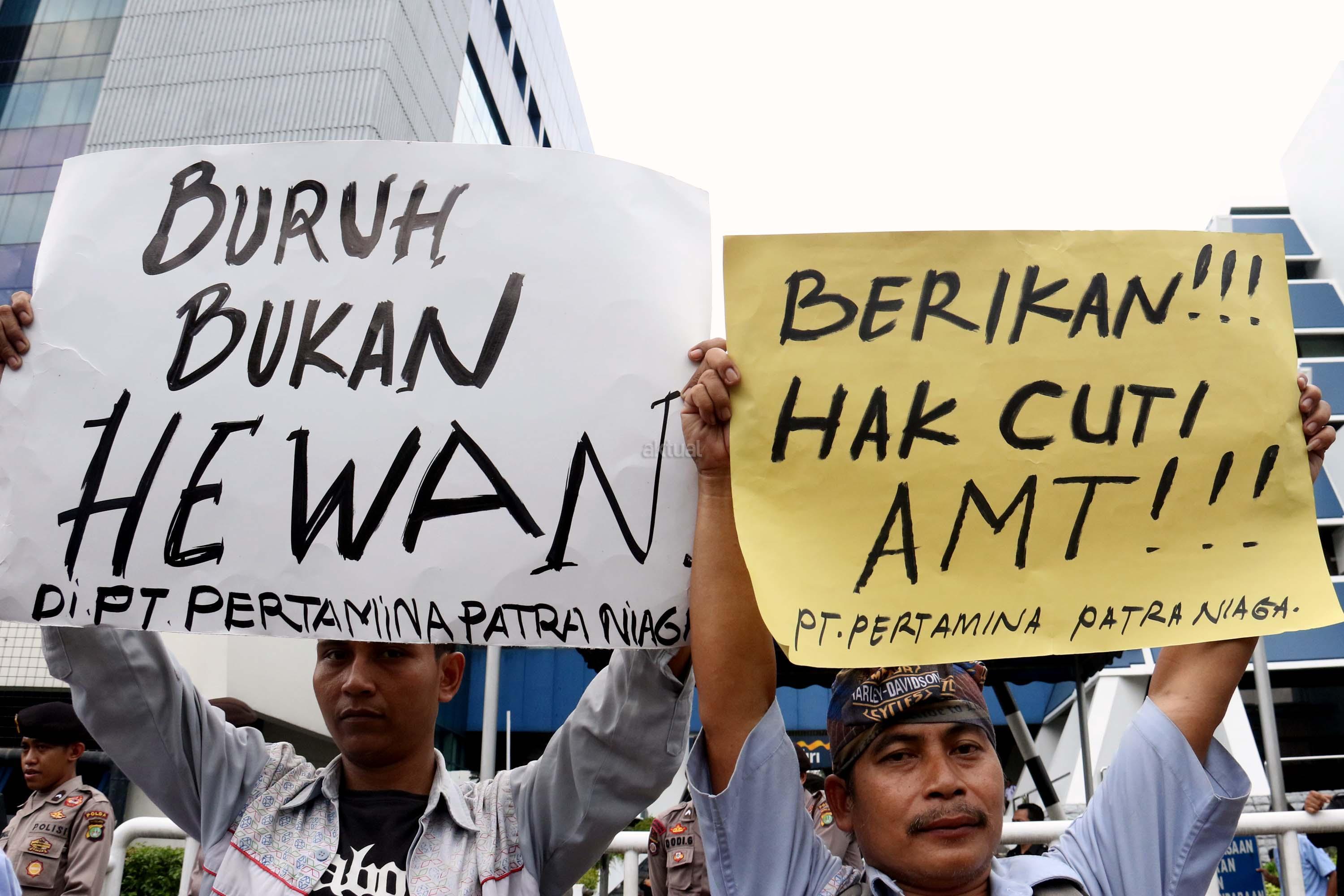 Ratusan buruh awak mobil tangki Pertamina Patra Niaga yang tergabung dalam Serikat Federasi Buruh Transportasi Pelabuhan Indonesia (FBTPI) melakukan aksi didepan kantor pusat Pertamina Patra Niaga, Jalan. HR.Rasuna Said, Jakarta Selatan, Rabu (31/5/2017). Dalam aksinya para buruh awak mobil tangki Pertamina Patra Niaga menolak segala bentuk dipecat secara sepihak dan membatalkan PHK ilegal yang dilakukan oleh Pertamina Patra Niaga. AKTUAL/Munzir