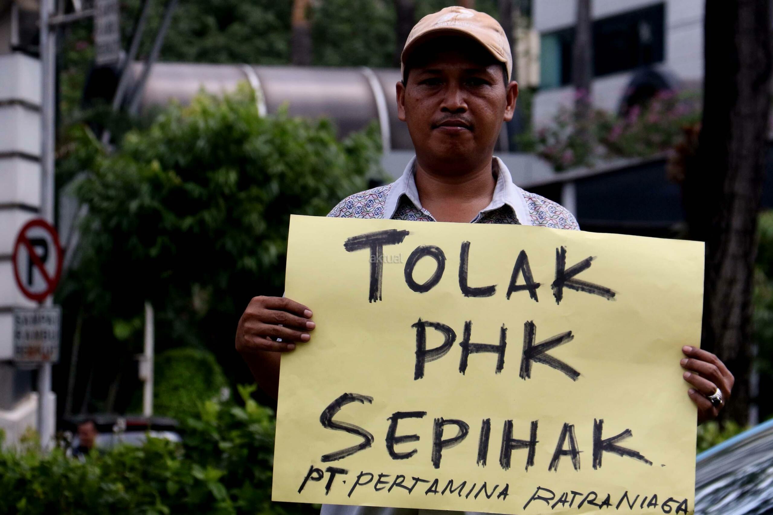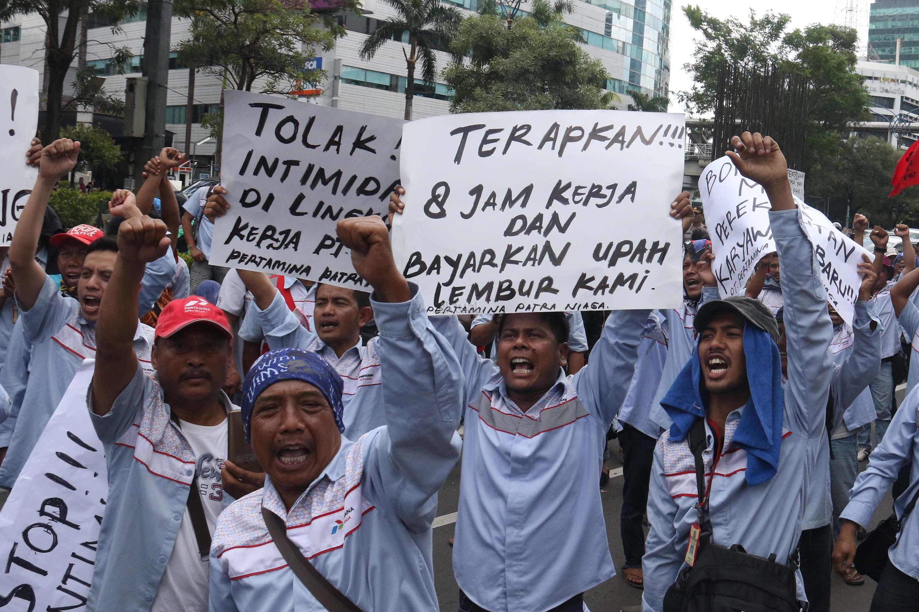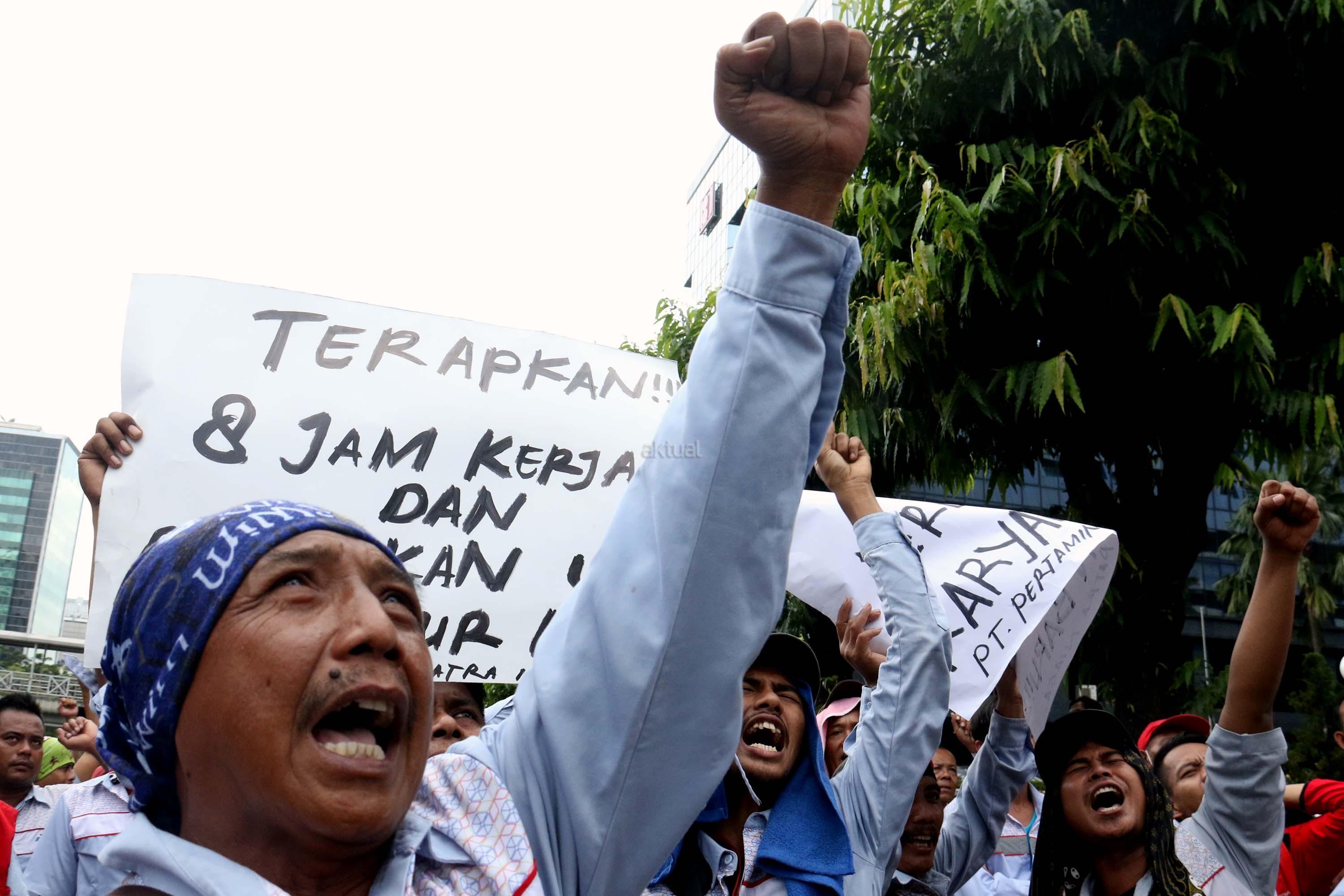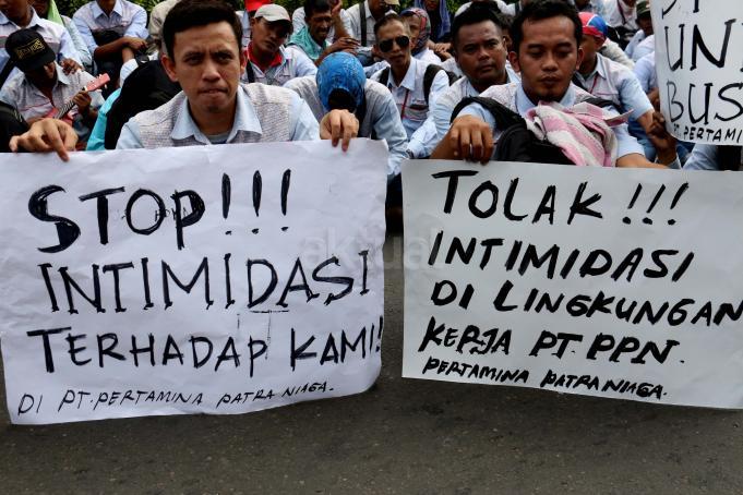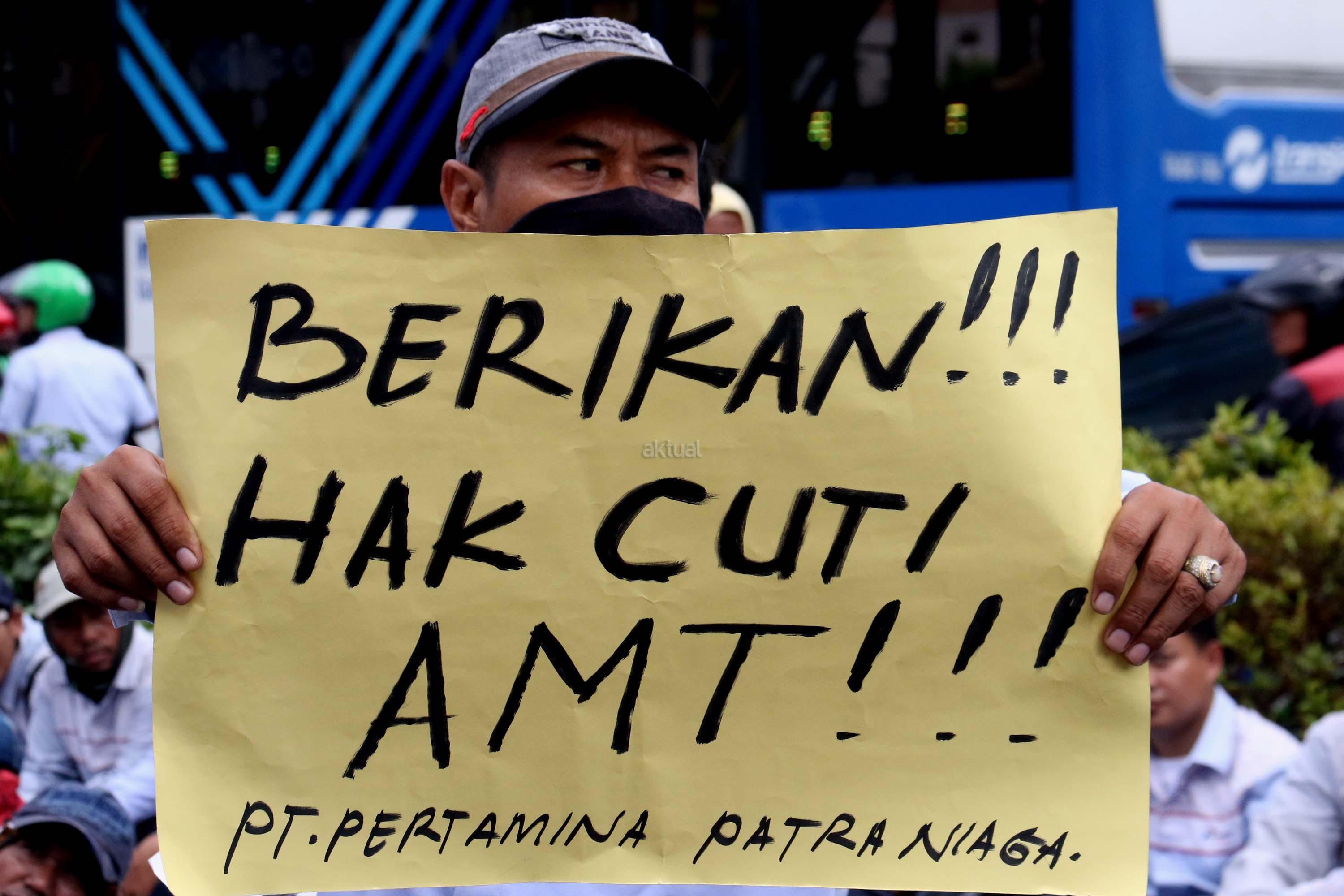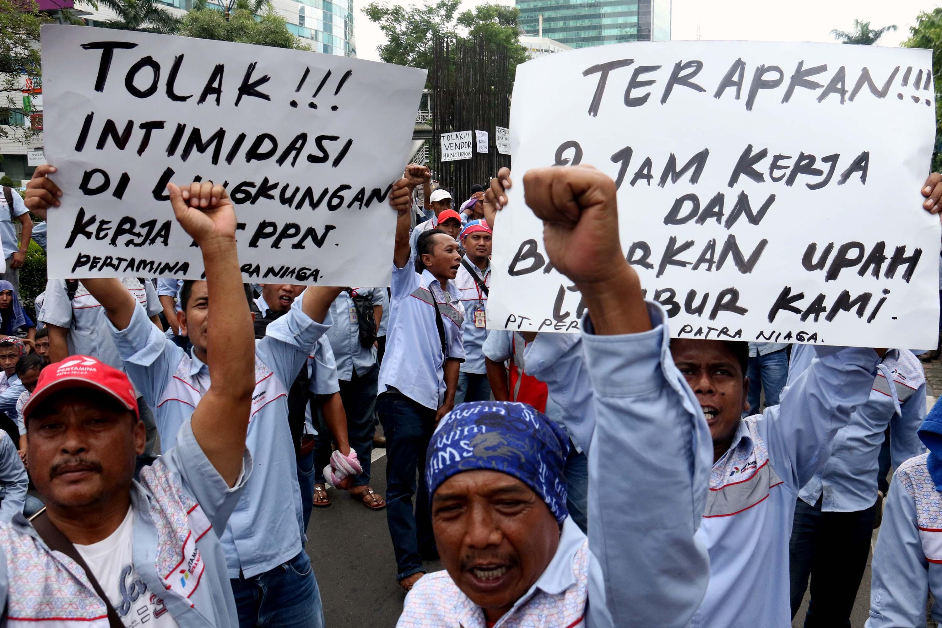 Ratusan buruh awak mobil tangki Pertamina Patra Niaga yang tergabung dalam Serikat Federasi Buruh Transportasi Pelabuhan Indonesia (FBTPI) melakukan aksi didepan kantor pusat Pertamina Patra Niaga, Jalan. HR.Rasuna Said, Jakarta Selatan, Rabu (31/5/2017). Dalam aksinya para buruh awak mobil tangki Pertamina Patra Niaga menolak segala bentuk dipecat secara sepihak dan membatalkan PHK ilegal yang dilakukan oleh Pertamina Patra Niaga. AKTUAL/Munzir