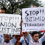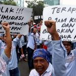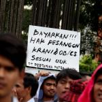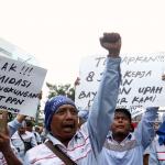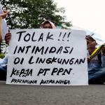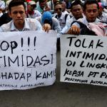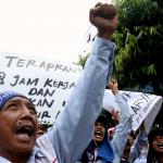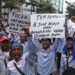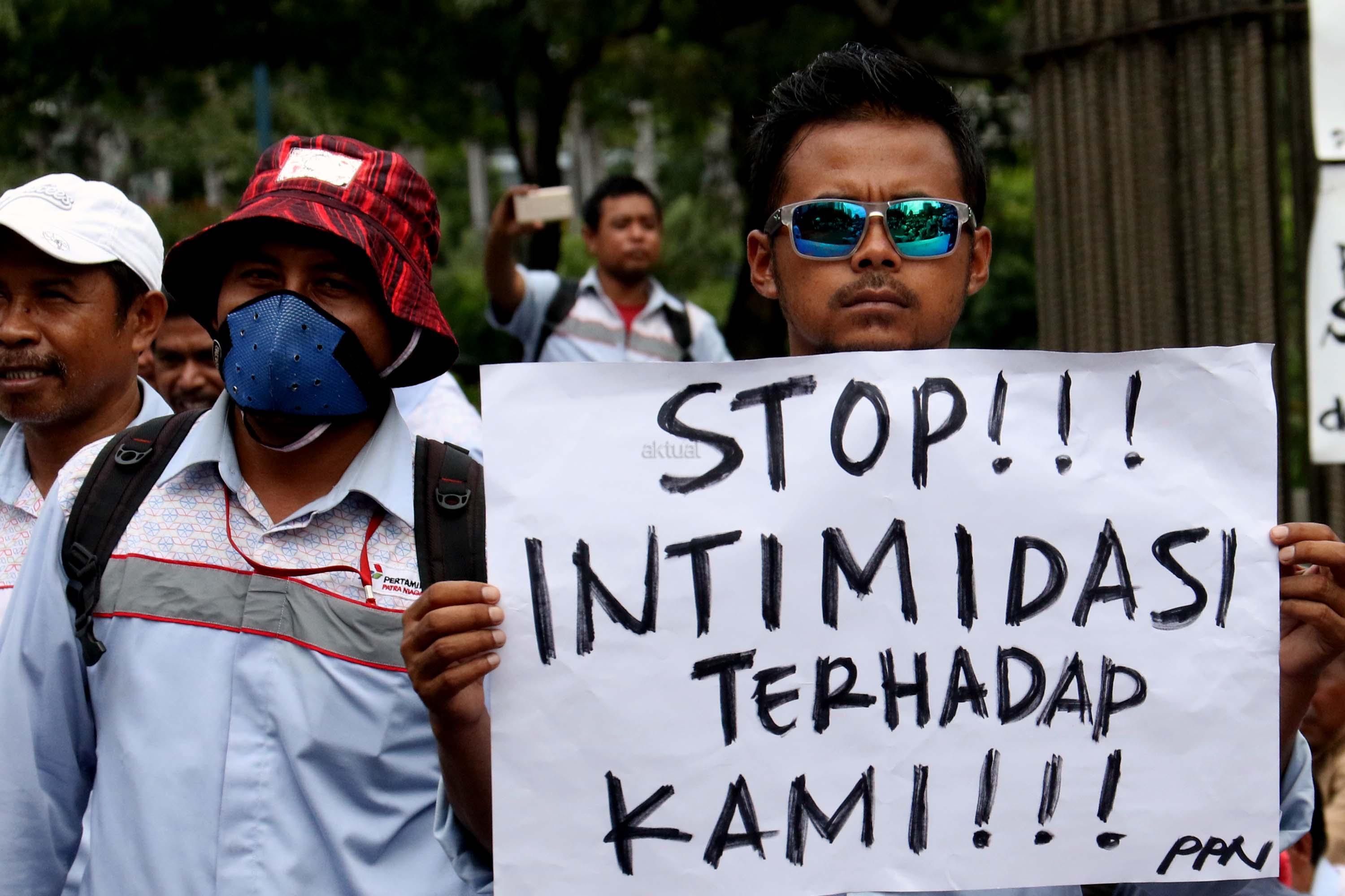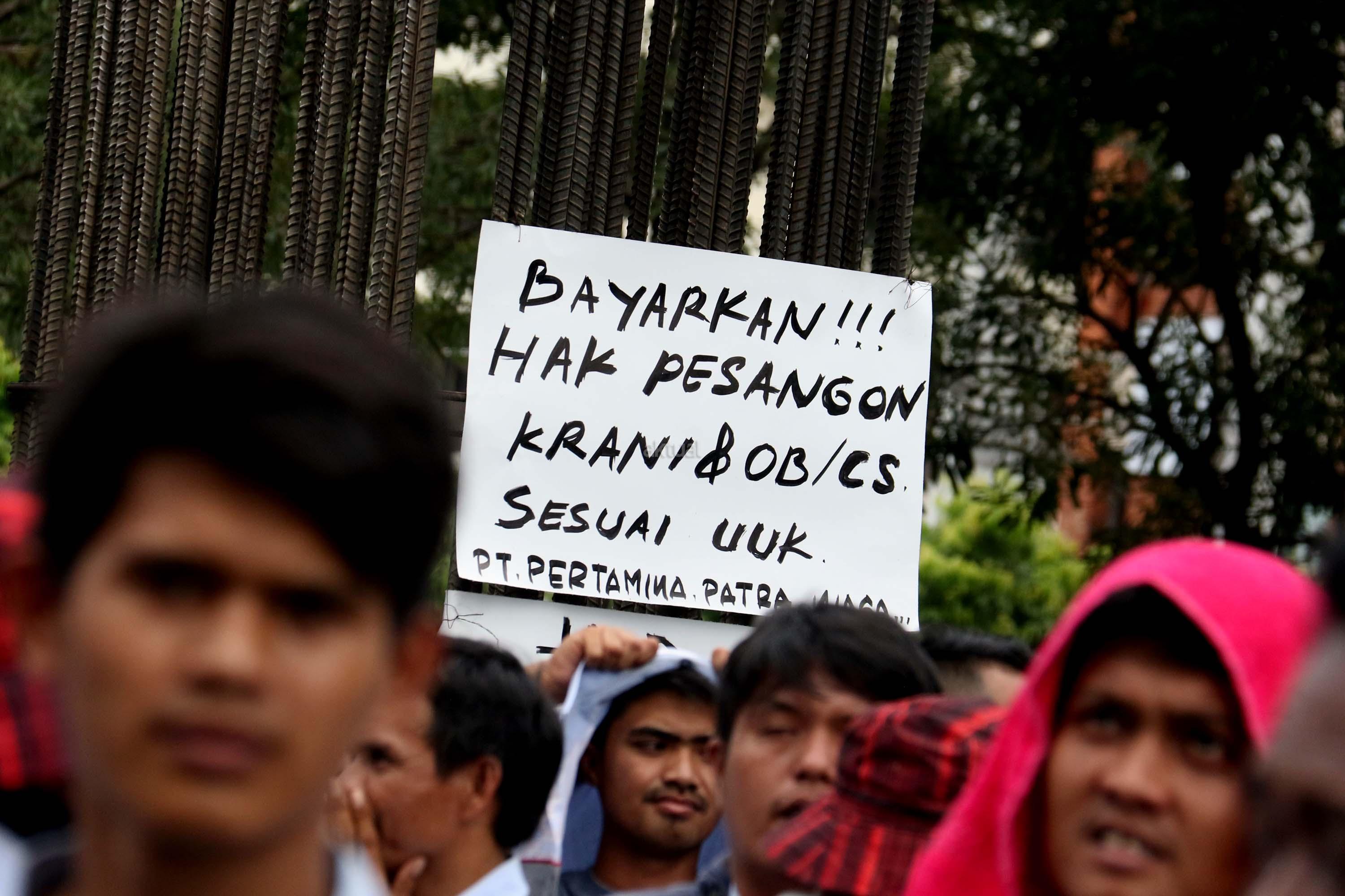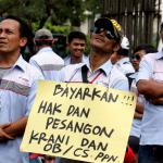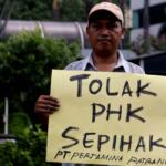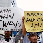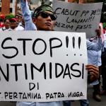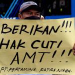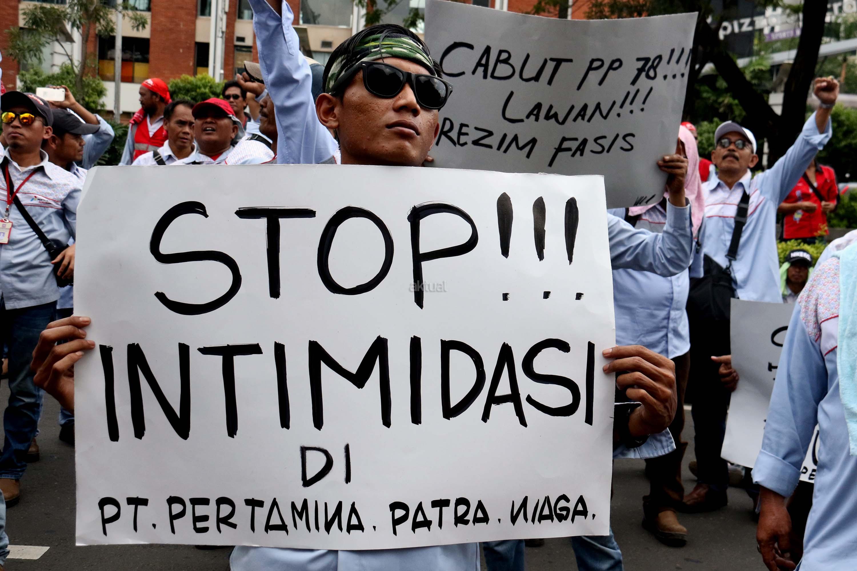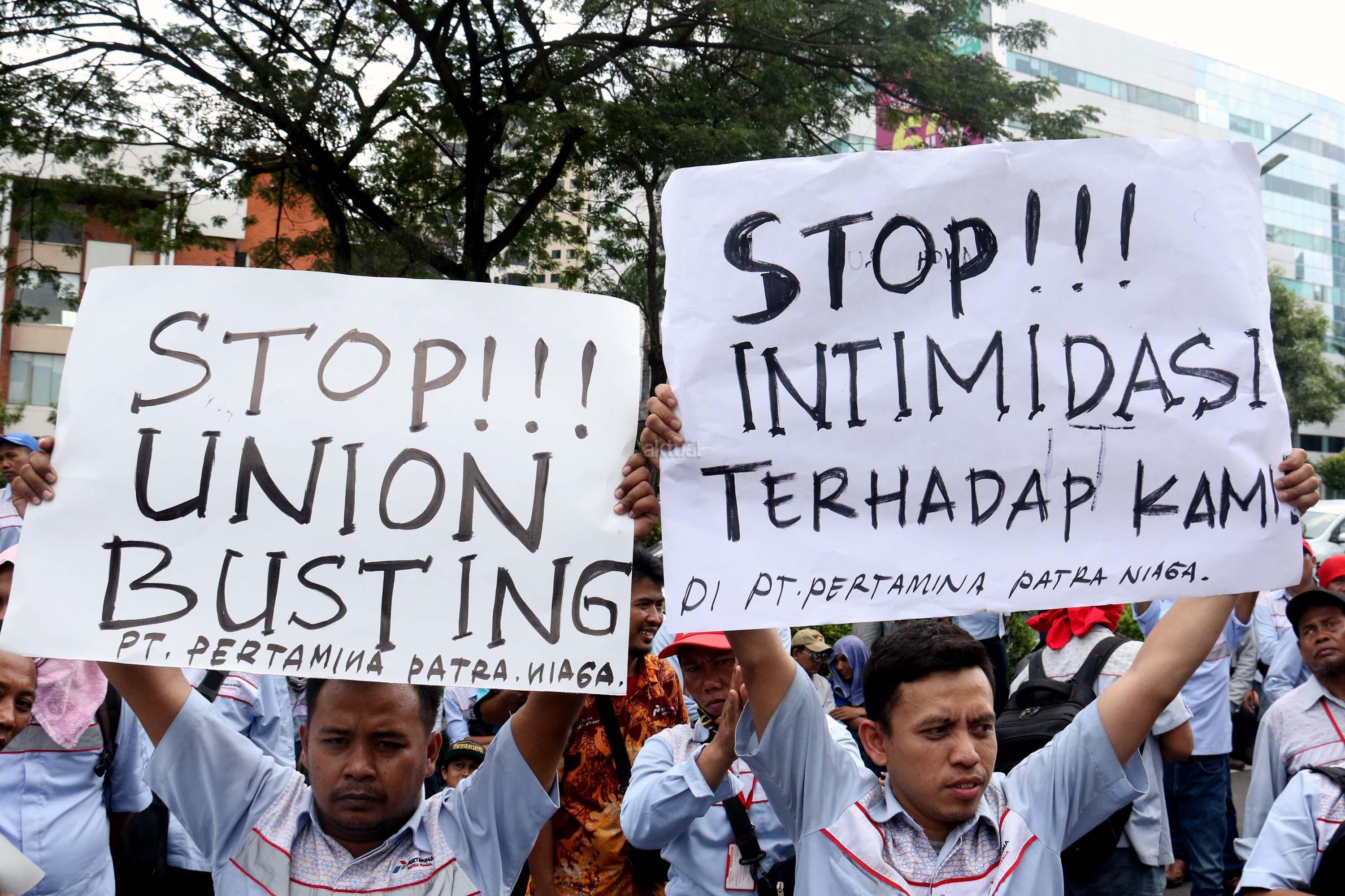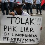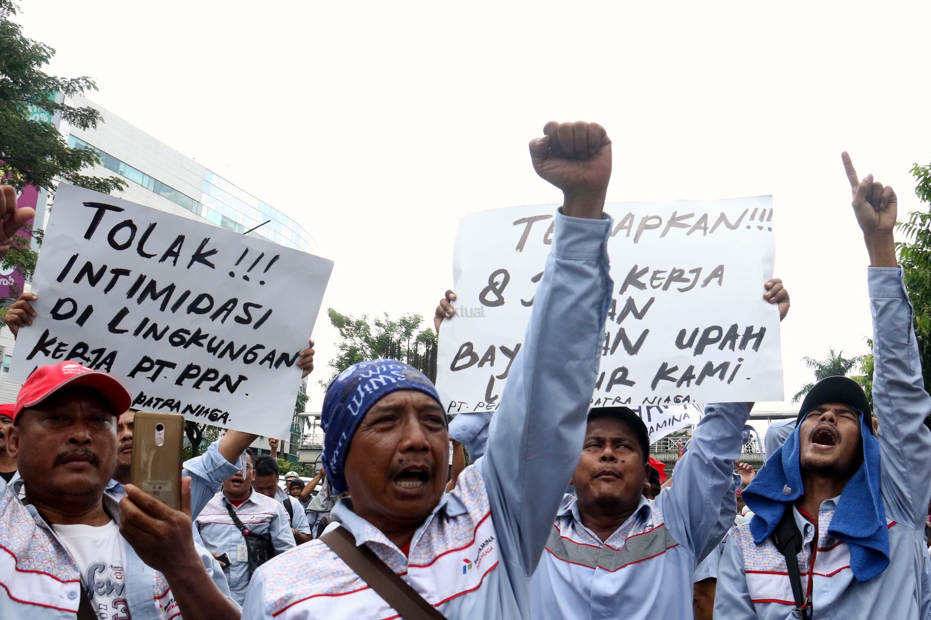 Ratusan buruh awak mobil tangki Pertamina Patra Niaga yang tergabung dalam Serikat Federasi Buruh Transportasi Pelabuhan Indonesia (FBTPI) melakukan aksi didepan kantor pusat Pertamina Patra Niaga, Jalan. HR.Rasuna Said, Jakarta Selatan, Rabu (31/5/2017). Dalam aksinya para buruh awak mobil tangki Pertamina Patra Niaga menolak segala bentuk dipecat secara sepihak dan membatalkan PHK ilegal yang dilakukan oleh Pertamina Patra Niaga. AKTUAL/Munzir