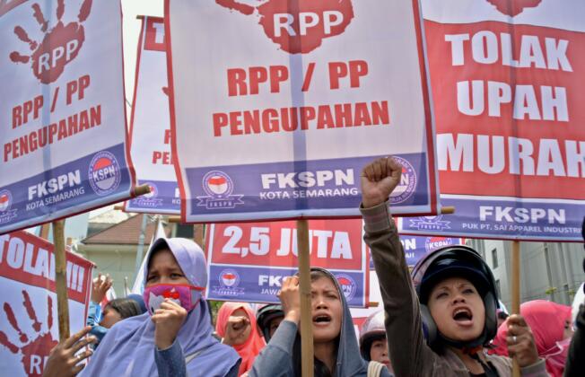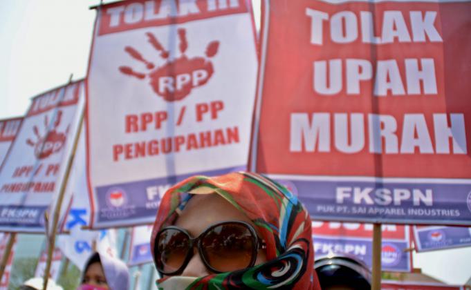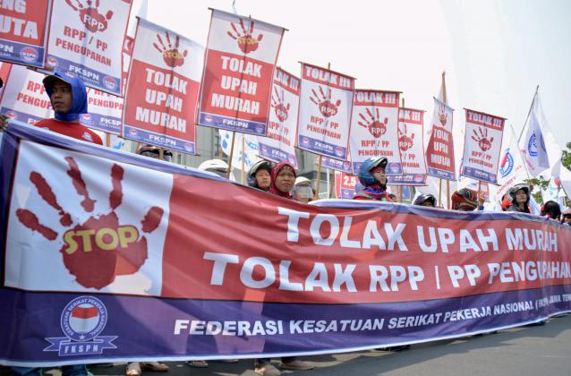 Para buruh yang tergabung dalam Federasi Kesatuan Serikat Pekerja Nasional (FKSPN) membentangkan spanduk dan poster saat berunjuk rasa menuntut upah layak, di Semarang Jateng, Senin (26/10). Mereka juga menolak Peraturan Pemerintah tentang Pengupahan karena dinilai merupakan politik upah murah dan bertentangan dengan regulasi yang ada. ANTARA FOTO/R. Rekotomo/foc/15.