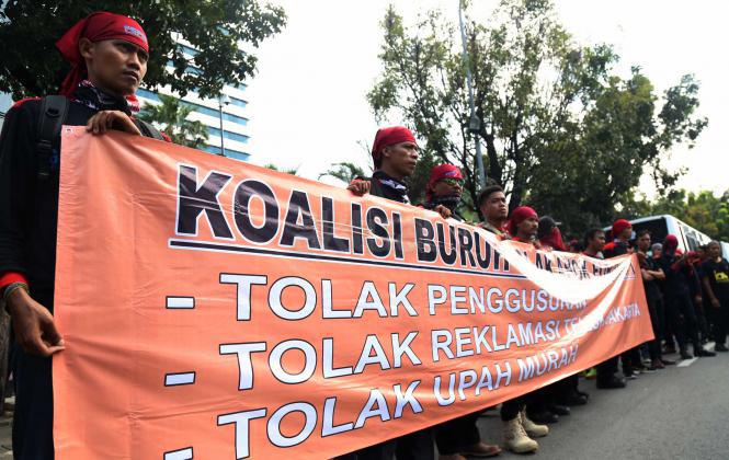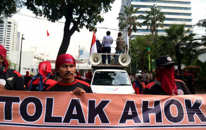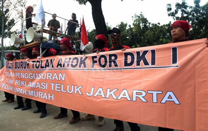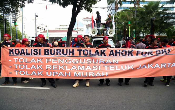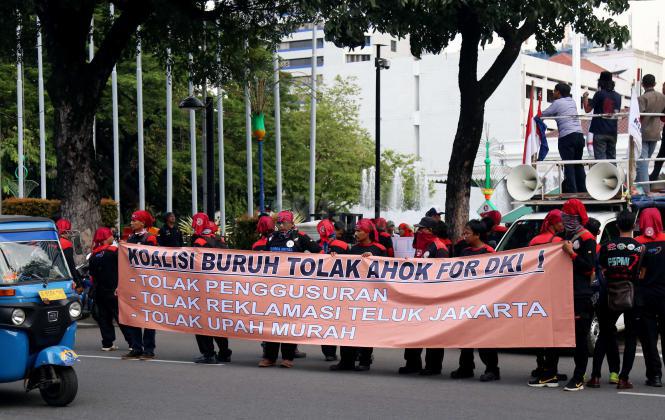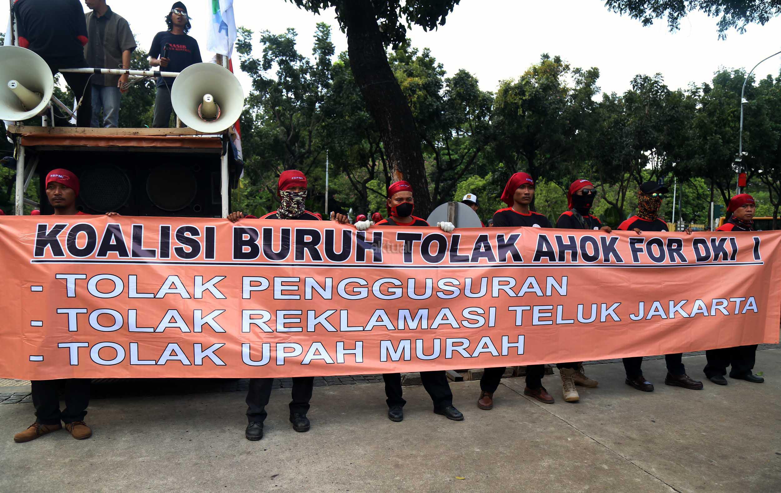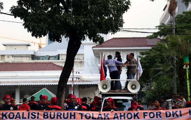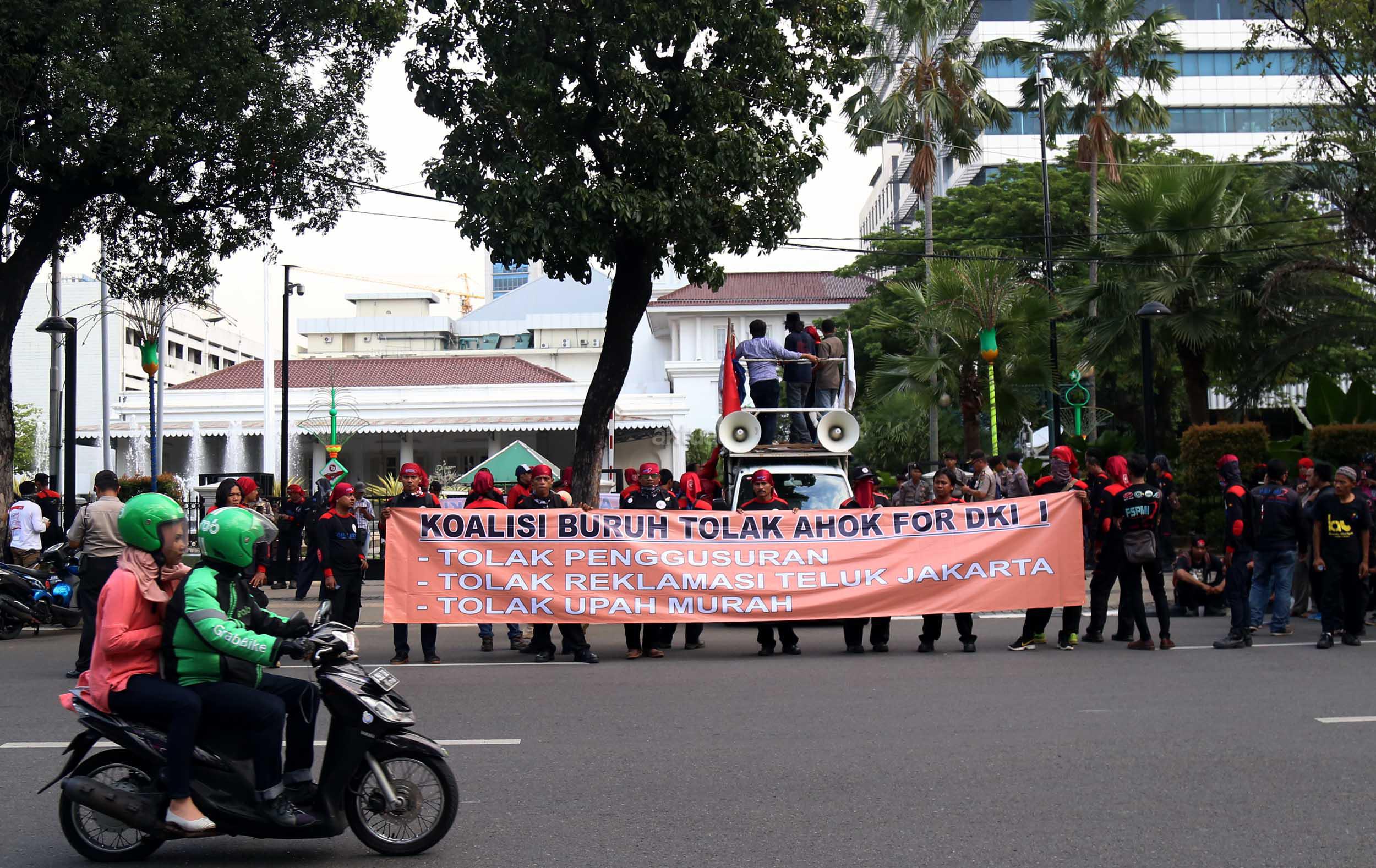 Ratusan buruh dari berbagai elemen yang tergabung dalam Koalisi Buruh Tolak Ahok For DKI melakukan aksi didepan Balai Kota, Jakarta, Kamis (14/4/2016). Dalam aksinya para buruh Koalisi Buruh Tolak Ahok For DKI menolak majunya Gubernur DKI Jakarta Basuki Tjahaja Purnama (Ahok),menolak segala bentuk penggusuran dan menolak Reklamasi Teluk Jakarta.