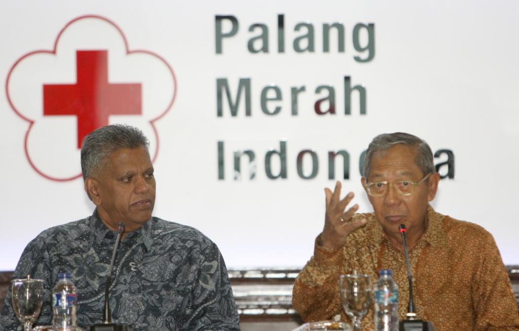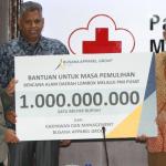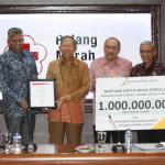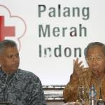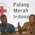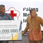 Pelaksana Harian Ketua Umum PMI Ginandjar Kartasasmita (kanan) dan Chairman dan CEO Busana Apparel Group Maniwanen (kiri) saat menyerahkan donasi untuk masa pemulihan Lombok ke PMI di Jakarta, Kamis (20/9/2018). Busana Apparel Group menyalurkan bantuan dana sebesar Rp 1.000.000.0000 untuk masa pemulihan masyarakat Lombok dan daerah sekitarnya di Provinsi NTB pasca gempa bumi melalui Palang Merah Indonesia. AKTUAL/Tino Oktaviano