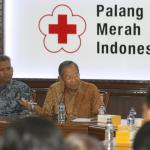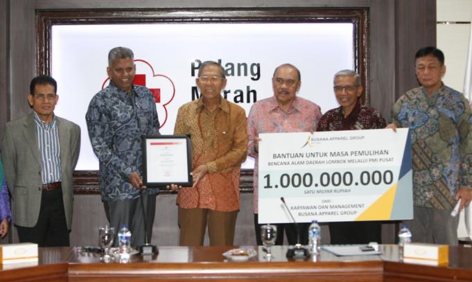 Pelaksana Harian Ketua Umum PMI Ginandjar Kartasasmita (ketiga kanan) dan Chairman dan CEO Busana Apparel Group Maniwanen (kedua kiri) saat menyerahkan donasi untuk masa pemulihan Lombok ke PMI di Jakarta, Kamis (20/9/2018). Busana Apparel Group menyalurkan bantuan dana sebesar Rp 1.000.000.0000 untuk masa pemulihan masyarakat Lombok dan daerah sekitarnya di Provinsi NTB pasca gempa bumi melalui Palang Merah Indonesia. AKTUAL/Tino Oktaviano