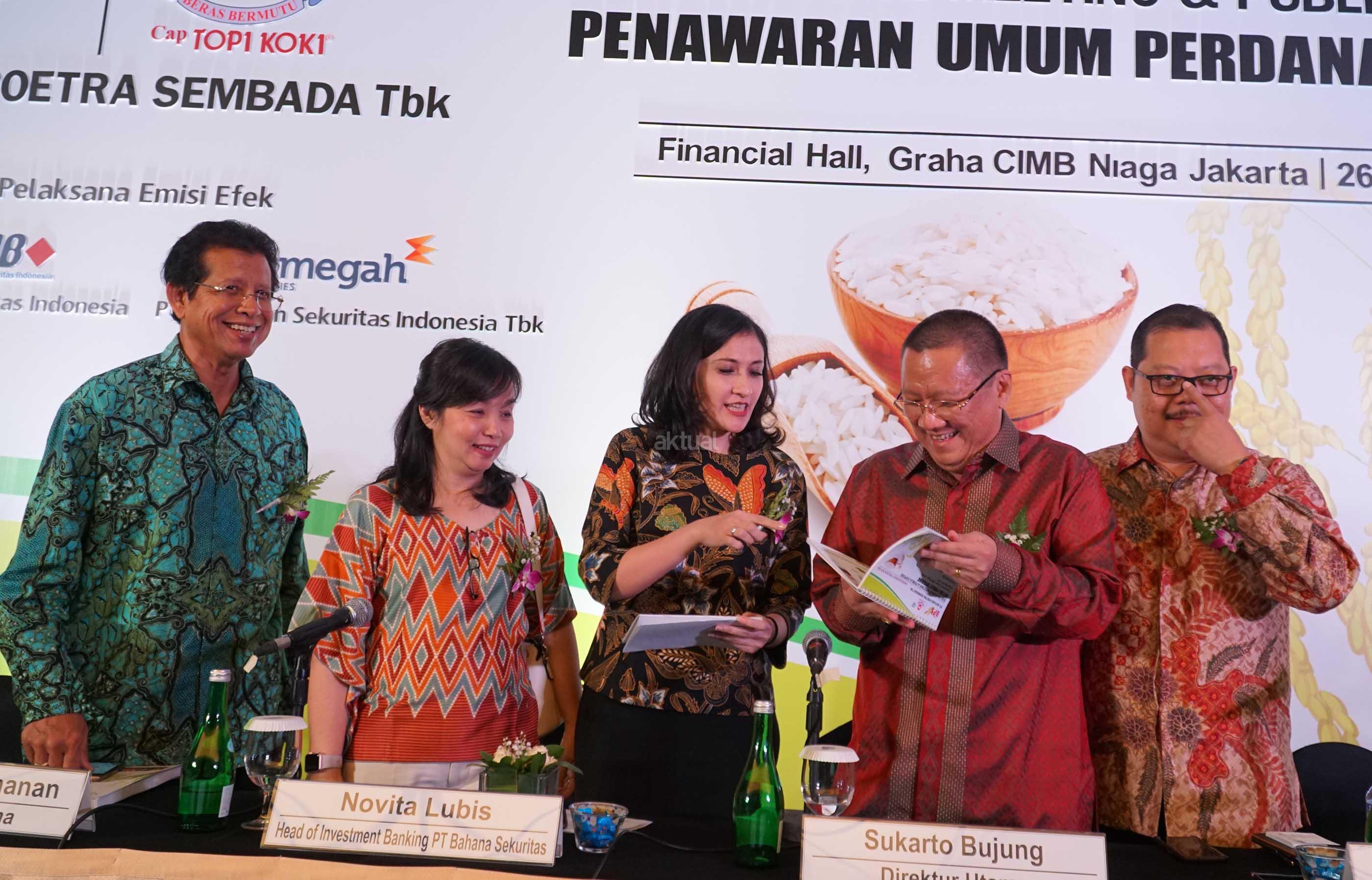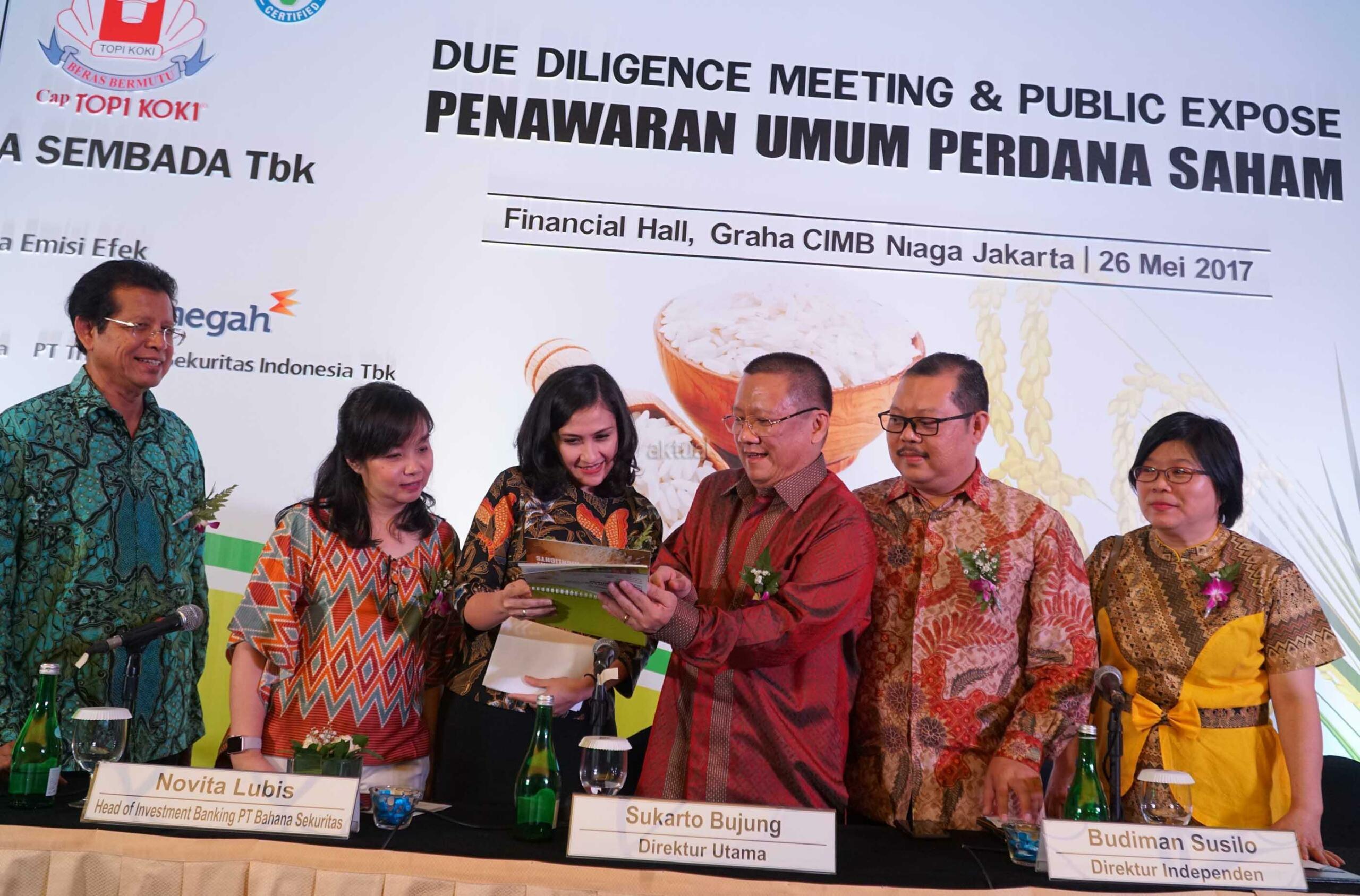 (dari kiri ke kanan) Komisaris Utama PT Buyung Poetra Sembada (BPS), Jonathan Jochanan, Komisaris, Elly Tjandra, Head of Investment Banking PT Bahana Sekuritas, Novita Lubis,Direktur Utama, Sukarto Bujung,Direktur Independen, Budiman Susilo serta Direktur, Muliati berbincang seusai penawaran umum perdana saham ke publik di Jakarta, Jumat (26/5). Perusahaan yang memproduksi dan mendistribusi beras dengan merek utama Topi Koki akan mencatatatkan sahamnya pada Juni 2017 mendatang. BPS telah membuktikan pencapaian kinerja fundamental yang baik dengan pencapaian penjualan per 31 Desember 2016 sebesar Rp 1,147 triliun, atau meningkat 74% dari Rp 658 miliar apada akhir tahun 2015. Jumlah saham yang akan ditawarkan sebanyak 700 juta lemvar saham baru yang merupakan saham biasa atas nama, atau sebesar 29,79% dari modal ditempatkan dan disetor setelah penawaran umum saham dengan nilai nominal Rp 100 per saham.Bersamaan dengan itu juga BPS menawarkan sebanyak banyaknya 70 juta Waran Seri I yang menyertai Saham Biasa Atas nama atau sekitar 3% dari Modal ditempatkan dan disetor penuh sehingga akan menambah nilai tambah bagi para investor di masa mendatang. AKTUAL/Eko S Hilman