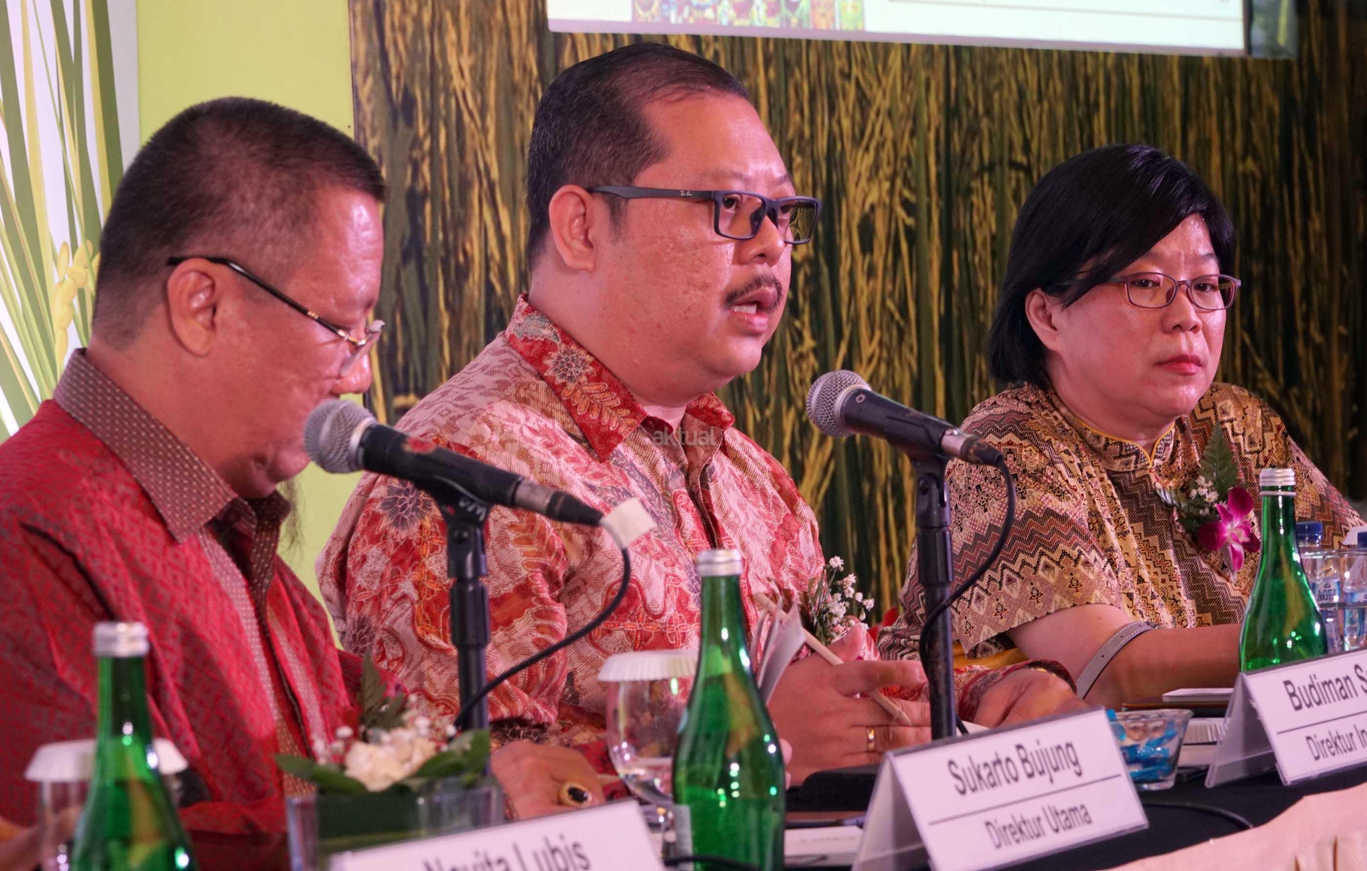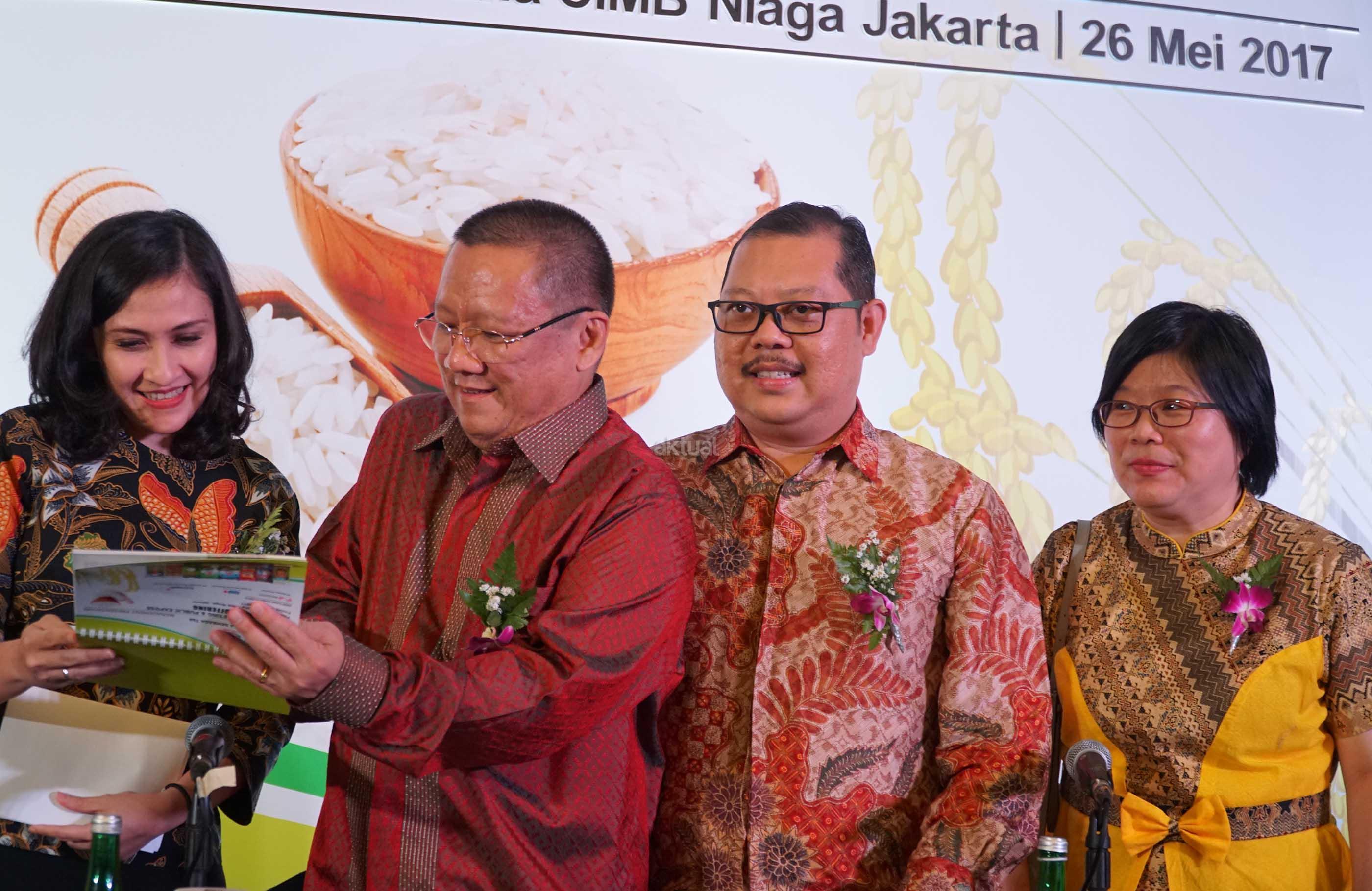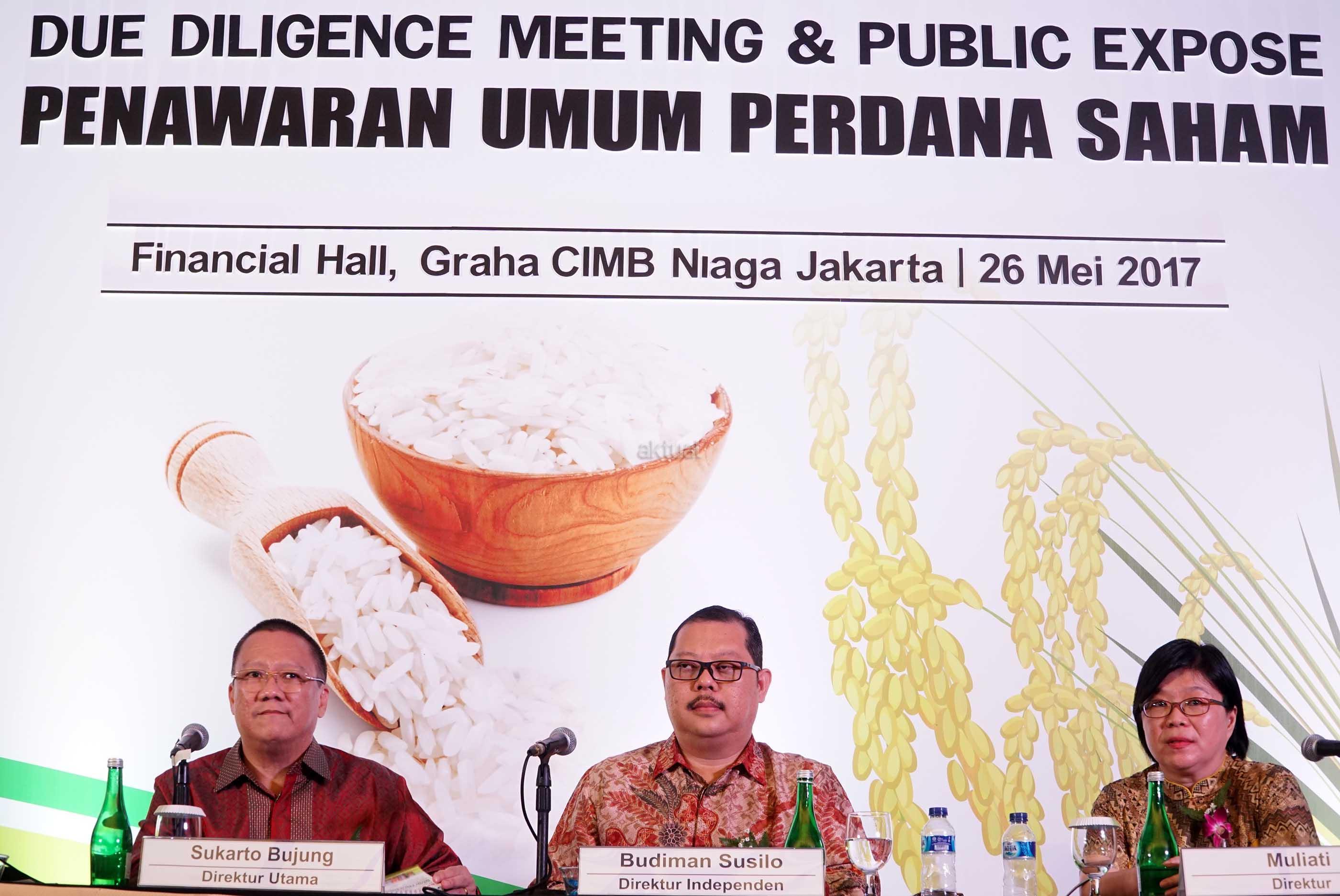 Direktur Utama PT Buyung Poetra Sembada (BPS), Sukarto Bujung (kiri) didampingi Direktur Independen, Budiman Susilo (tengah) dan Direktur, Muliati saat memberikan keterangan pers seusai penawaran umum perdana saham ke publik di Jakarta, Jumat (26/5). Perusahaan yang memproduksi dan mendistribusi beras dengan merek utama Topi Koki akan mencatatatkan sahamnya pada Juni 2017 mendatang. BPS telah membuktikan pencapaian kinerja fundamental yang baik dengan pencapaian penjualan per 31 Desember 2016 sebesar Rp 1,147 triliun, atau meningkat 74% dari Rp 658 miliar apada akhir tahun 2015. Jumlah saham yang akan ditawarkan sebanyak 700 juta lemvar saham baru yang merupakan saham biasa atas nama, atau sebesar 29,79% dari modal ditempatkan dan disetor setelah penawaran umum saham dengan nilai nominal Rp 100 per saham.Bersamaan dengan itu juga BPS menawarkan sebanyak banyaknya 70 juta Waran Seri I yang menyertai Saham Biasa Atas nama atau sekitar 3% dari Modal ditempatkan dan disetor penuh sehingga akan menambah nilai tambah bagi para investor di masa mendatang. AKTUAL/Eko S Hilman