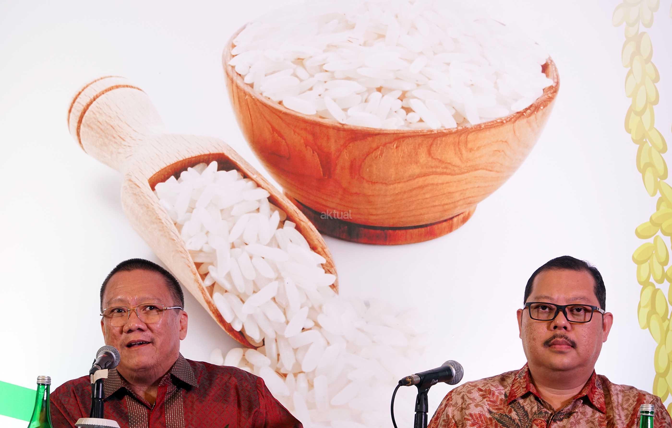 Direktur Utama PT Buyung Poetra Sembada (BPS), Sukarto Bujung (kiri) didampingi Direktur Independen, Budiman Susilo saat memberikan keterangan pers seusai penawaran umum perdana saham ke publik di Jakarta, Jumat (26/5). Perusahaan yang memproduksi dan mendistribusi beras dengan merek utama Topi Koki akan mencatatatkan sahamnya pada Juni 2017 mendatang. BPS telah membuktikan pencapaian kinerja fundamental yang baik dengan pencapaian penjualan per 31 Desember 2016 sebesar Rp 1,147 triliun, atau meningkat 74% dari Rp 658 miliar apada akhir tahun 2015. Jumlah saham yang akan ditawarkan sebanyak 700 juta lemvar saham baru yang merupakan saham biasa atas nama, atau sebesar 29,79% dari modal ditempatkan dan disetor setelah penawaran umum saham dengan nilai nominal Rp 100 per saham.Bersamaan dengan itu juga BPS menawarkan sebanyak banyaknya 70 juta Waran Seri I yang menyertai Saham Biasa Atas nama atau sekitar 3% dari Modal ditempatkan dan disetor penuh sehingga akan menambah nilai tambah bagi para investor di masa mendatang. AKTUAL/Eko S Hilman