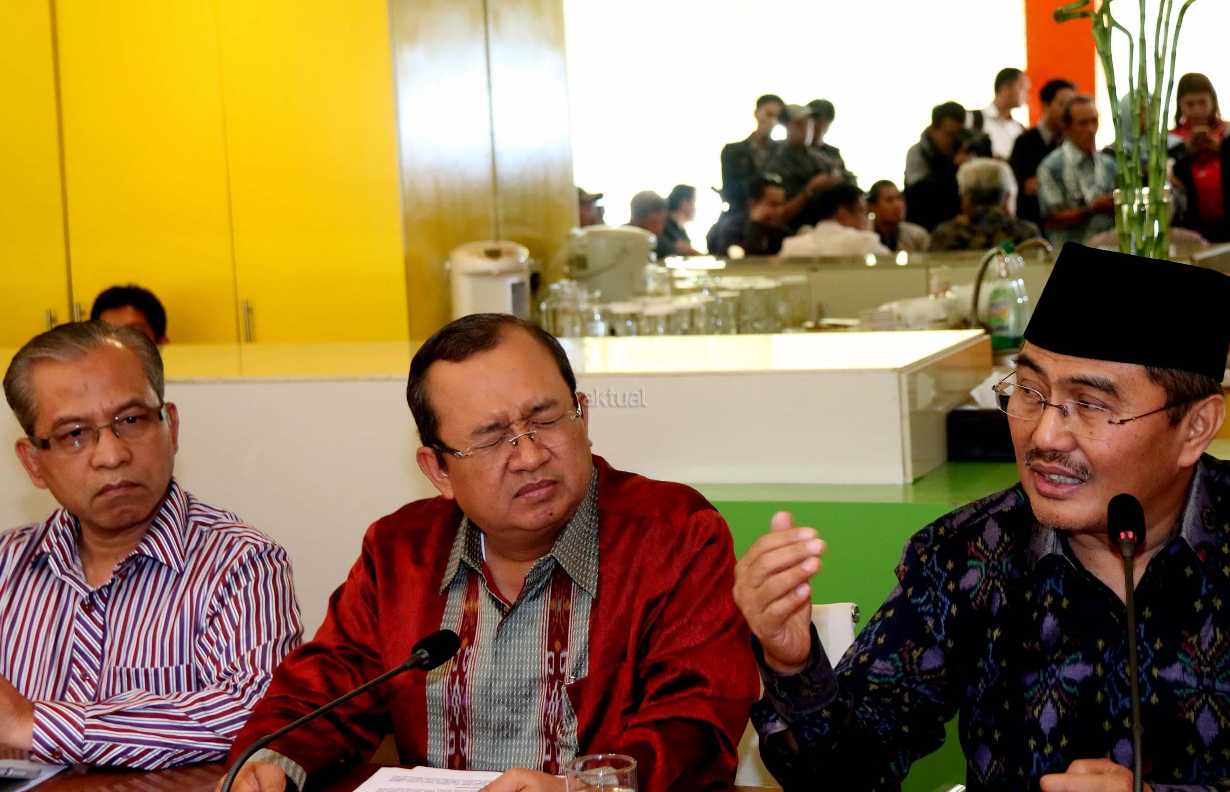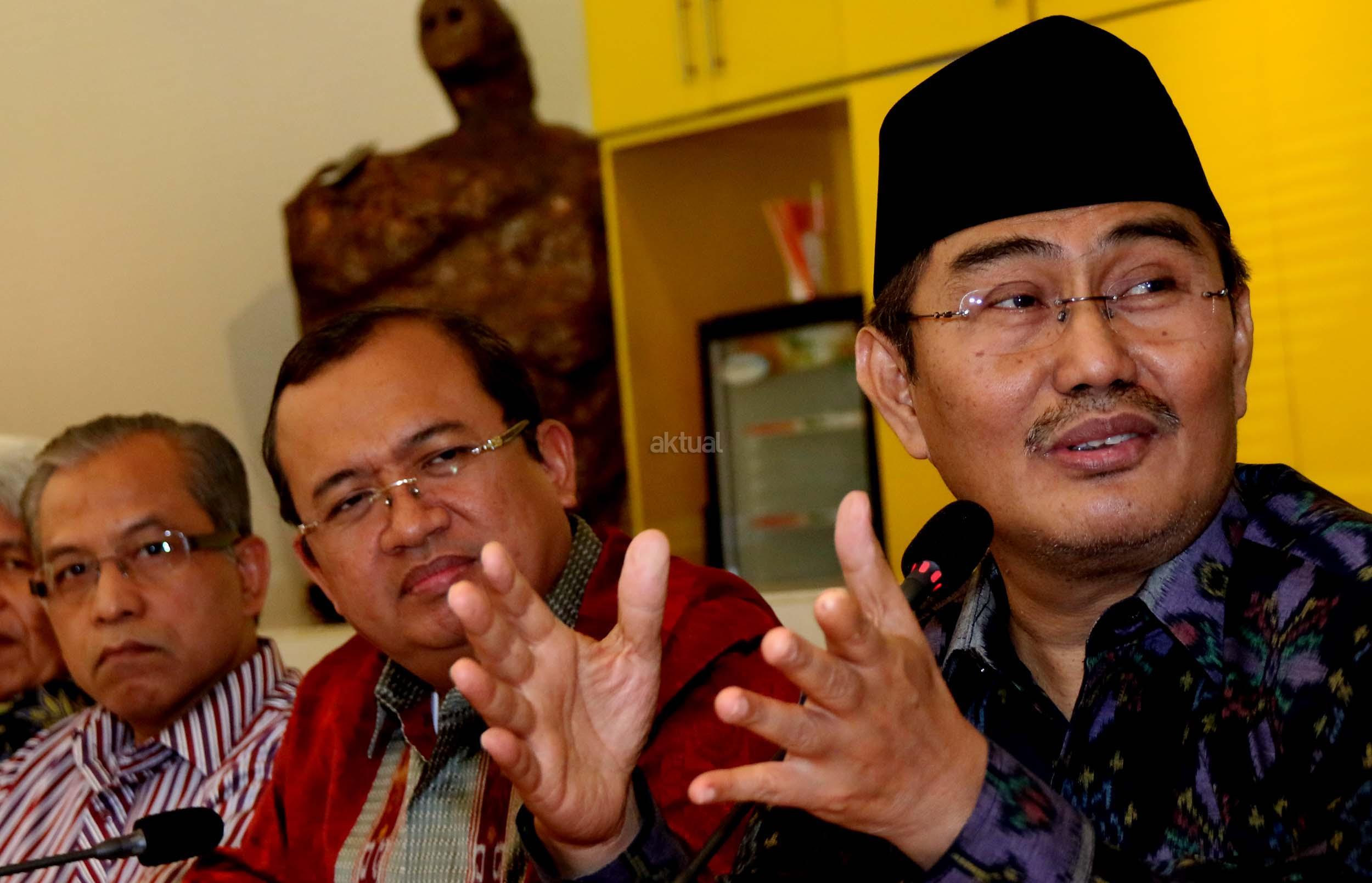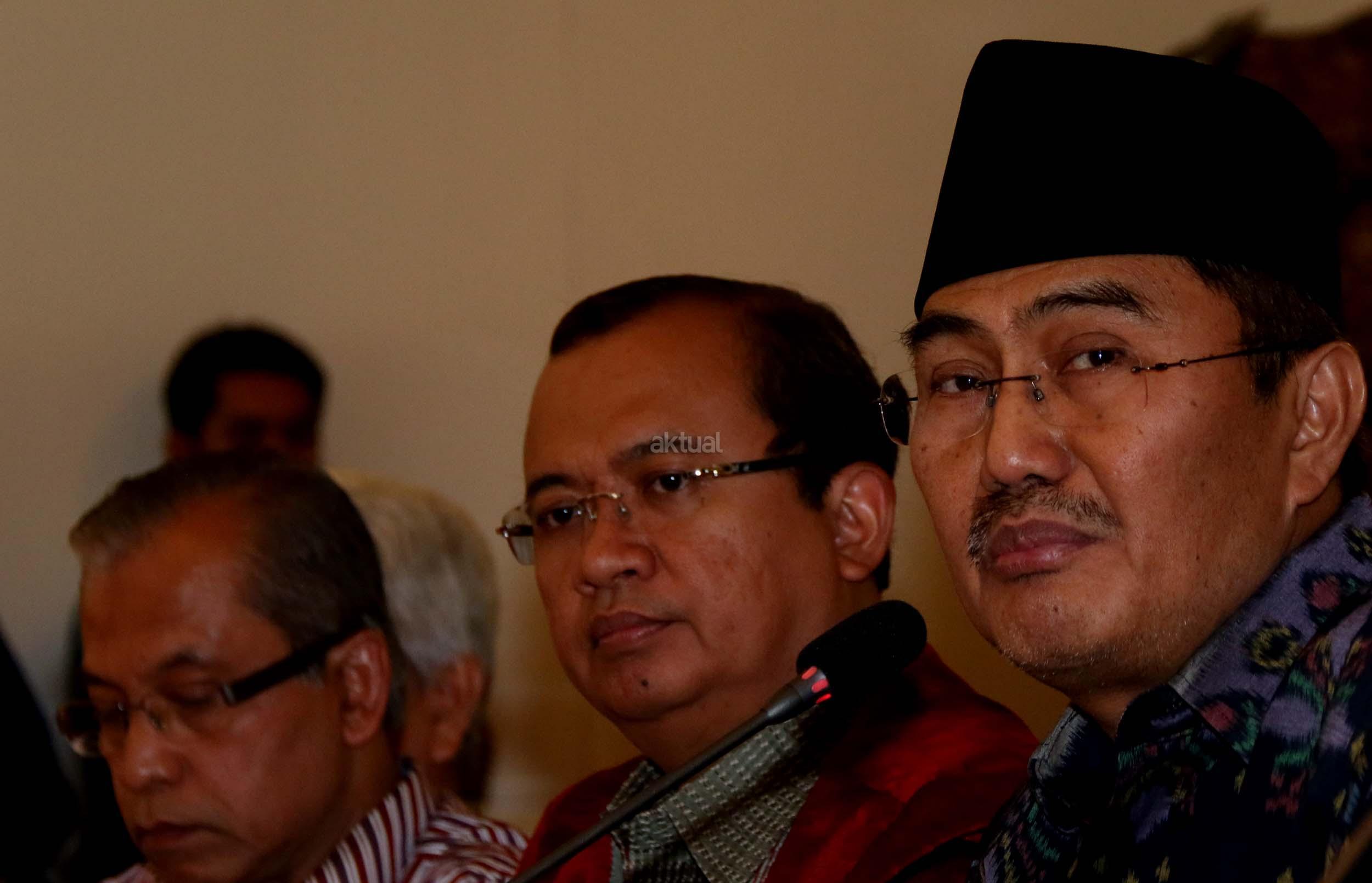 Ketua Umum Ikatan Cendekiawan Muslim se-Indonesia (ICMI) Jimly Asshiddiqie (kanan) saat memberikan keterangan persnya terkait reflesi ICMI yang terjadi di Indonesia pada tahun 2016 di kantor ICMI, Jakarta, Selasa (3/1/2017). Dalam jumpa persnya ICMI menyikapi beberapa hal yang terjadi di Indonesia selama tahun 2016 dan dalam rangka menyongsong program ICMI di tahun 2017. AKTUAL/Munzir