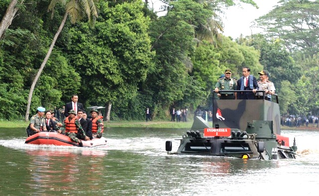 Jakarta, Aktual.Com-Disela-sela kunjungannya menghadiri Rapat Pimpinan (Rapim) TNI 2017 di Gedung Gatot Subroto, Markas Besar TNI Cilangkap Jakarta, Senin (16/1/2017), Presiden Joko Widodo (Jokowi) berkesempatan menaiki panser Anoa Amphibi yang diproduksi anak bangsa, PT Pindad sebelum acara dimulai.