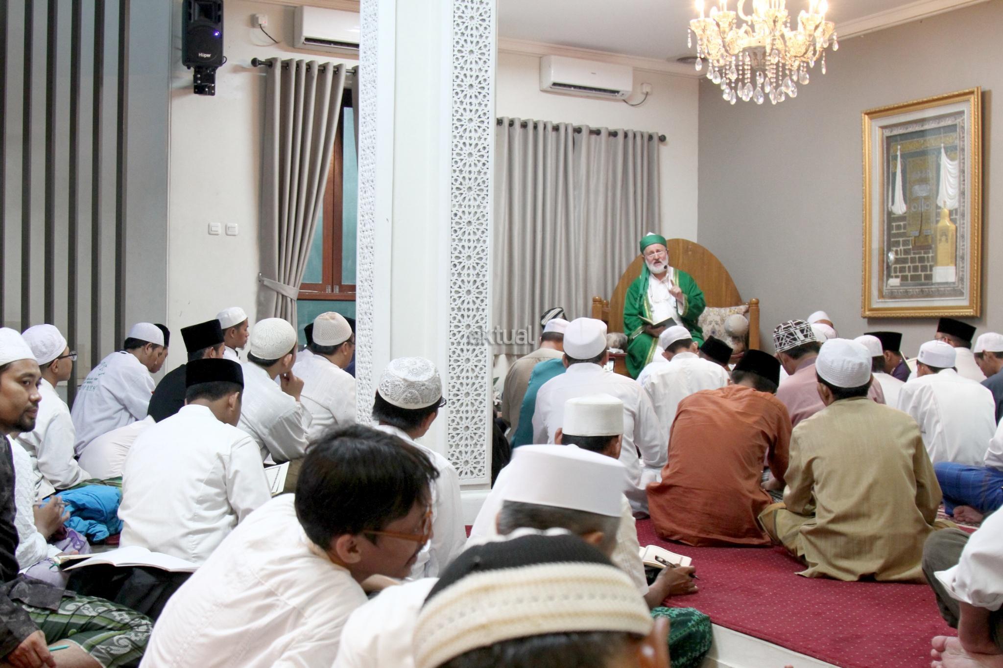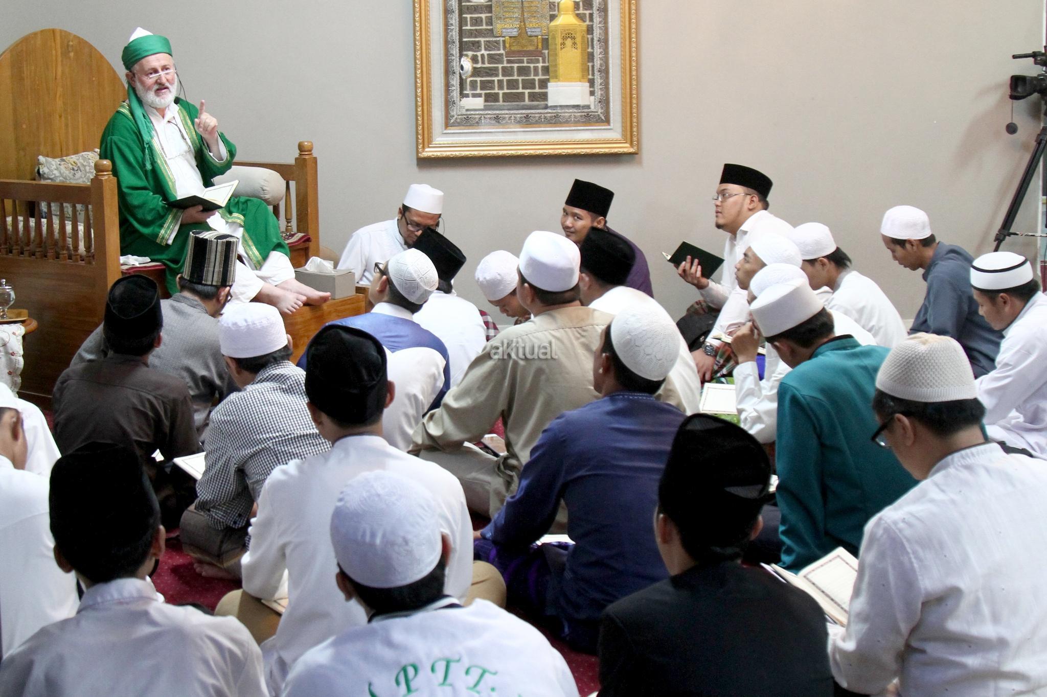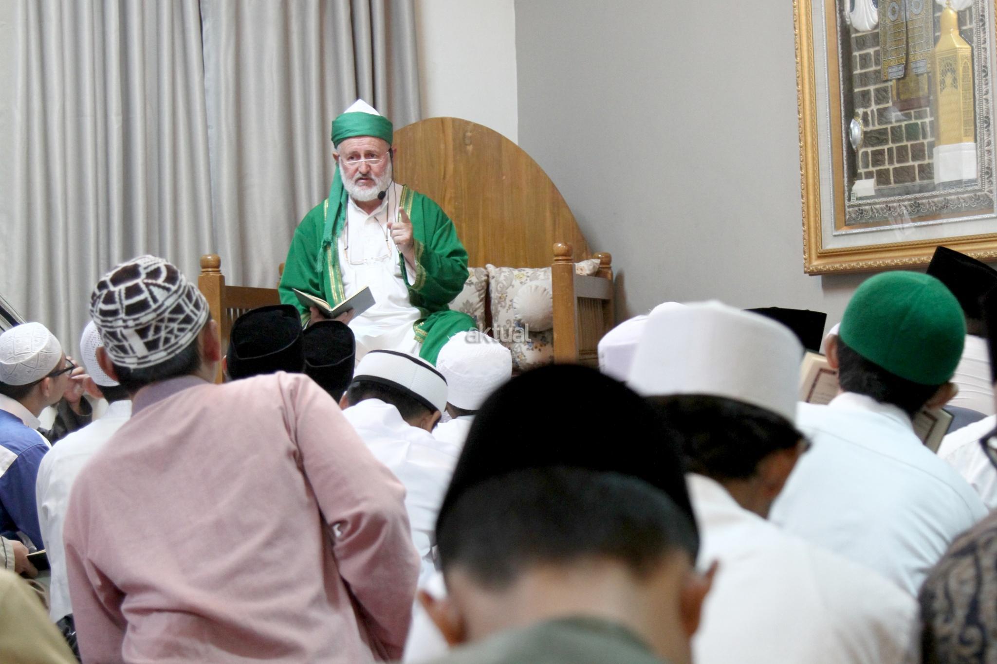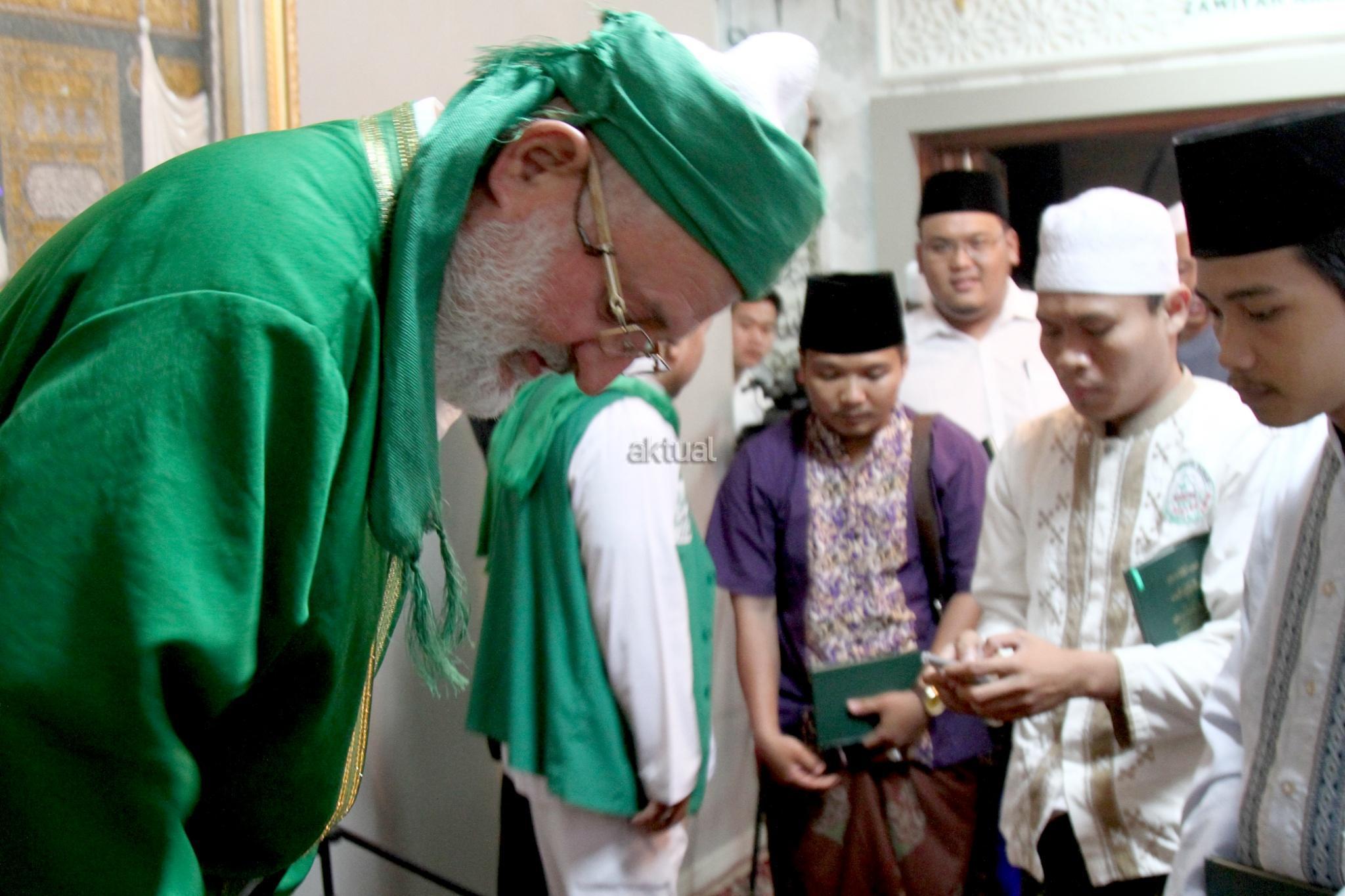 Maulana Syekh Sayyid Prof. Dr. Muhammad Fadhil al-Jailani al-Hasani al-Husaini Hafidzahullah, Cicit Sulthonul Auliya Syekh Abdul Qadir al-Jailani ke 25 dari Turki disambut jamaah sebelum mengupas Kitab “Dzikru al – Maqomat” Karya Sulthonul Auliya Syekh Abdul Qadir al-Jailani di Zawiyah Arraudhah, Jakarta, Jumat (15/9). Dalam kesempatan tersebut Prof. Dr. Syekh Fadhil Al-Jailani mengajak umat Islam untuk bertasawuf secara hakiki (berdasarkan Alquran dan Sunnah). AKTUAL/Tino Oktaviano