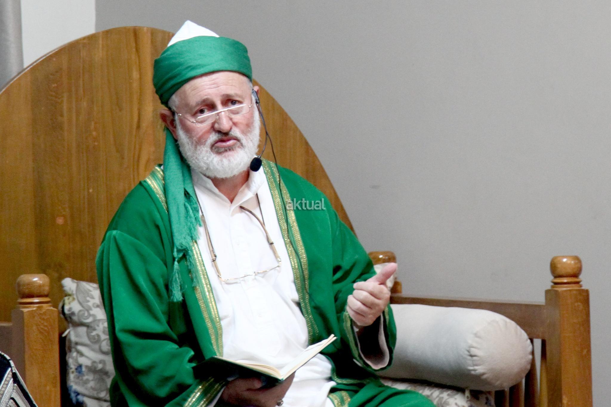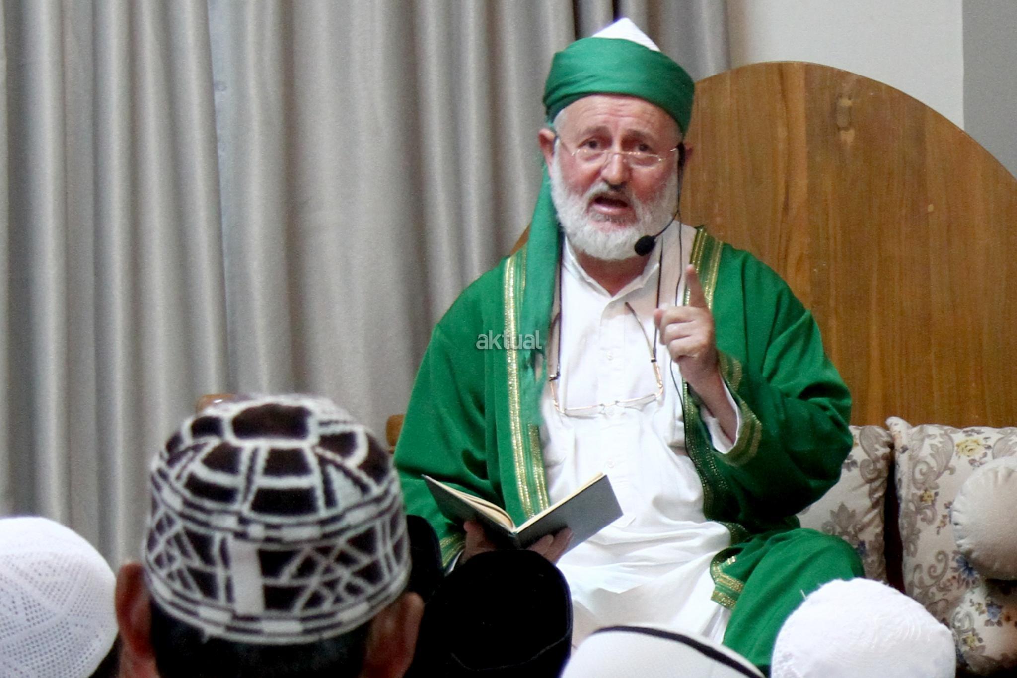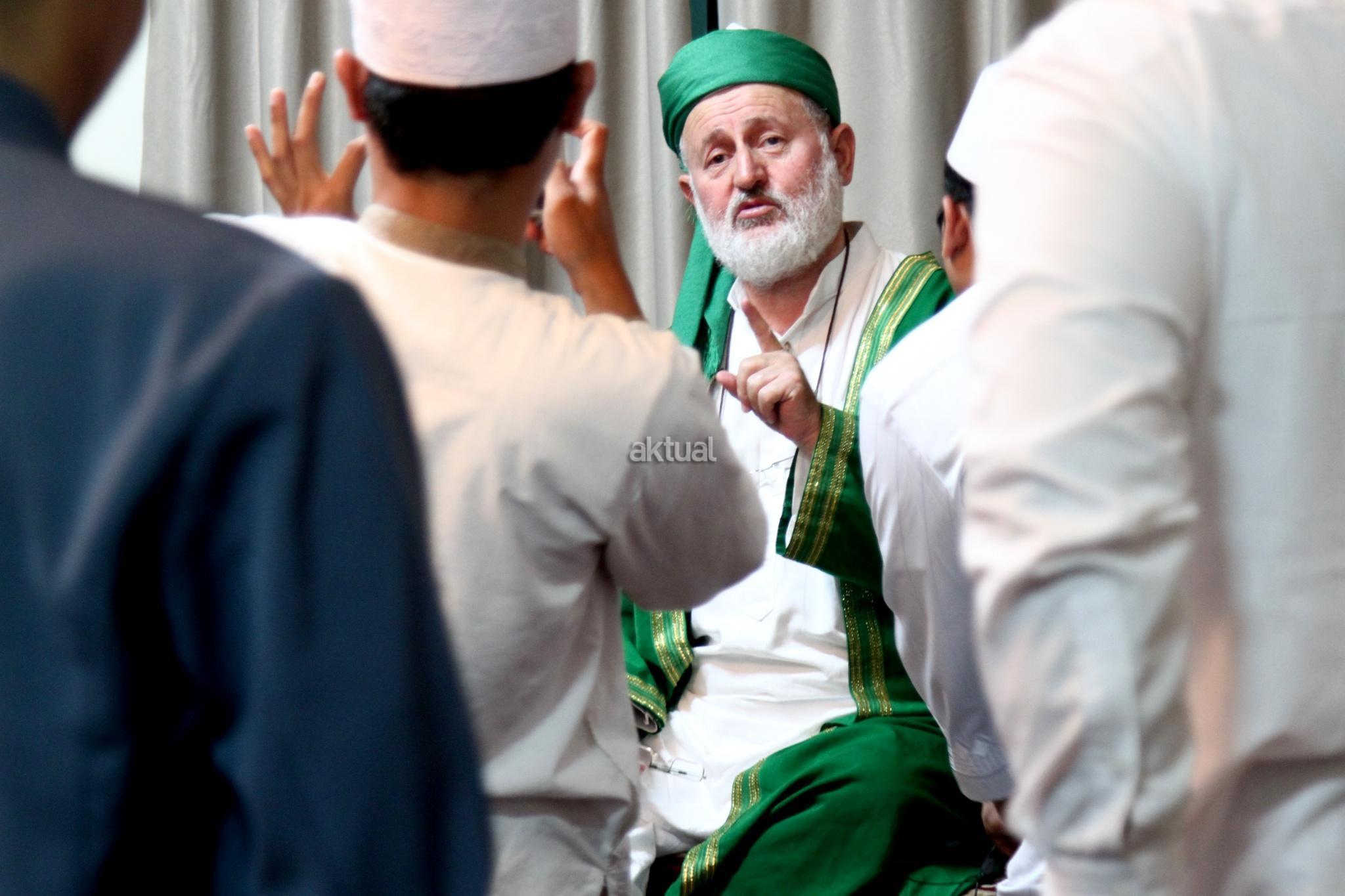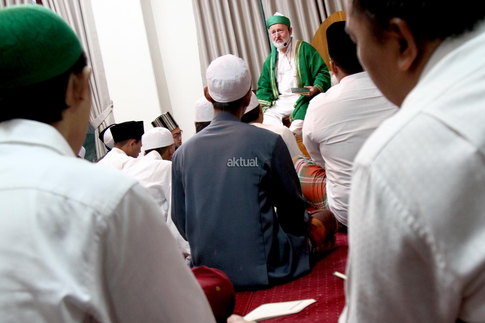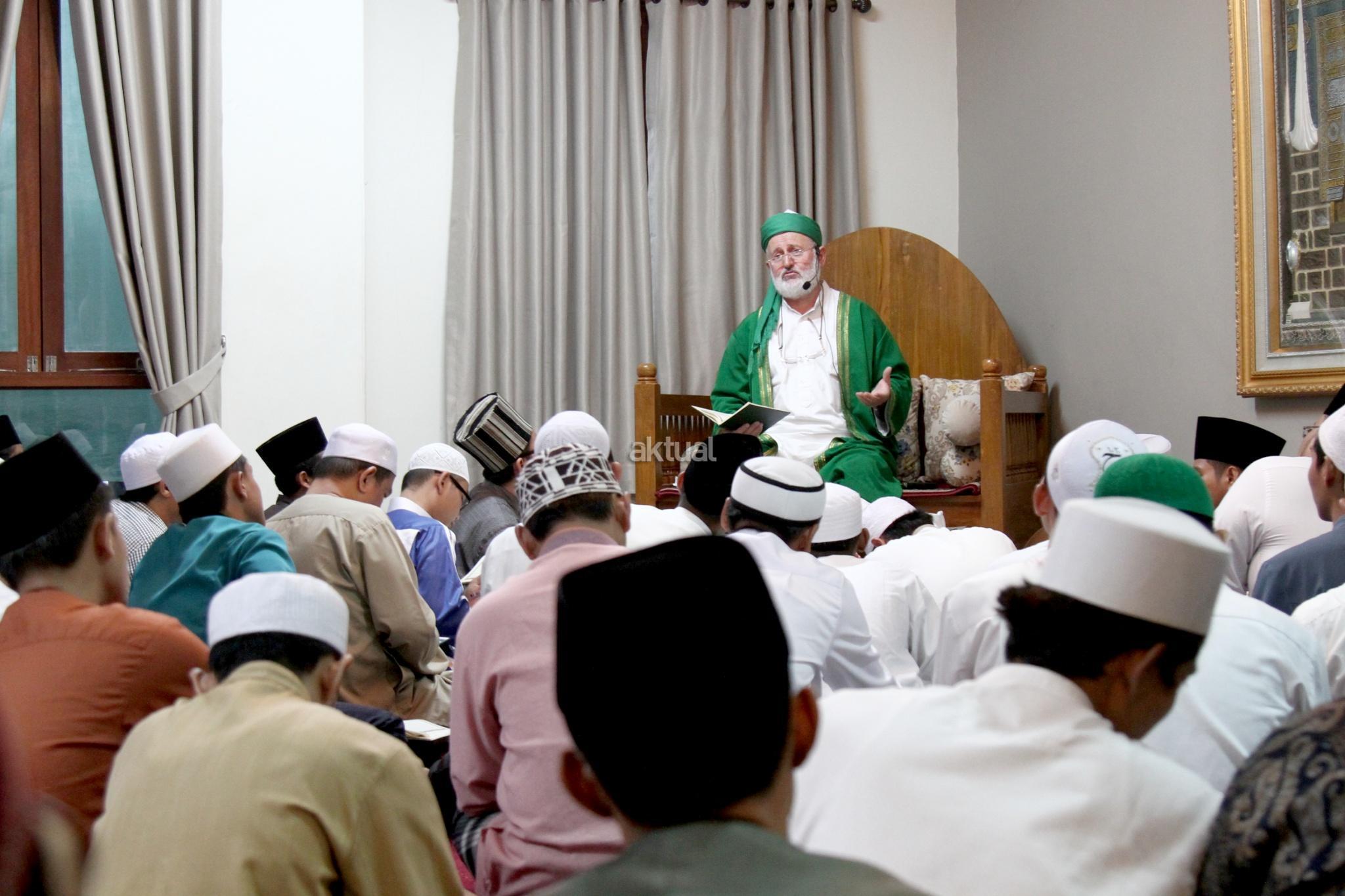 Maulana Syekh Sayyid Prof. Dr. Muhammad Fadhil al-Jailani al-Hasani al-Husaini Hafidzahullah, Cicit Sulthonul Auliya Syekh Abdul Qadir al-Jailani ke 25 dari Turki disambut jamaah sebelum mengupas Kitab “Dzikru al – Maqomat” Karya Sulthonul Auliya Syekh Abdul Qadir al-Jailani di Zawiyah Arraudhah, Jakarta, Jumat (15/9). Dalam kesempatan tersebut Prof. Dr. Syekh Fadhil Al-Jailani mengajak umat Islam untuk bertasawuf secara hakiki (berdasarkan Alquran dan Sunnah). AKTUAL/Tino Oktaviano