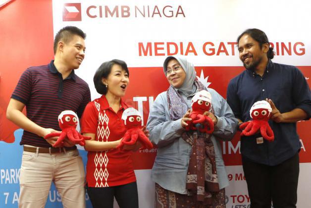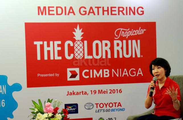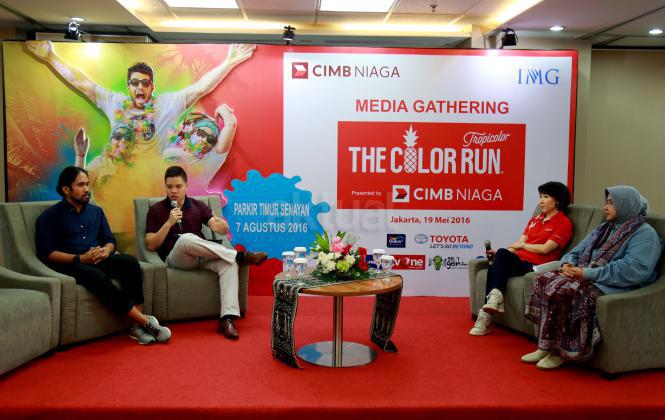Direktur PT Bank CIMB Niaga Tbk Vera Handajadi (kanan) bersama Sales Manager IMG Darrel Lin, Wakil Ketua Yayasan Onkologi Anak Indonesia (YOAI) Retno Soeastomo Supardji, Pesonil Alexa Band Fajar Arifan saat media gathering The Color Run Presented by CIMB Niaga di Jakarta, Kamis (19/5/2016). CIMB Niaga akan menggelar color run pada 7 Agustus mendatang. Color run kali ini bertujuan mengajak masyarakat untuk peduli pada anak-anak penderita kanker dari keluarga tidak mampu. CIMB Niaga menggandeng Yayasan Onkologi Anak Indonesia untuk membantu memerangi dan menanggulangi kanker sejak dini. CIMB Niaga mendonasikan Rp150 juta untuk YOAI yang akan digunakan untuk berbagai kegiatan penanganan kanker anak di Indonesia. AKTUAL/TINO OKTAVIANO
