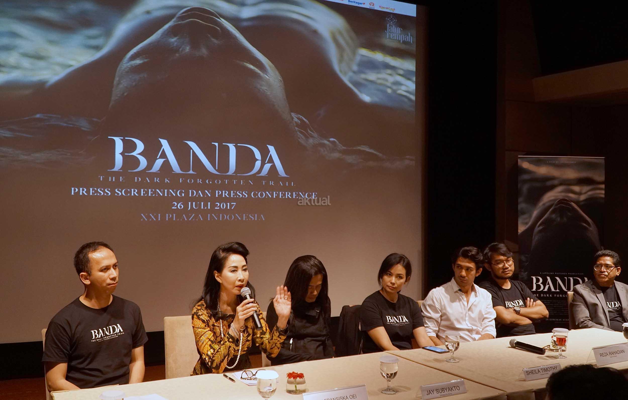 (dari kiri ke kanan) Voice Actor Banda The Dark Forgotten Trail, Reza Rahadian, Produser, Sheila Timothy, Direktur Compliance,Corporate Secretary and Legal CIMB Niaga, Fransiska Oei, serta Sutradara Banda The Dark Forgotten Trail,Jay Subyakto berbincang disela pemutaran perdana dan jumpa pers Film Dokumenter " Banda The dark Forgotten Trail" di Jakarta, Rabu (26/7). Persembahan dan dukungan CIMB Niaga dalam film tersebut dan seluruh rangkaian acara Jalur rempah sebagai wujud nyata dukungannya terhadap nilai nilai sejarah dan pengembangan budaya Indonesia. Sebagai institusi yang memiliki sejarah panjang dalam memenuhi kebutuhan perbankan masyarakat Indonesia.CIMB Niaga percaya bahwa dengan mengenal sejarah dan mengimplementasikan nilai nilai positif di dalamnya, kita dapat lebih menghargai pencapaian yang diraih sehaingga termotivasi menjadi lebih baik.Perseroan berkomitmen untuk selalu mendukung upaya upaya yang dilakukan demi kemajuan bangsa ini melalui inovasi yang terus dilakukan. AKTUAL/Eko S Hilman